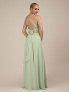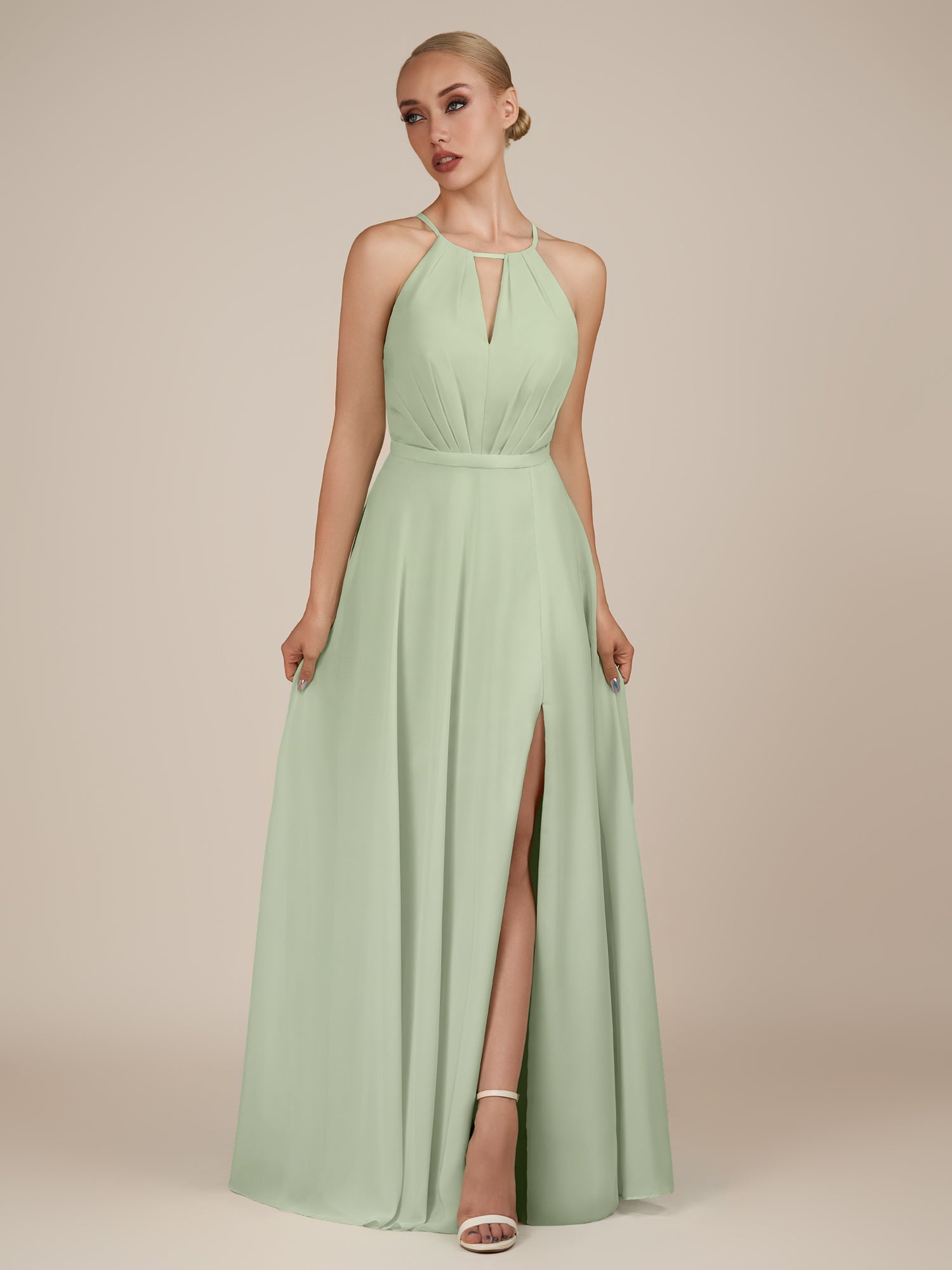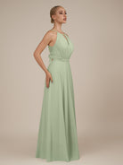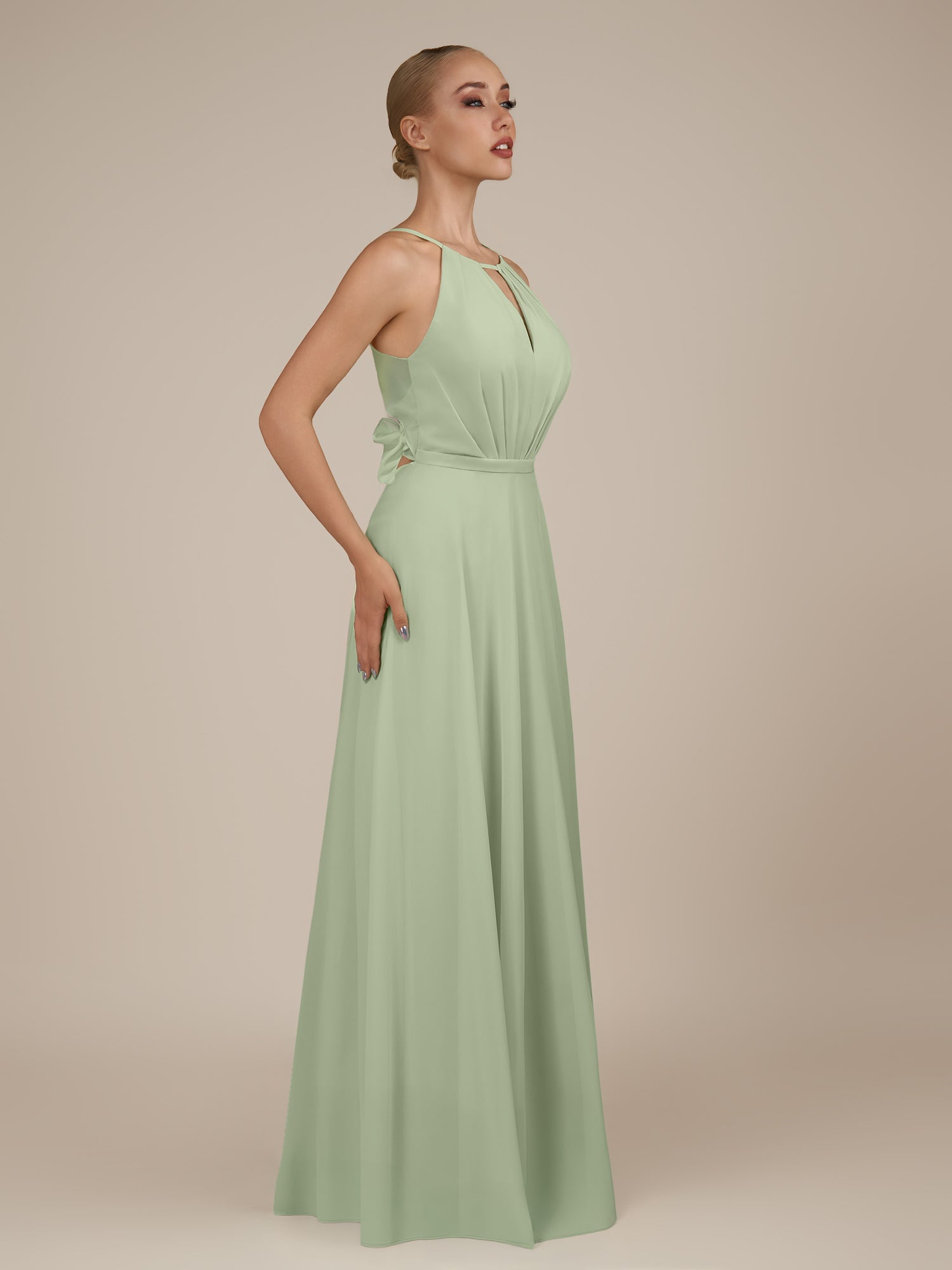 Illyria | Dusty Sage - A Line Chiffon Halter Neck Long Bridesmaid Dress with Cut Out