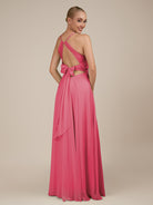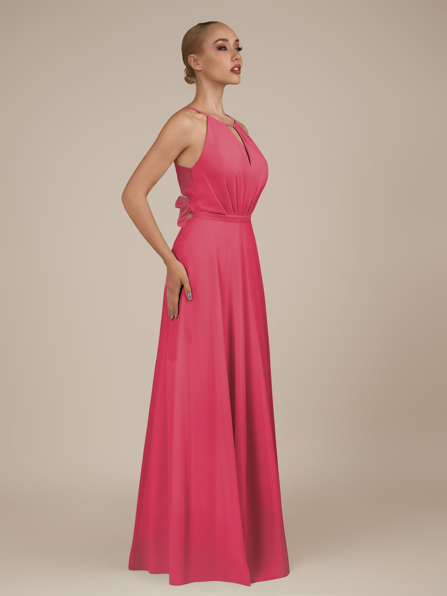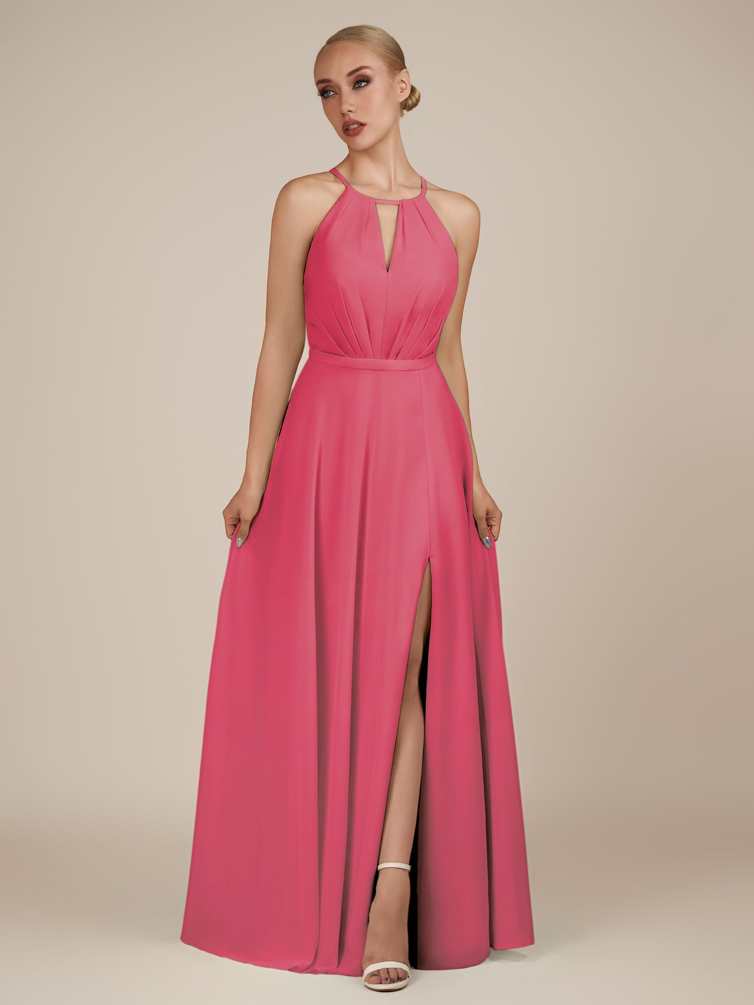 Illyria | Fuchsia - A Line Chiffon Halter Neck Long Bridesmaid Dress with Cut Out