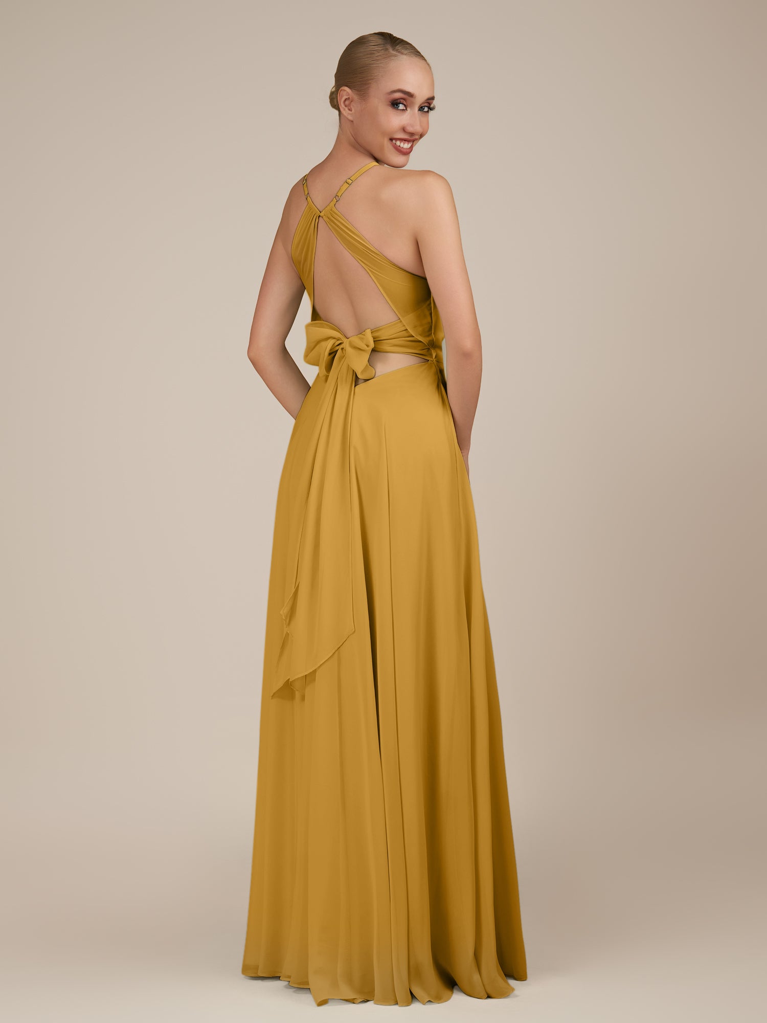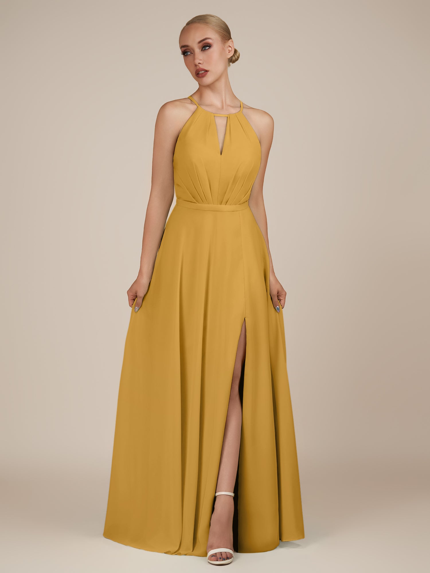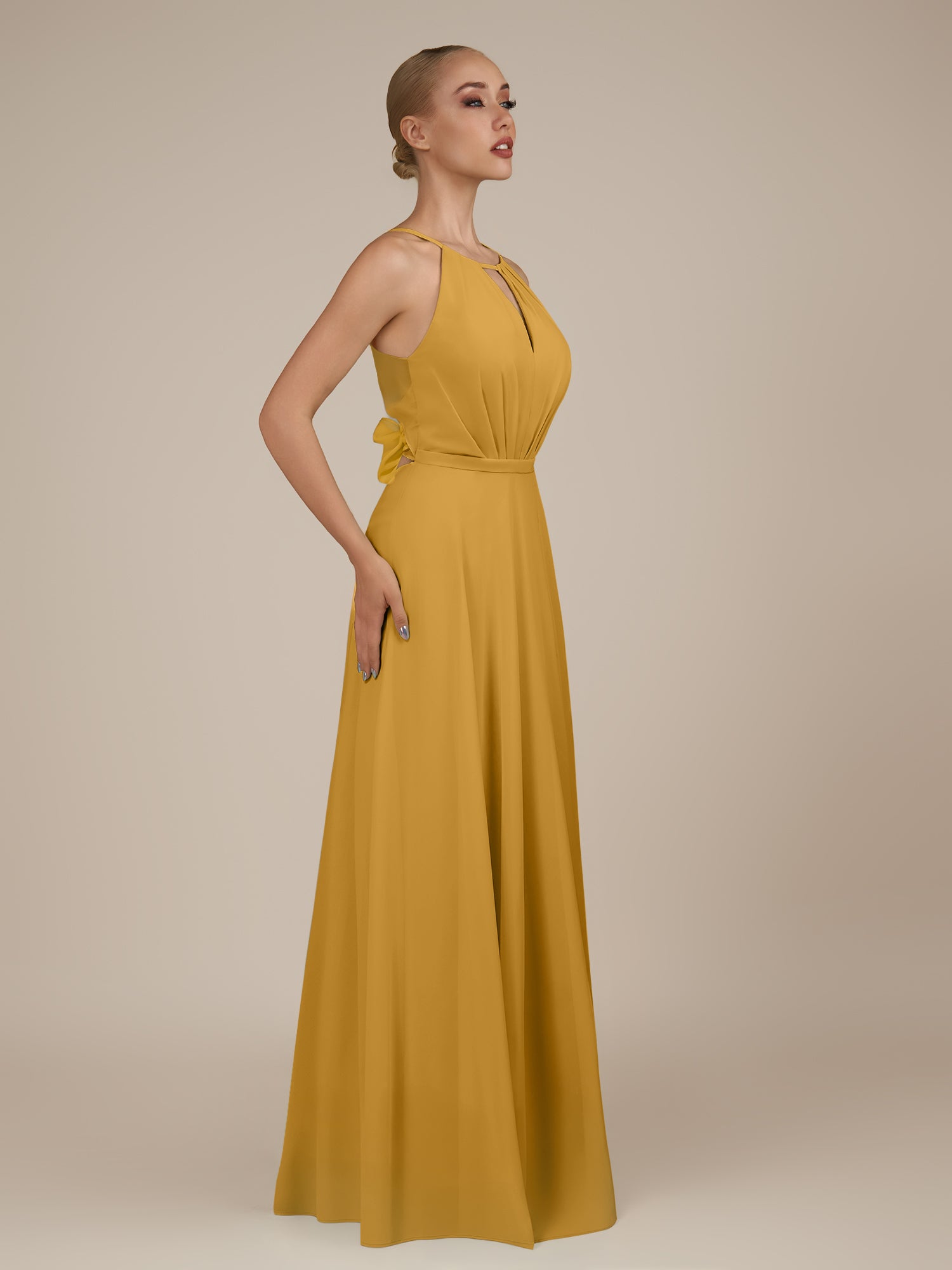 Illyria | Marigold - A Line Chiffon Halter Neck Long Bridesmaid Dress with Cut Out