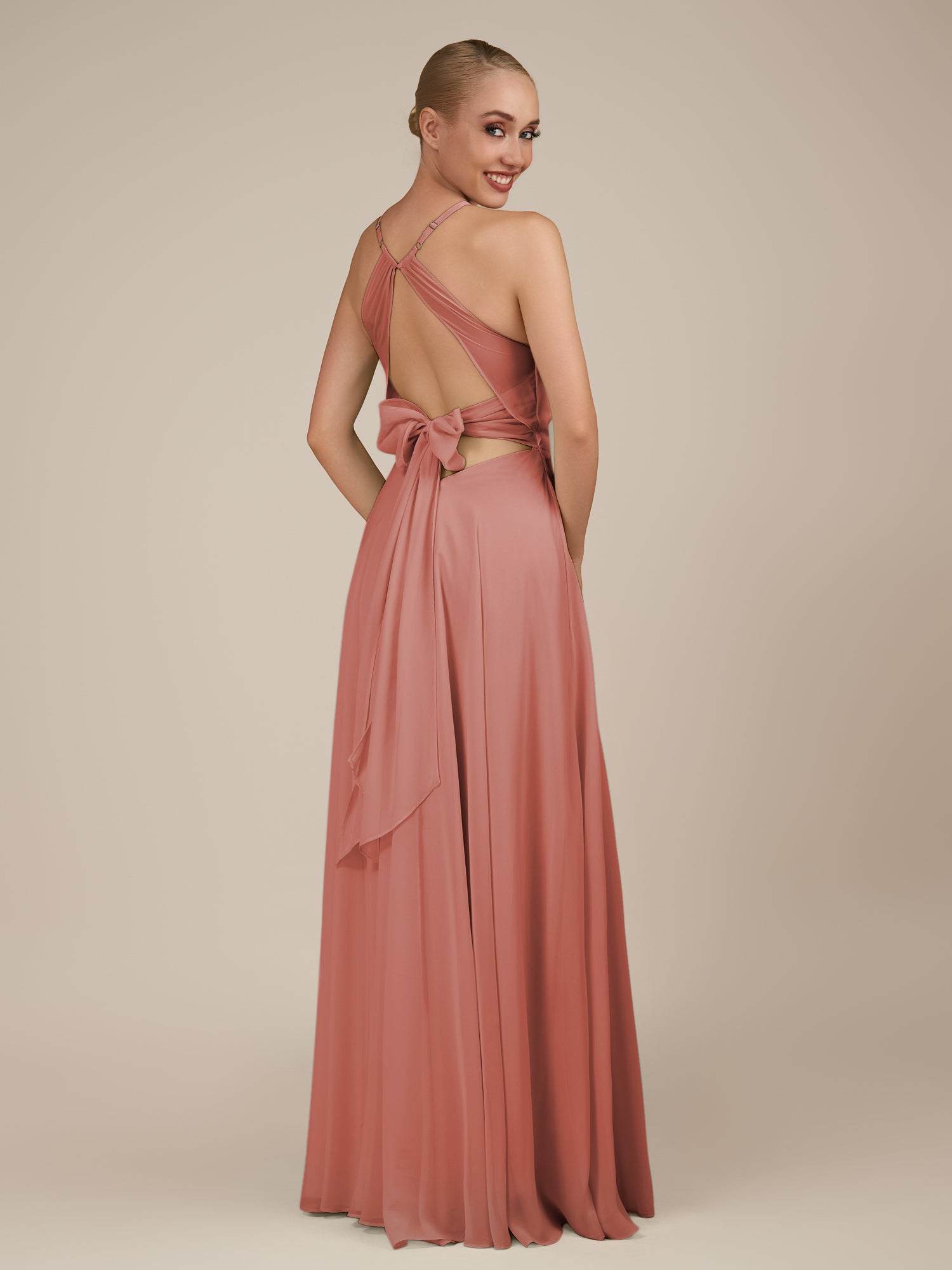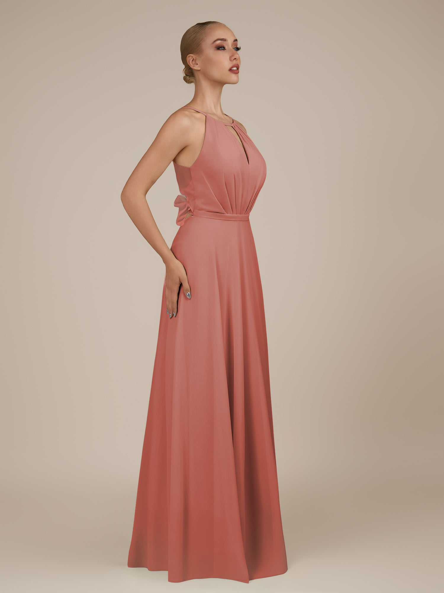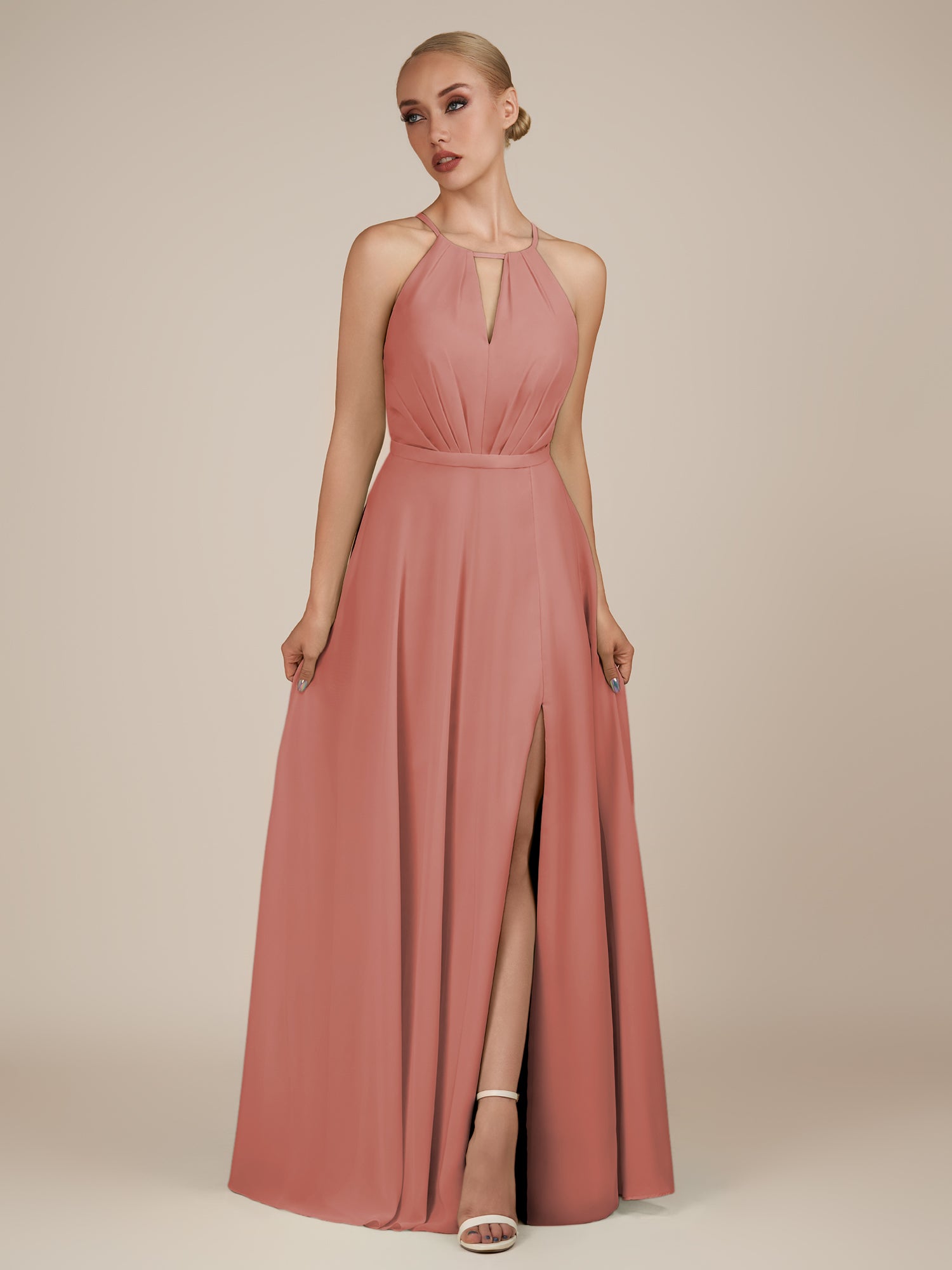 Illyria | Mulberry - A Line Chiffon Halter Neck Long Bridesmaid Dress with Cut Out