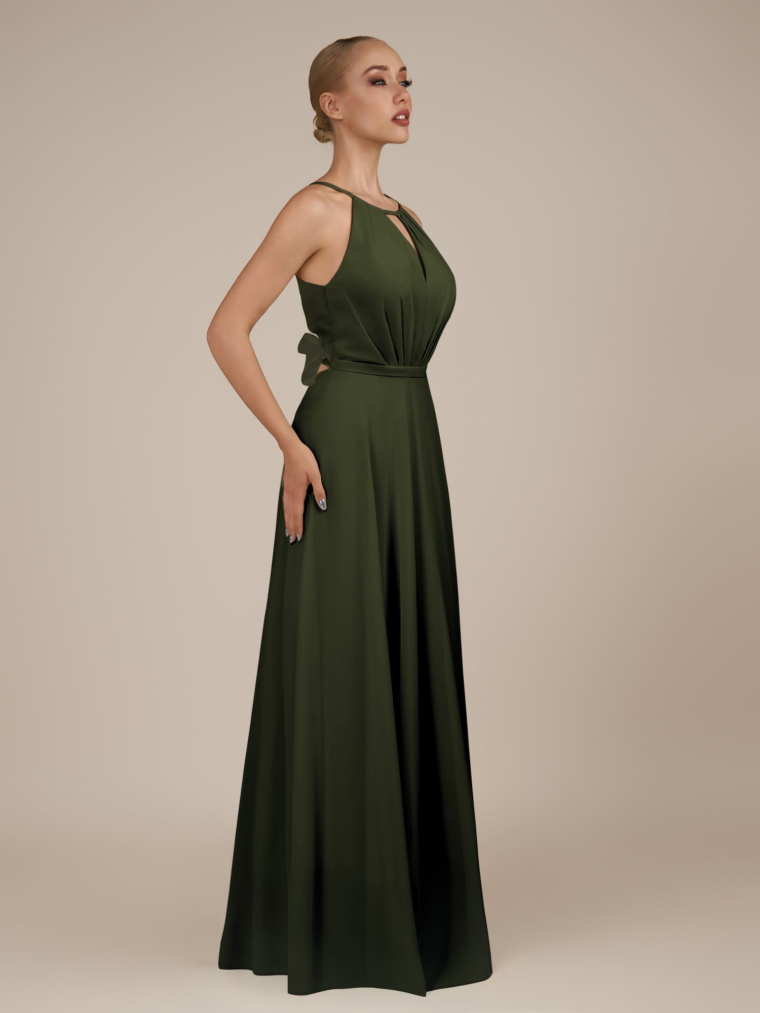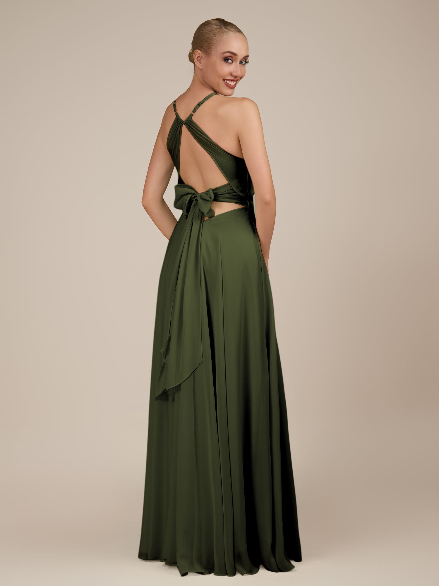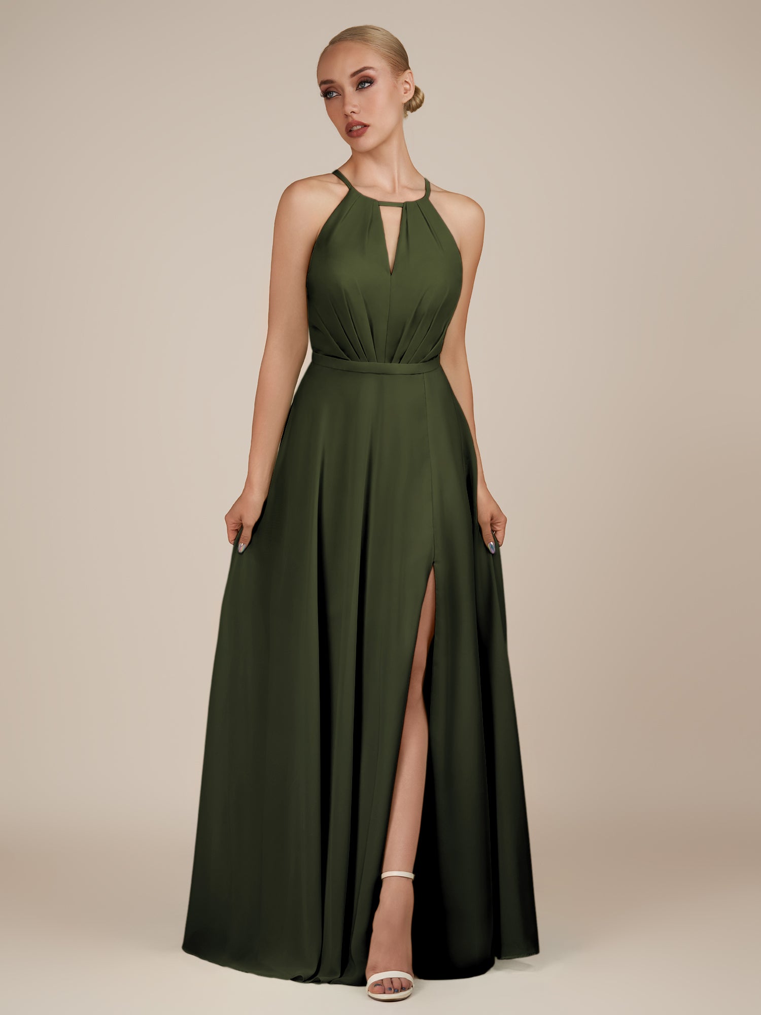 Illyria | Olive - A Line Chiffon Halter Neck Long Bridesmaid Dress with Cut Out