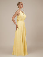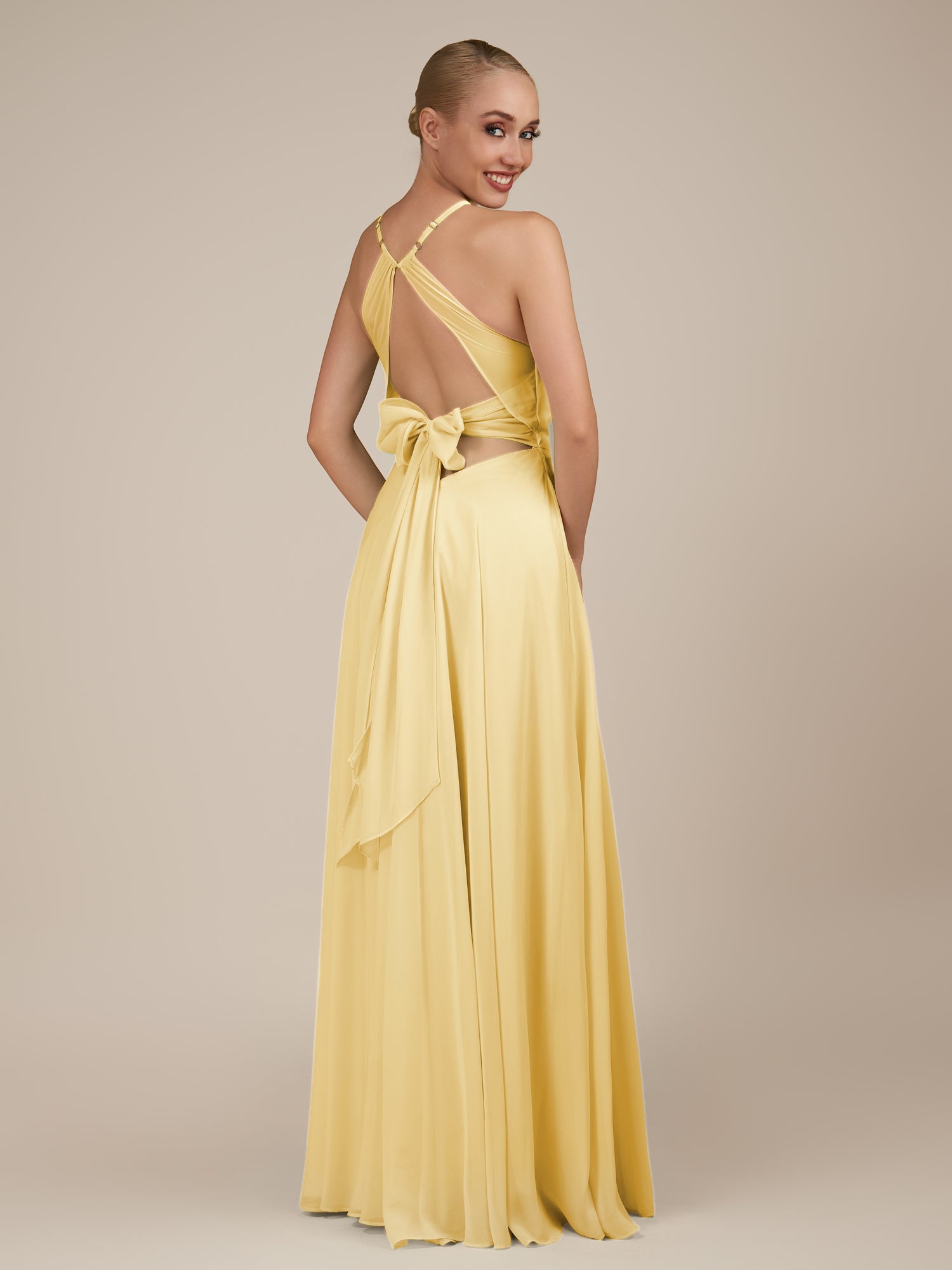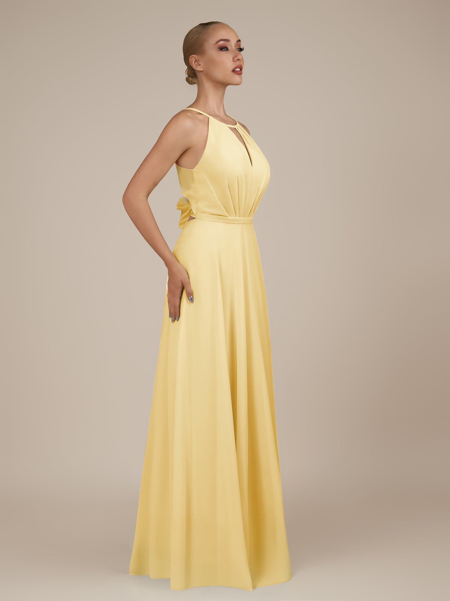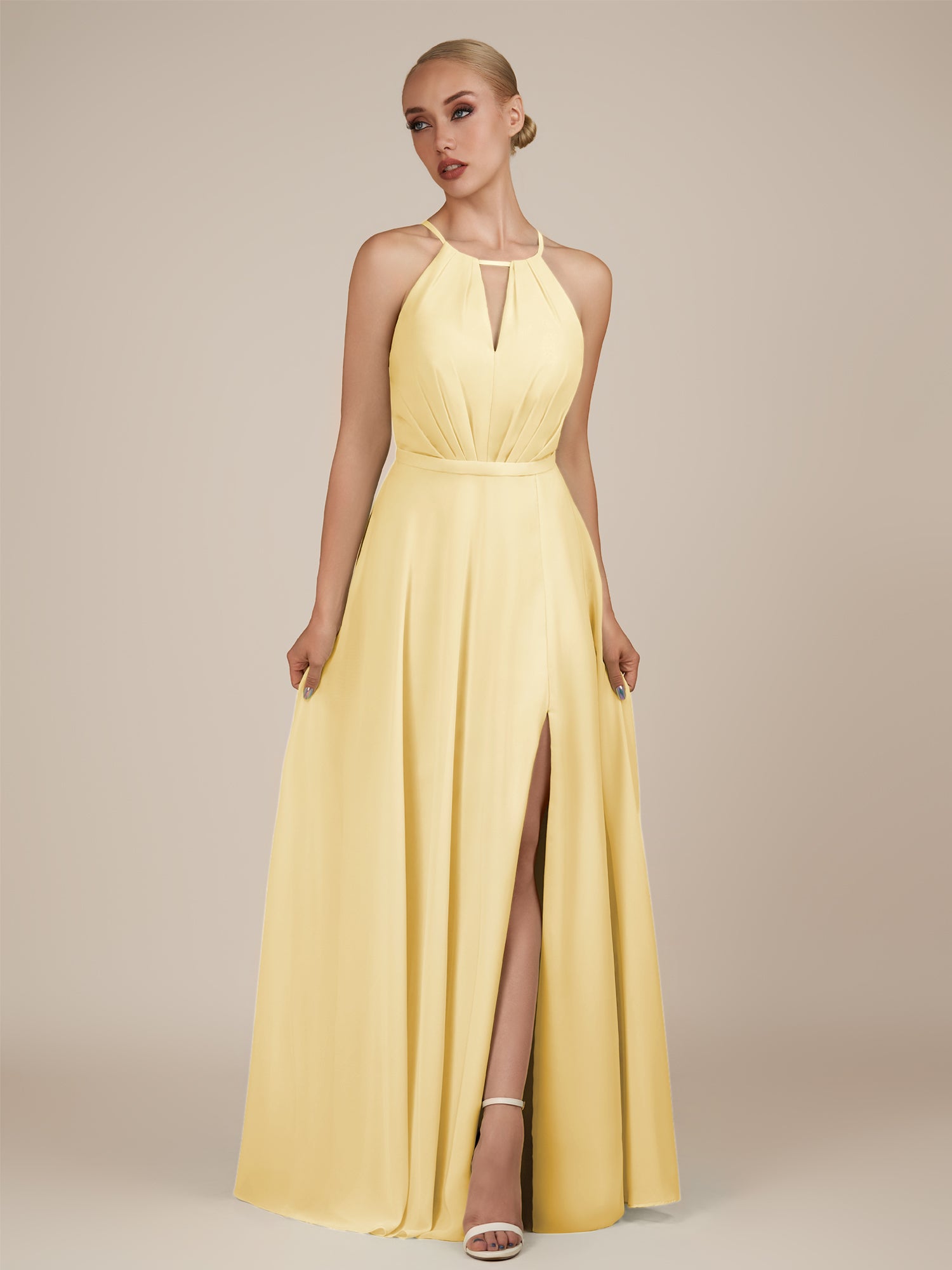 Illyria | Pastel Yellow - A Line Chiffon Halter Neck Long Bridesmaid Dress with Cut Out