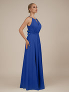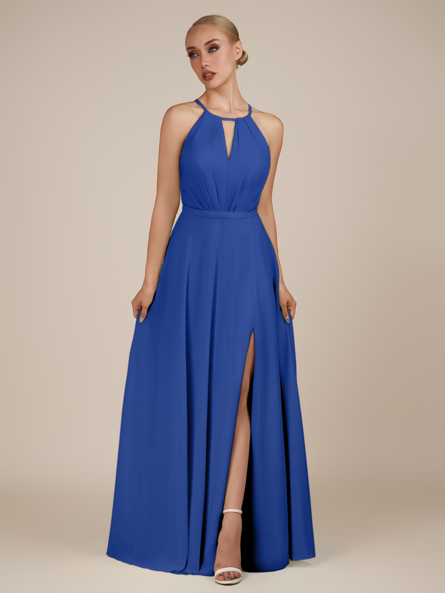 Illyria | Royal Blue - A Line Chiffon Halter Neck Long Bridesmaid Dress with Cut Out