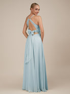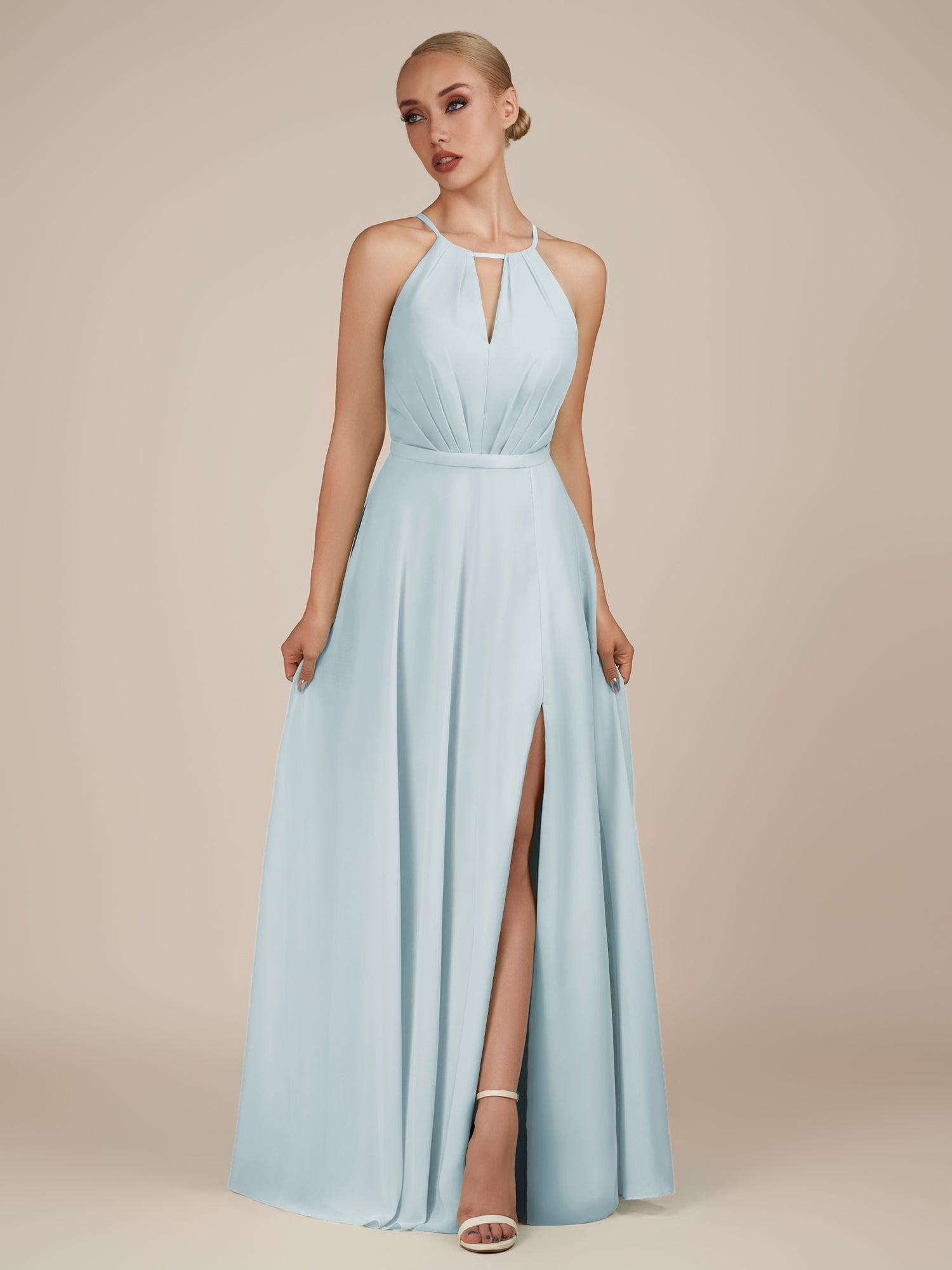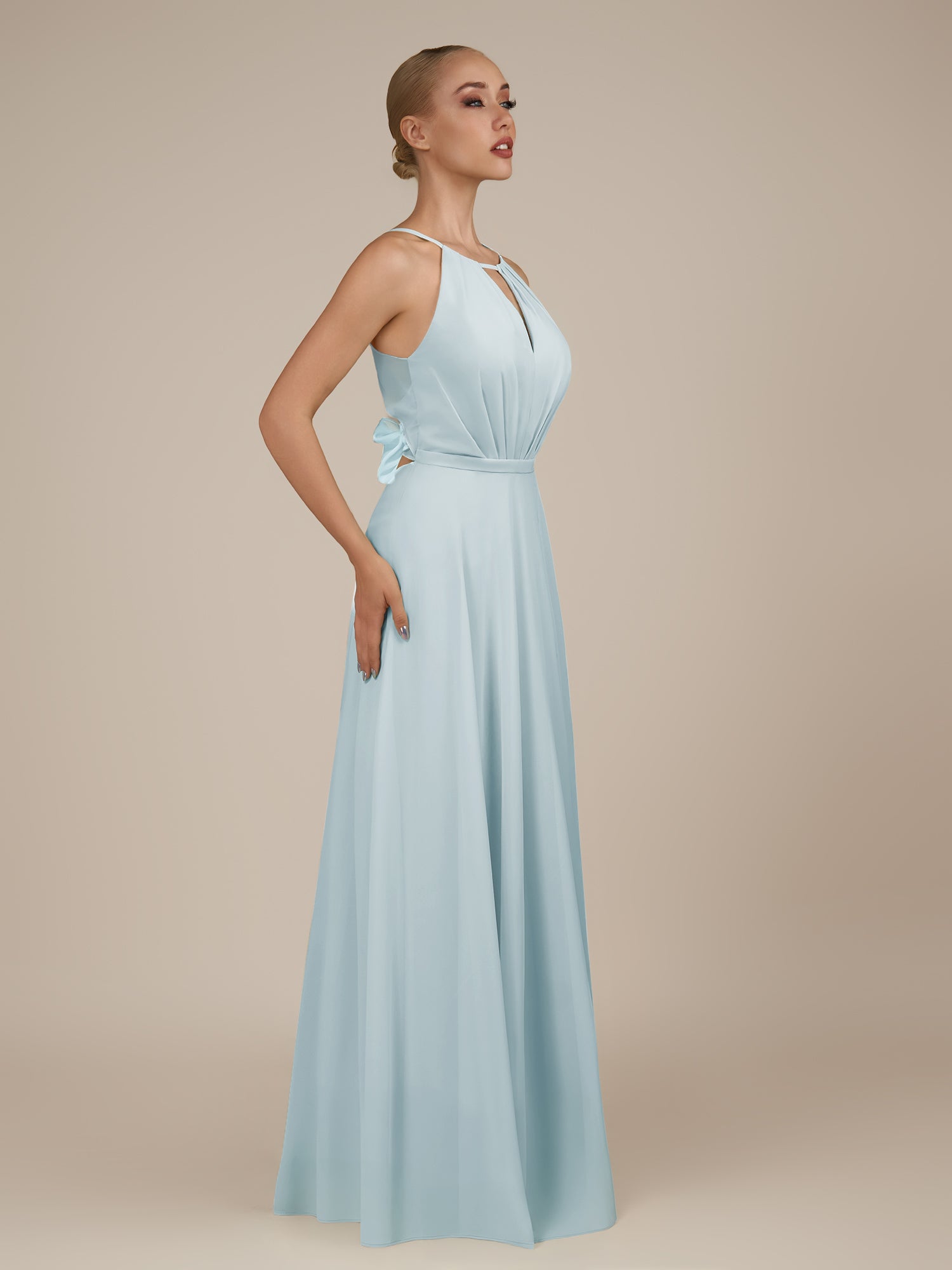 Illyria | Sky Blue - A Line Chiffon Halter Neck Long Bridesmaid Dress with Cut Out