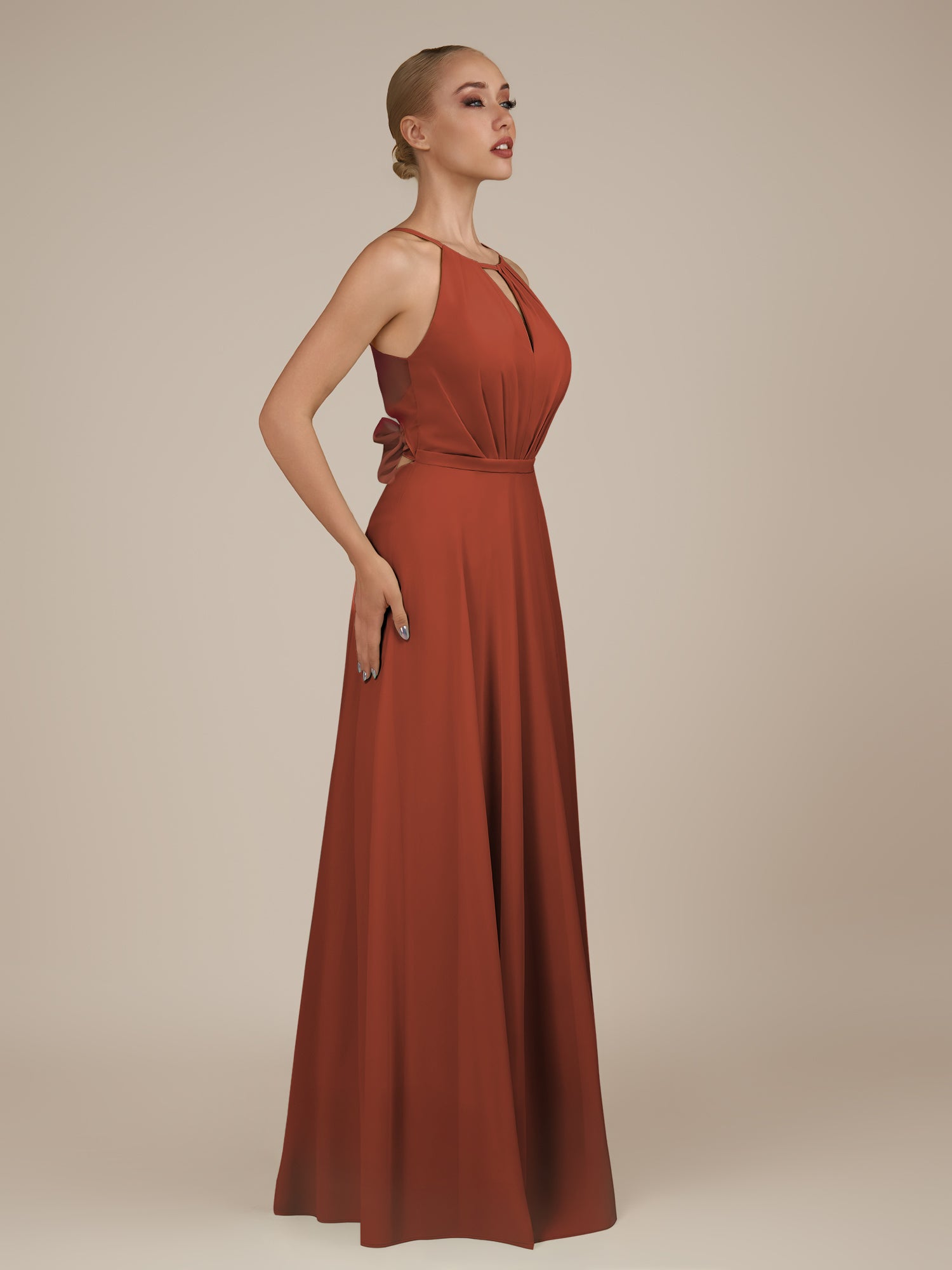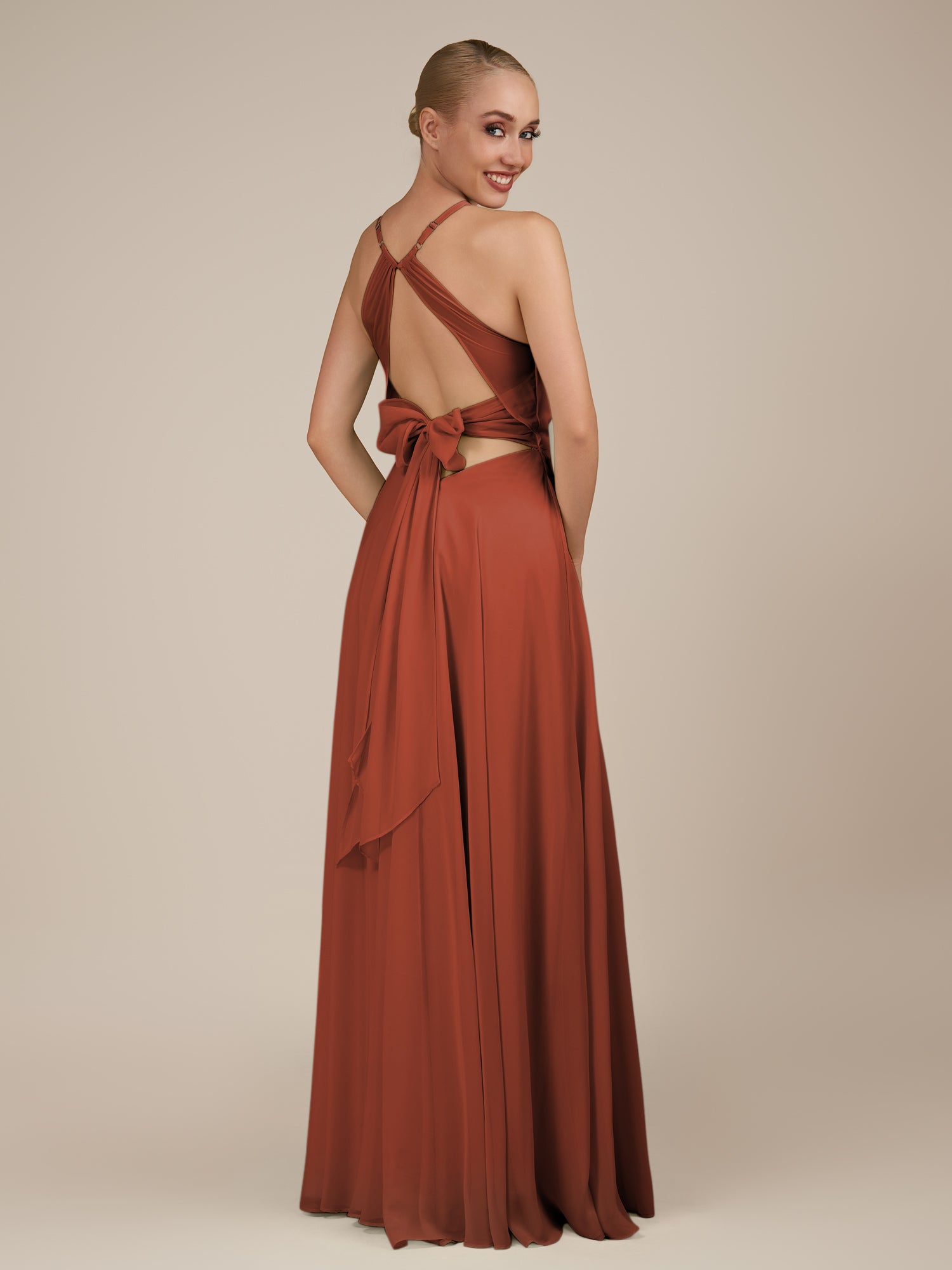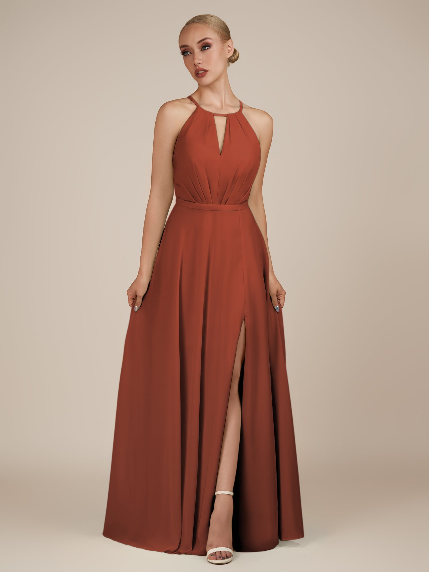 Illyria | Spice - A Line Chiffon Halter Neck Long Bridesmaid Dress with Cut Out