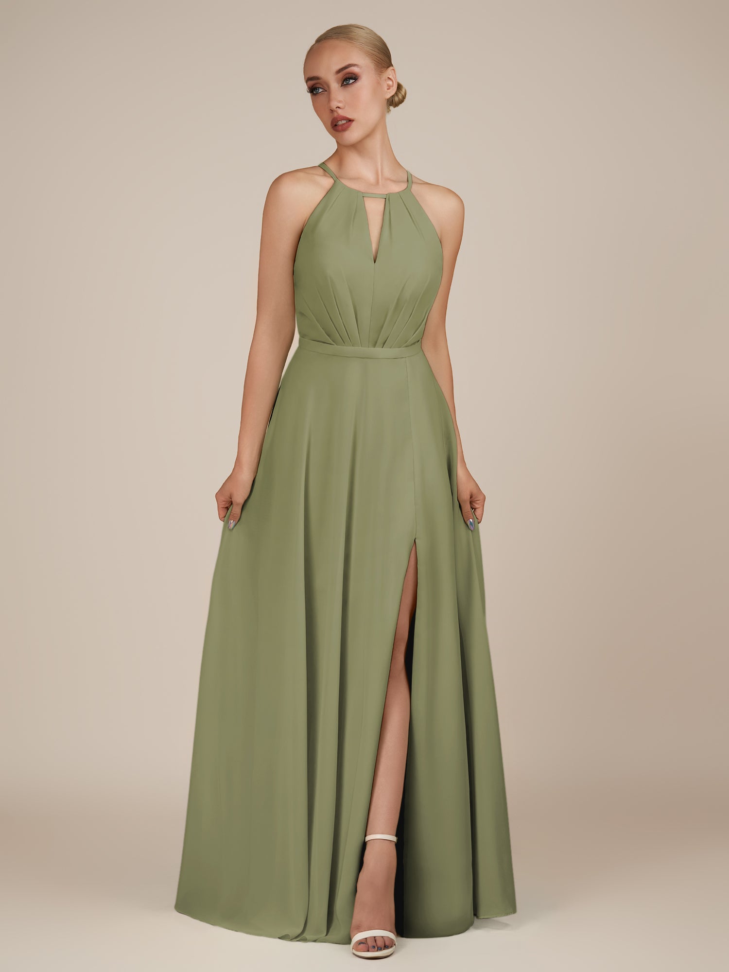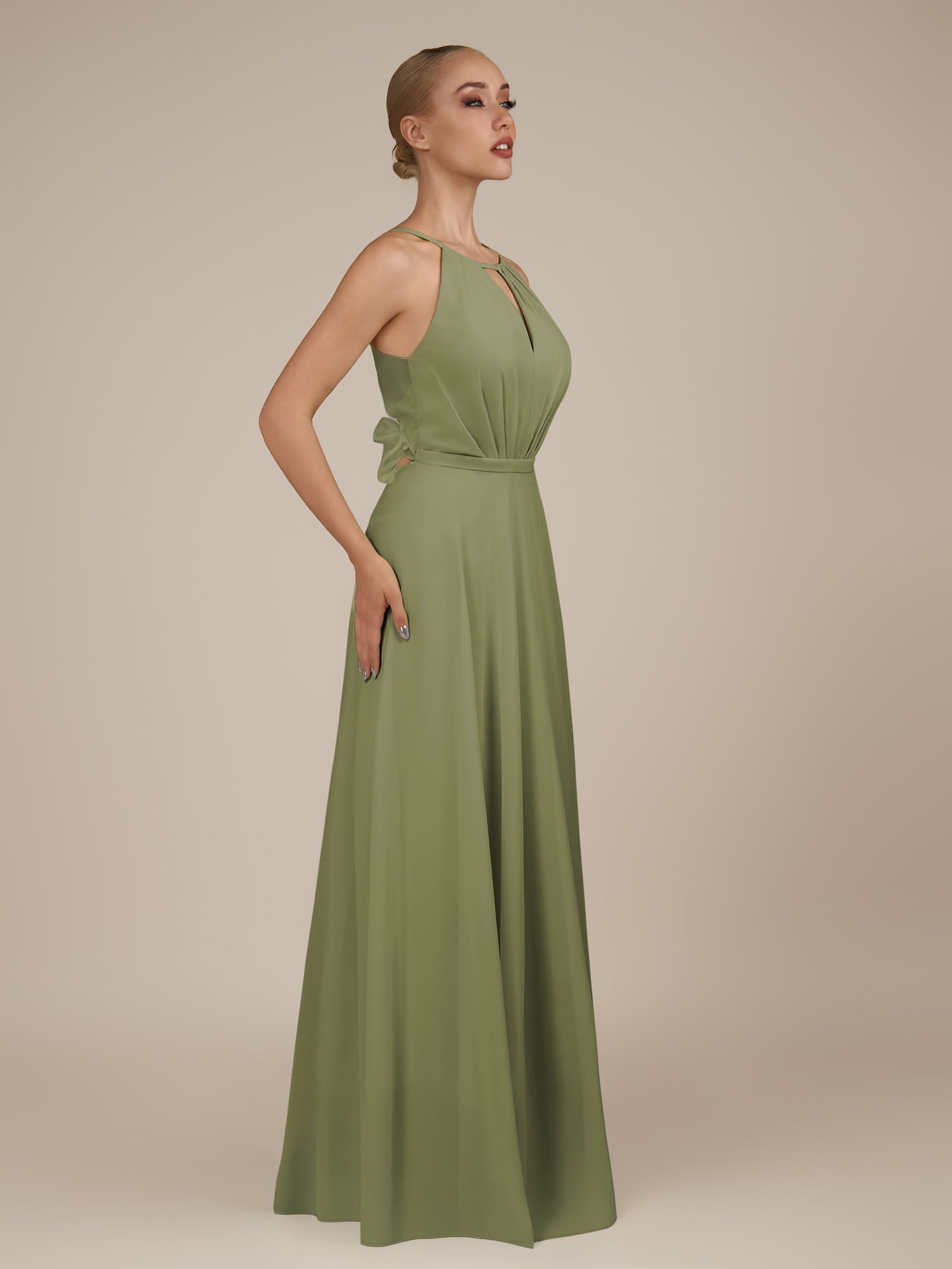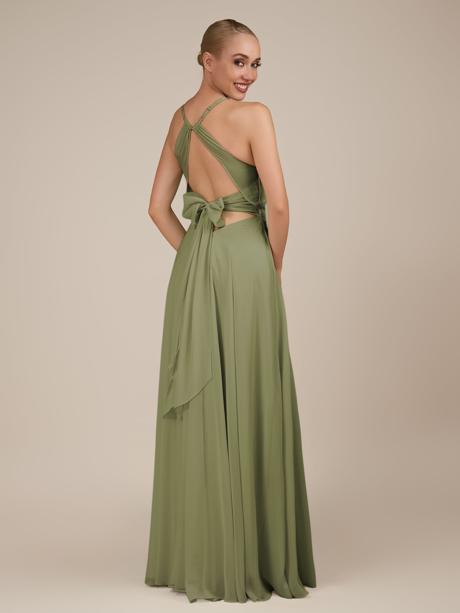 Illyria | Thyme - A Line Chiffon Halter Neck Long Bridesmaid Dress with Cut Out
