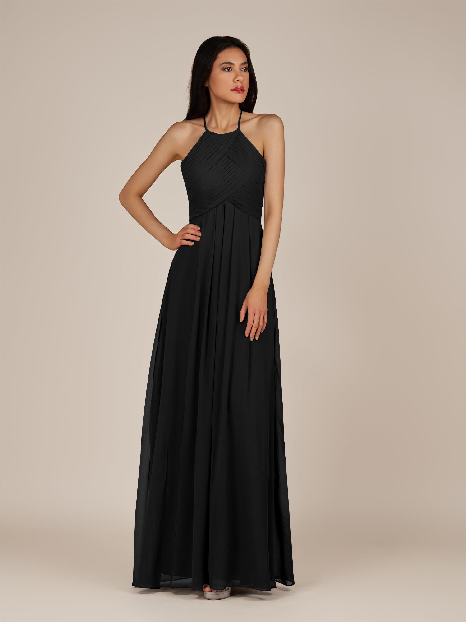 Iseult | Black - A Line Chiffon Halter Neck Pleated Long Bridesmaid Dress