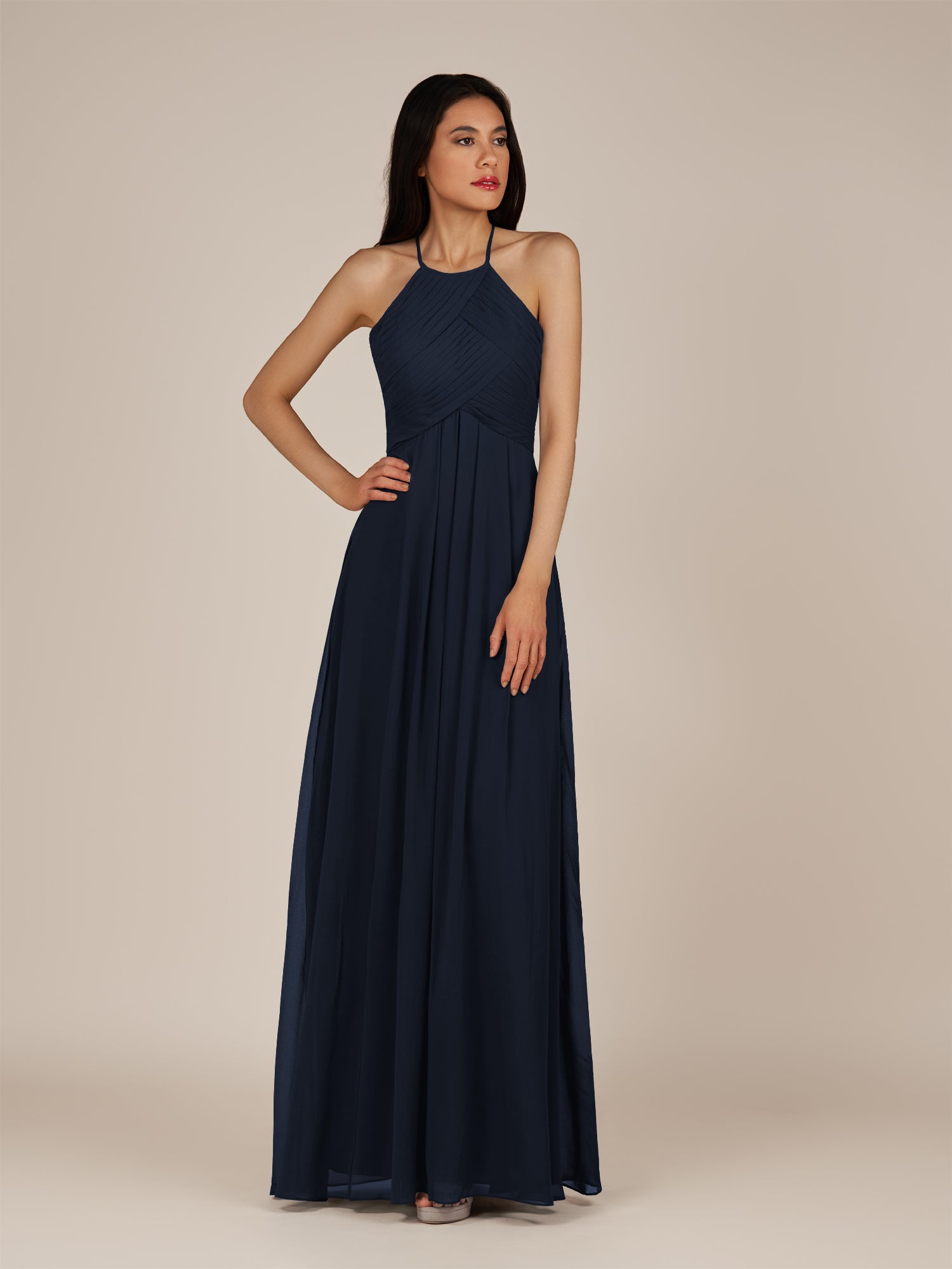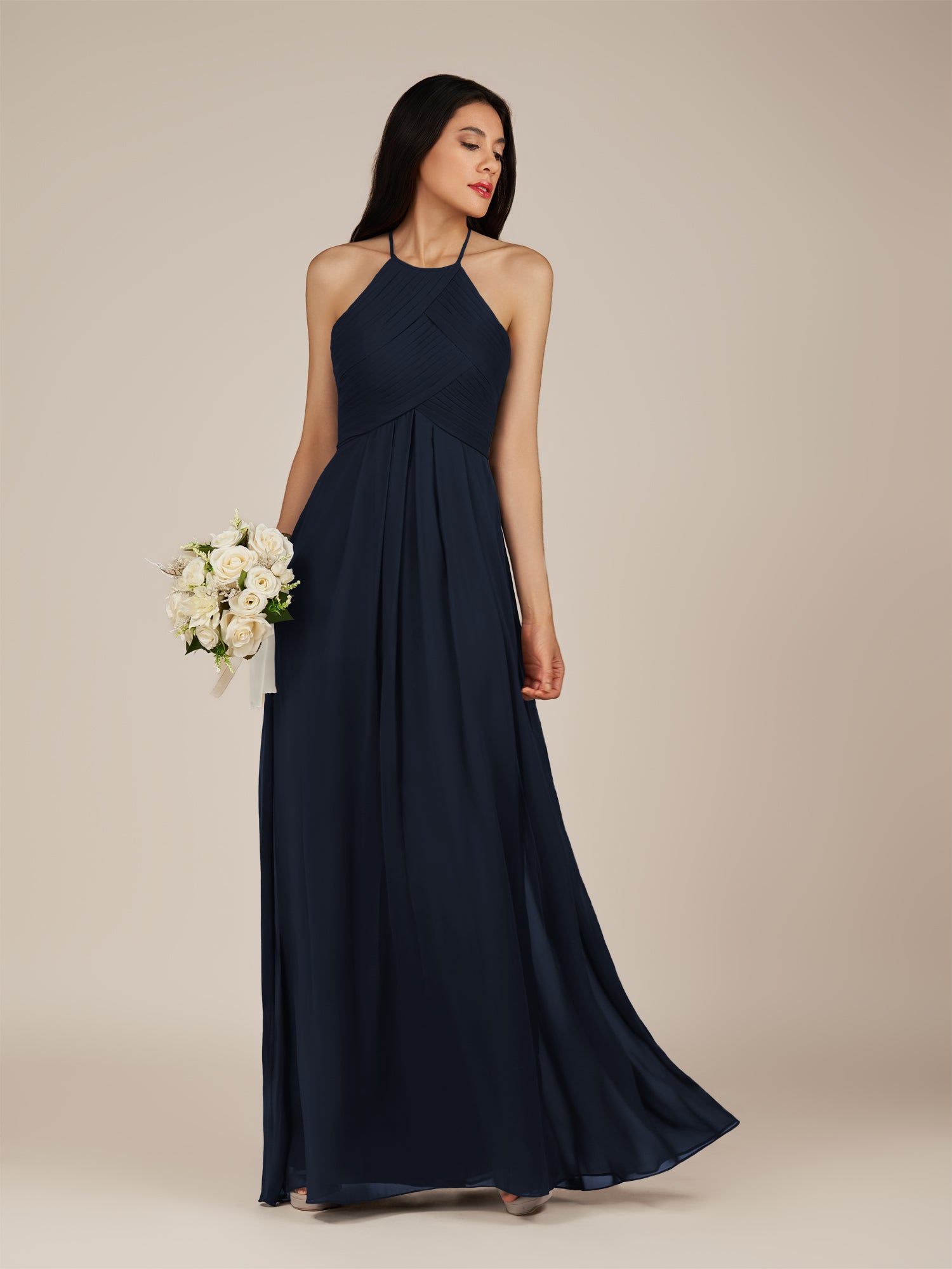Iseult | Dark Navy - A Line Chiffon Halter Neck Pleated Long Bridesmaid Dress