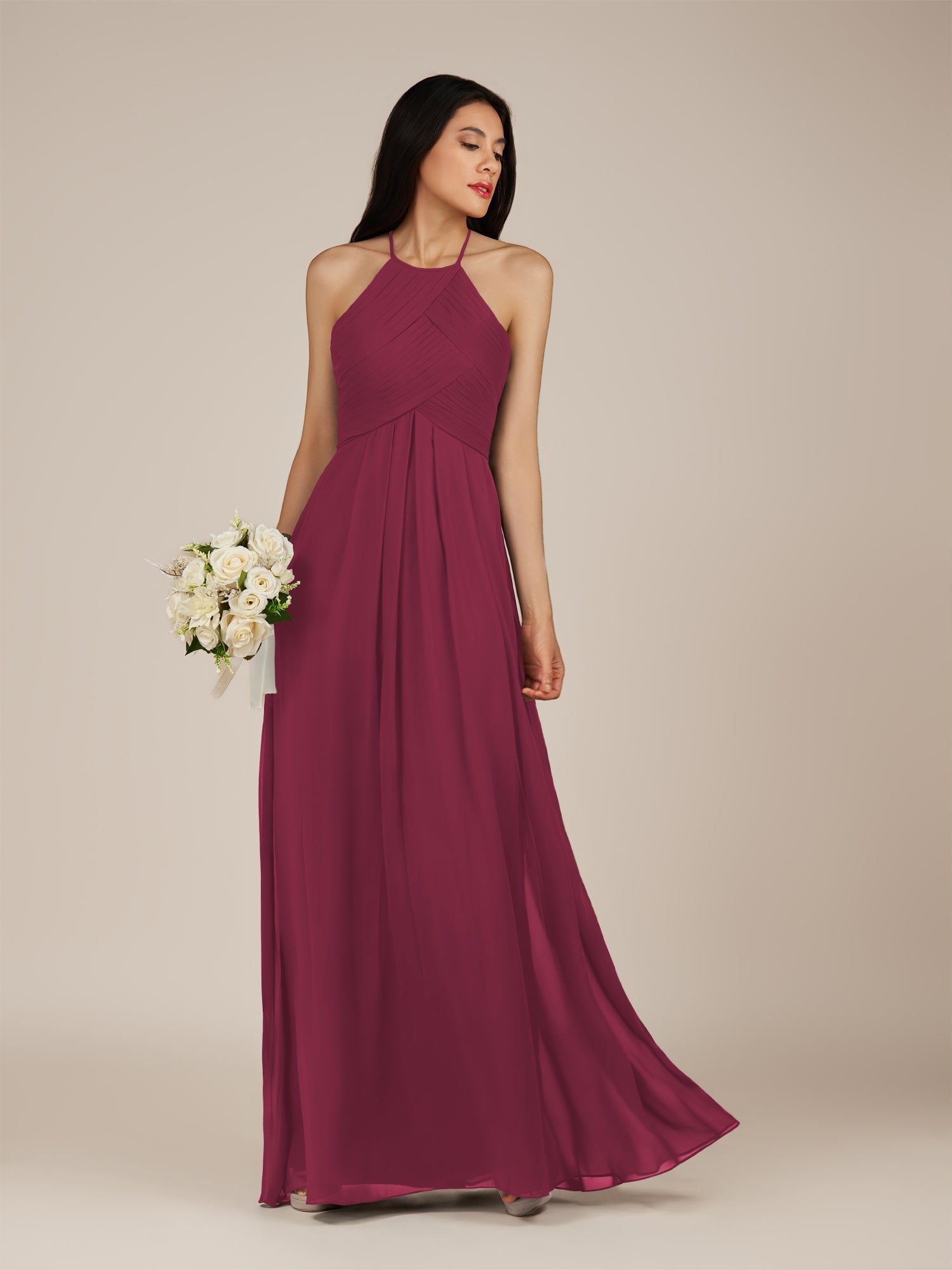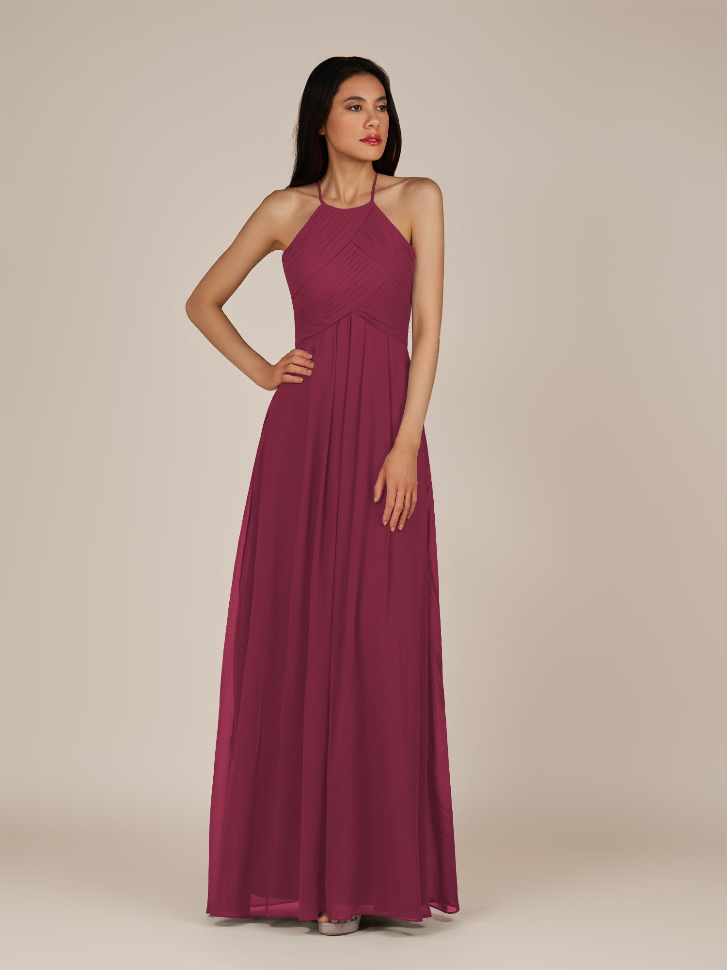 Iseult is a striking and elegant choice for your bridal party. Crafted from soft chiffon, she features a flattering halter neckline and a sleeveless bodice for a modern, graceful look. Her floor-length A-line skirt flows effortlessly with every step, accented by delicate pleats that add texture and sophistication. Finished with a smooth zipper back, Iseult combines timeless elegance with effortless charm for weddings and special occasions.