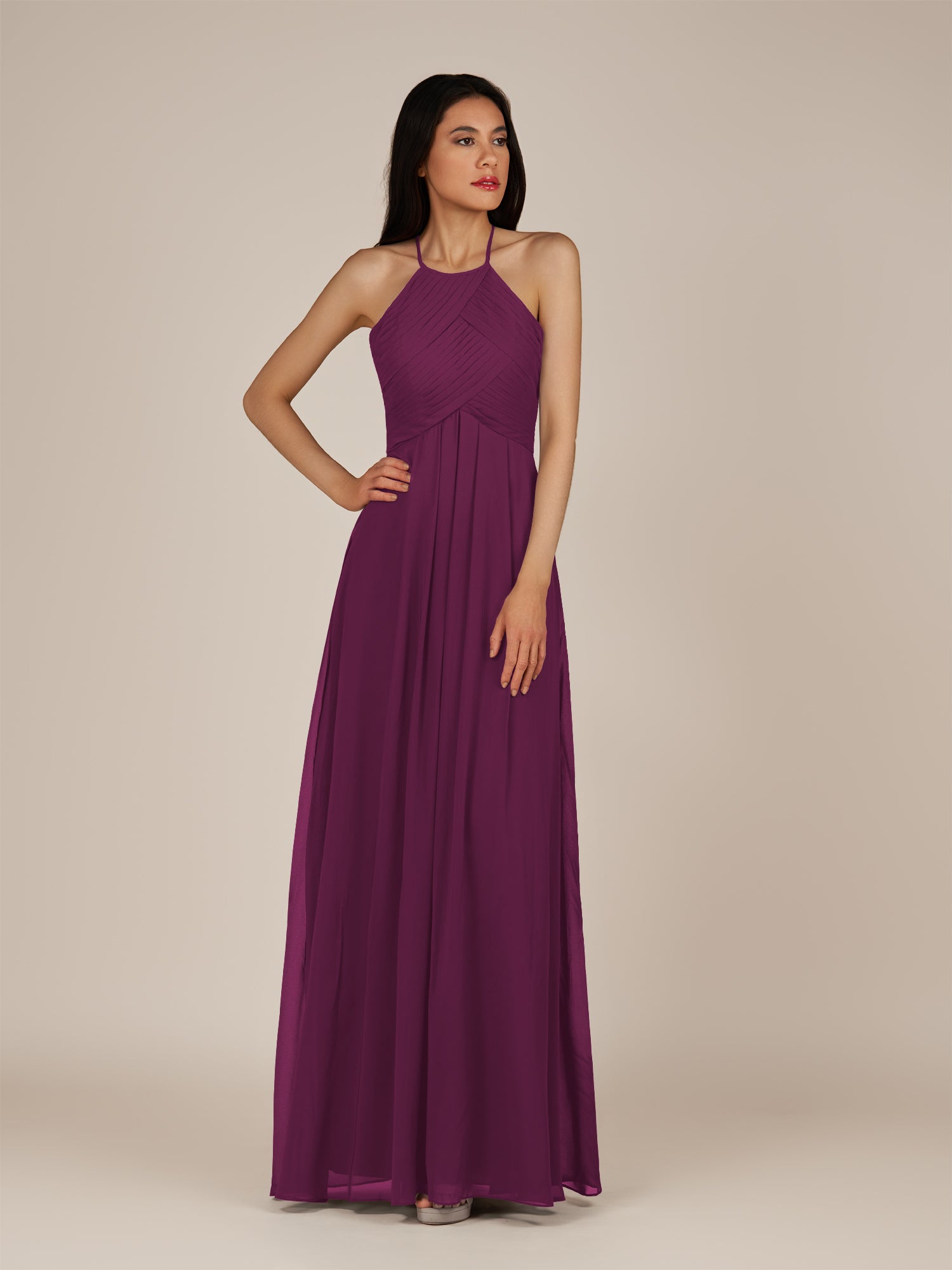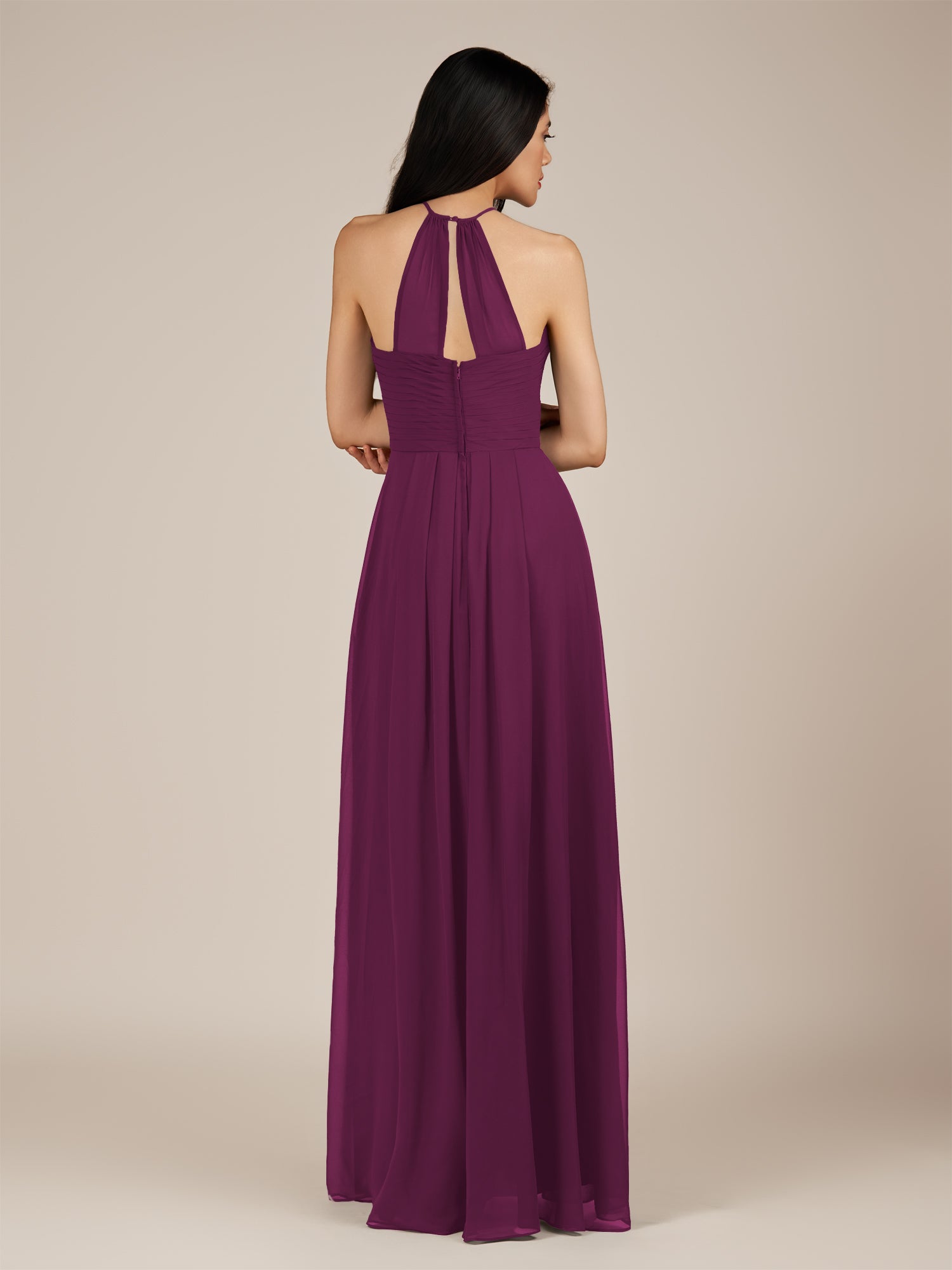Iseult | Fig - A Line Chiffon Halter Neck Pleated Long Bridesmaid Dress