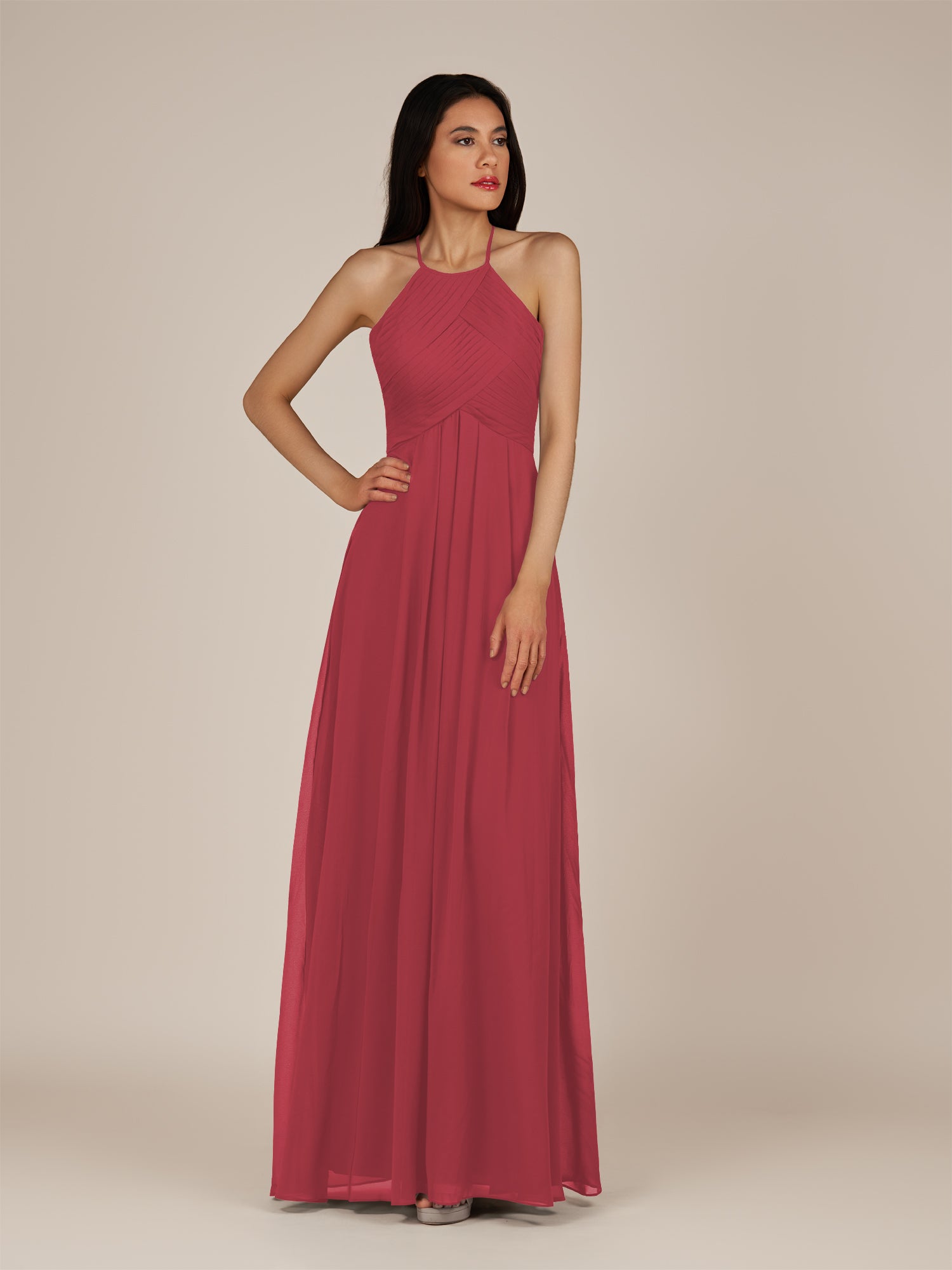 Iseult is a striking and elegant choice for your bridal party. Crafted from soft chiffon, she features a flattering halter neckline and a sleeveless bodice for a modern, graceful look. Her floor-length A-line skirt flows effortlessly with every step, accented by delicate pleats that add texture and sophistication. Finished with a smooth zipper back, Iseult combines timeless elegance with effortless charm for weddings and special occasions.