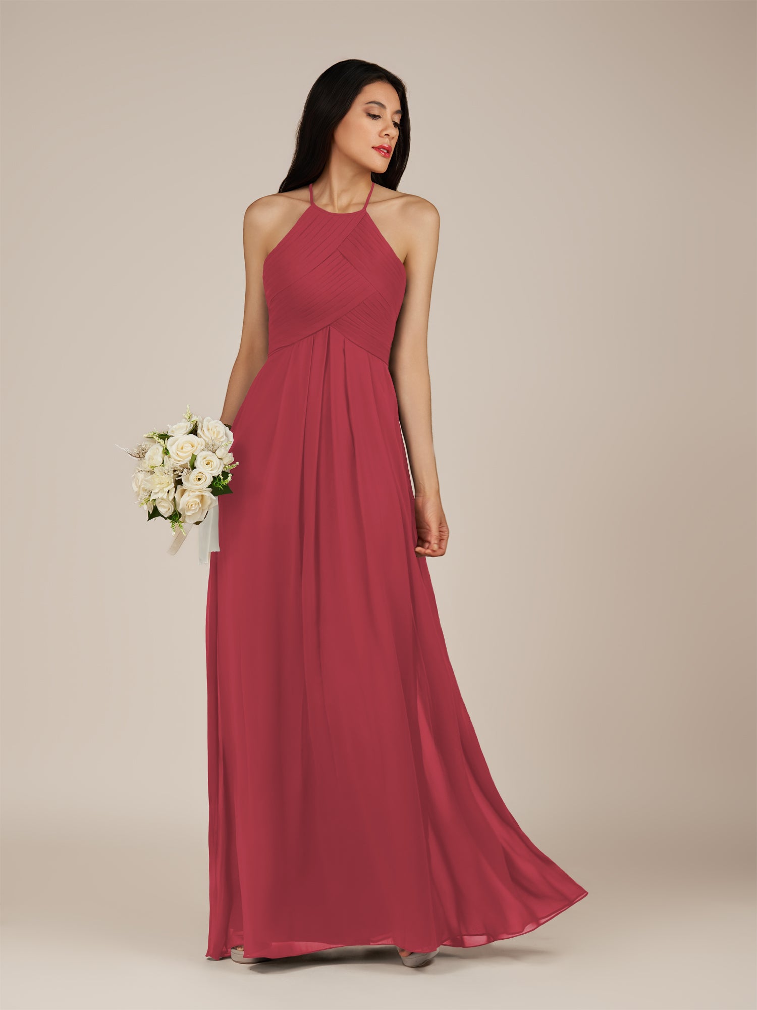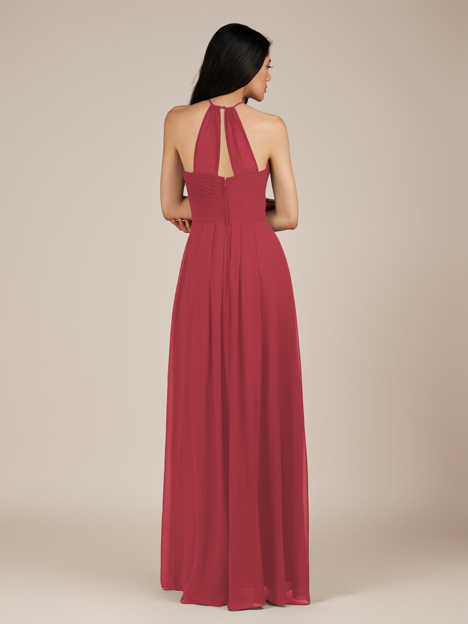 Iseult | Merlot - A Line Chiffon Halter Neck Pleated Long Bridesmaid Dress