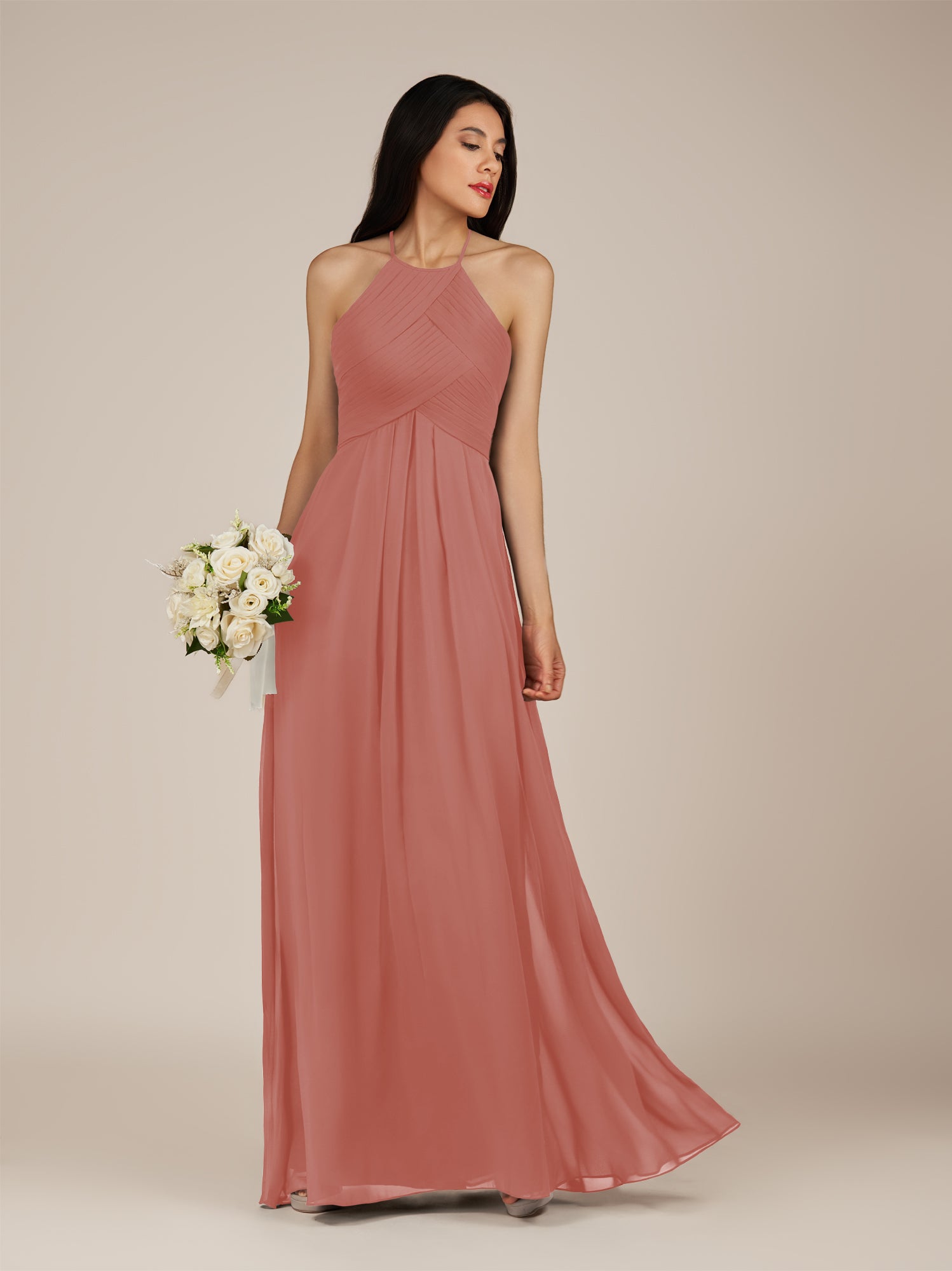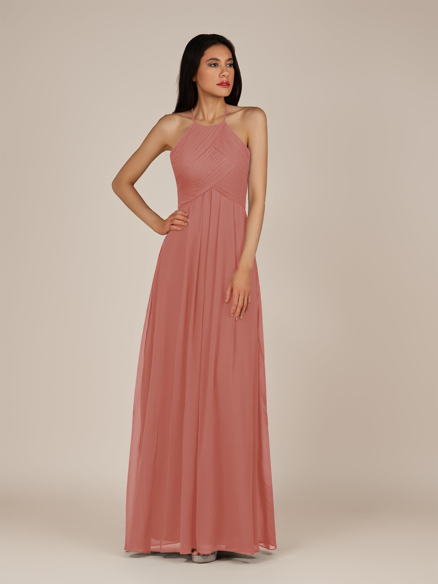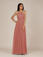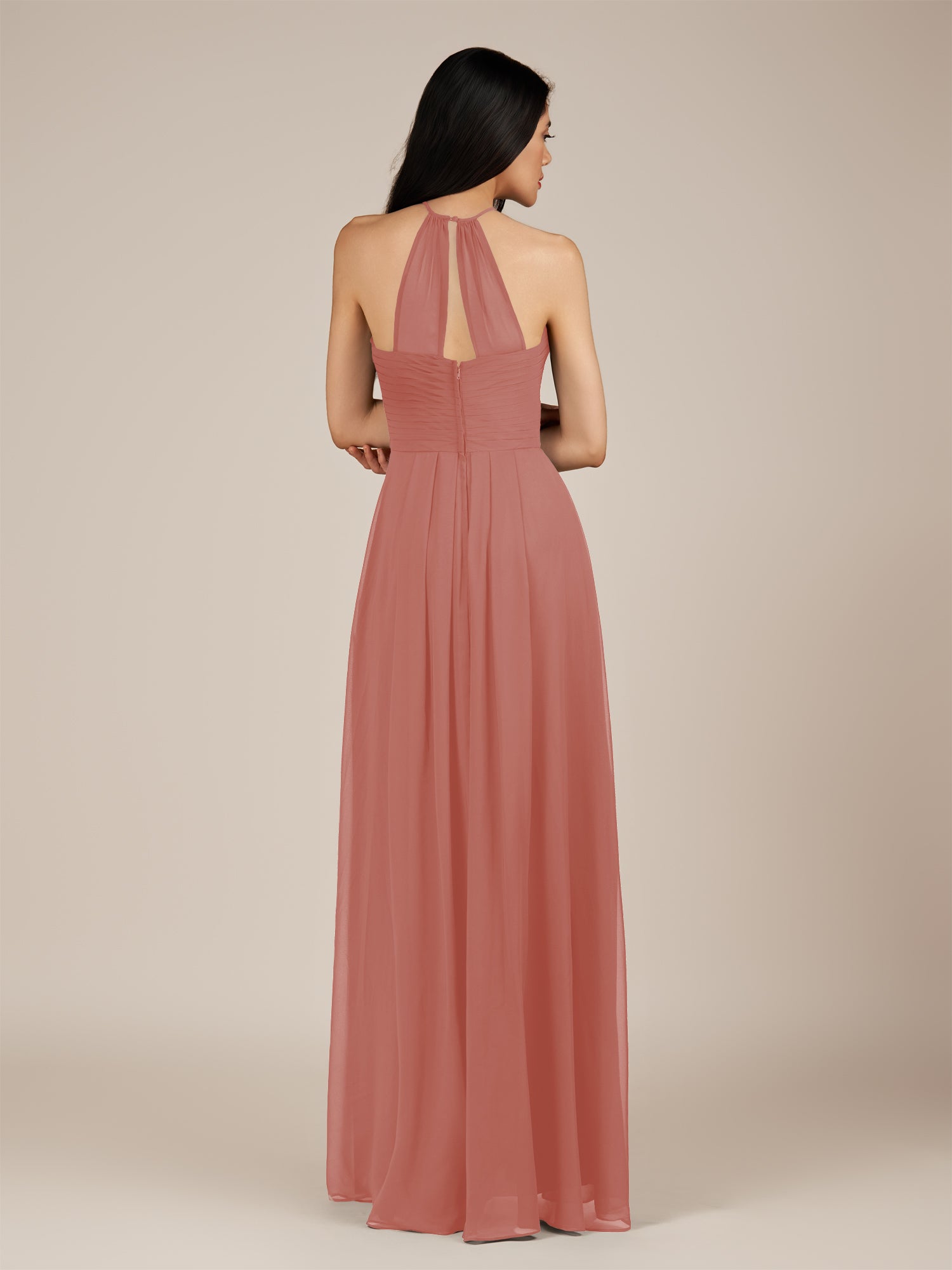 Iseult is a striking and elegant choice for your bridal party. Crafted from soft chiffon, she features a flattering halter neckline and a sleeveless bodice for a modern, graceful look. Her floor-length A-line skirt flows effortlessly with every step, accented by delicate pleats that add texture and sophistication. Finished with a smooth zipper back, Iseult combines timeless elegance with effortless charm for weddings and special occasions.