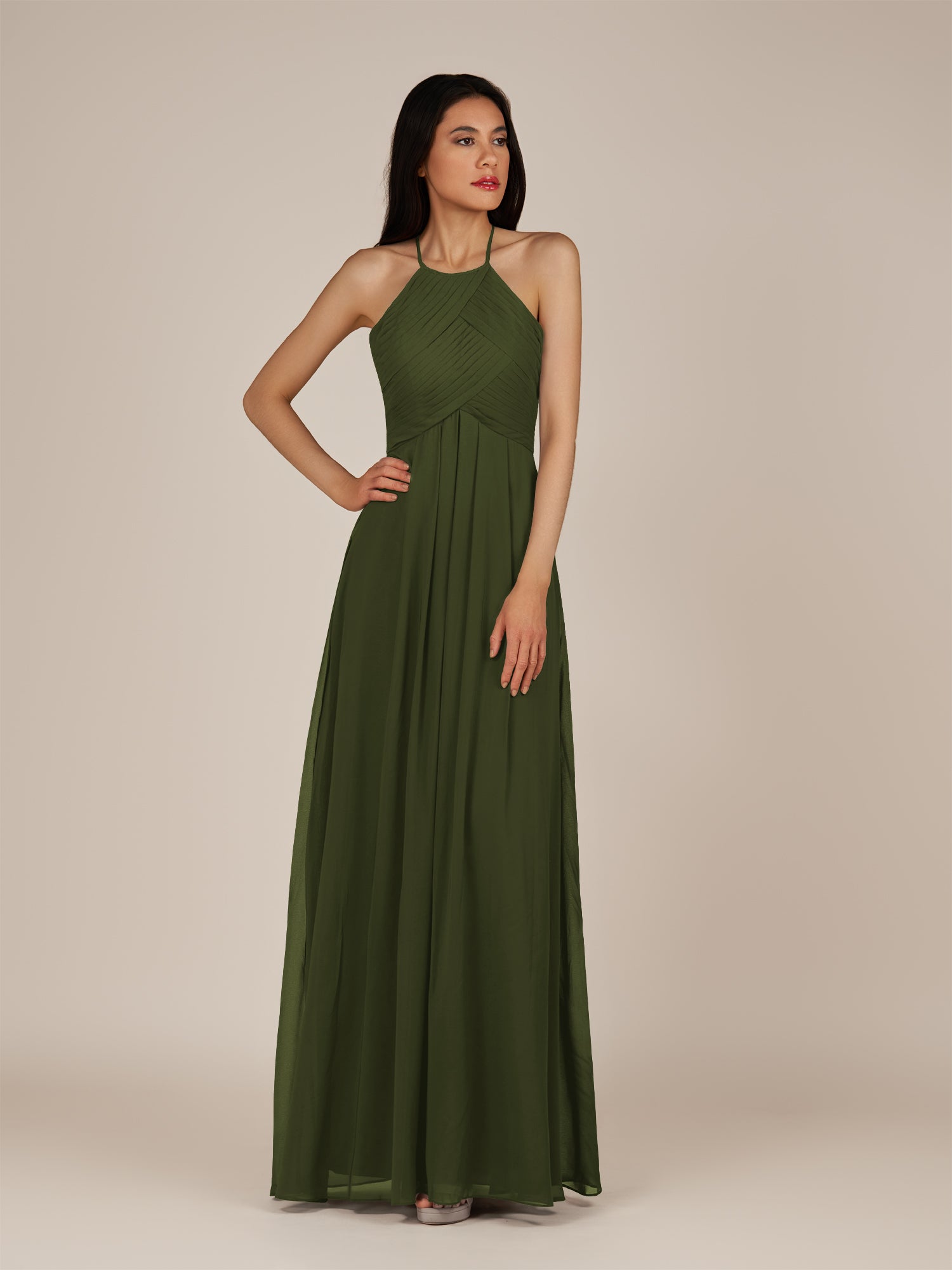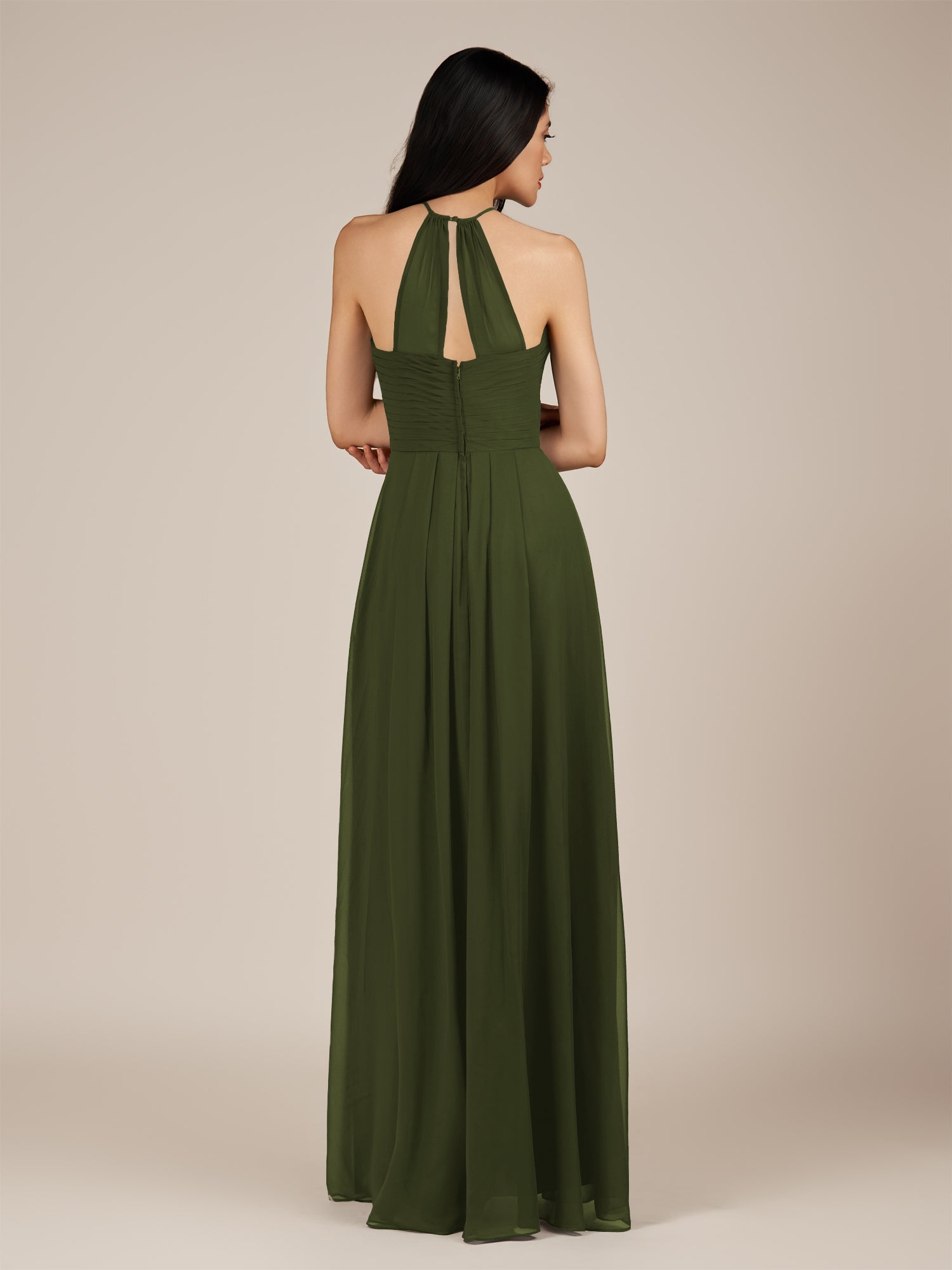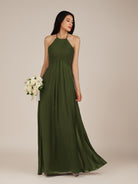 Iseult | Olive - A Line Chiffon Halter Neck Pleated Long Bridesmaid Dress