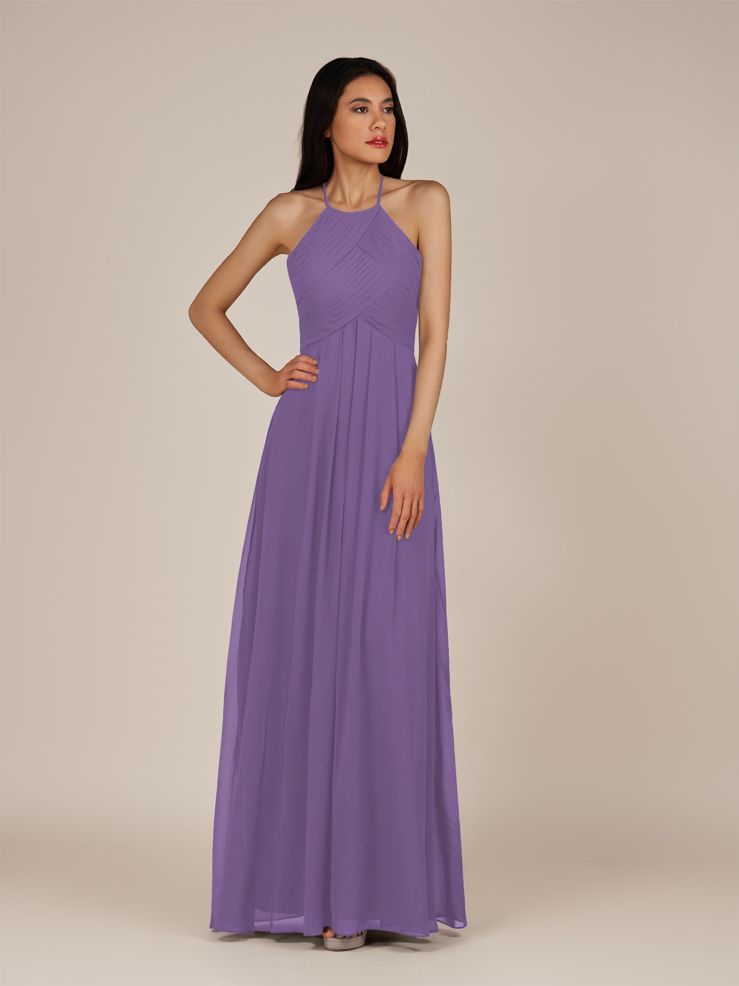 Iseult is a striking and elegant choice for your bridal party. Crafted from soft chiffon, she features a flattering halter neckline and a sleeveless bodice for a modern, graceful look. Her floor-length A-line skirt flows effortlessly with every step, accented by delicate pleats that add texture and sophistication. Finished with a smooth zipper back, Iseult combines timeless elegance with effortless charm for weddings and special occasions.