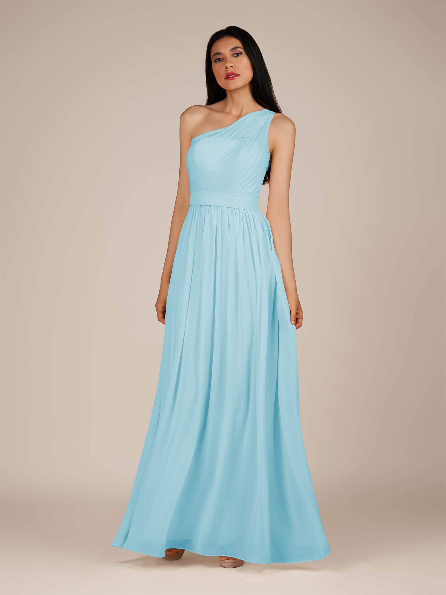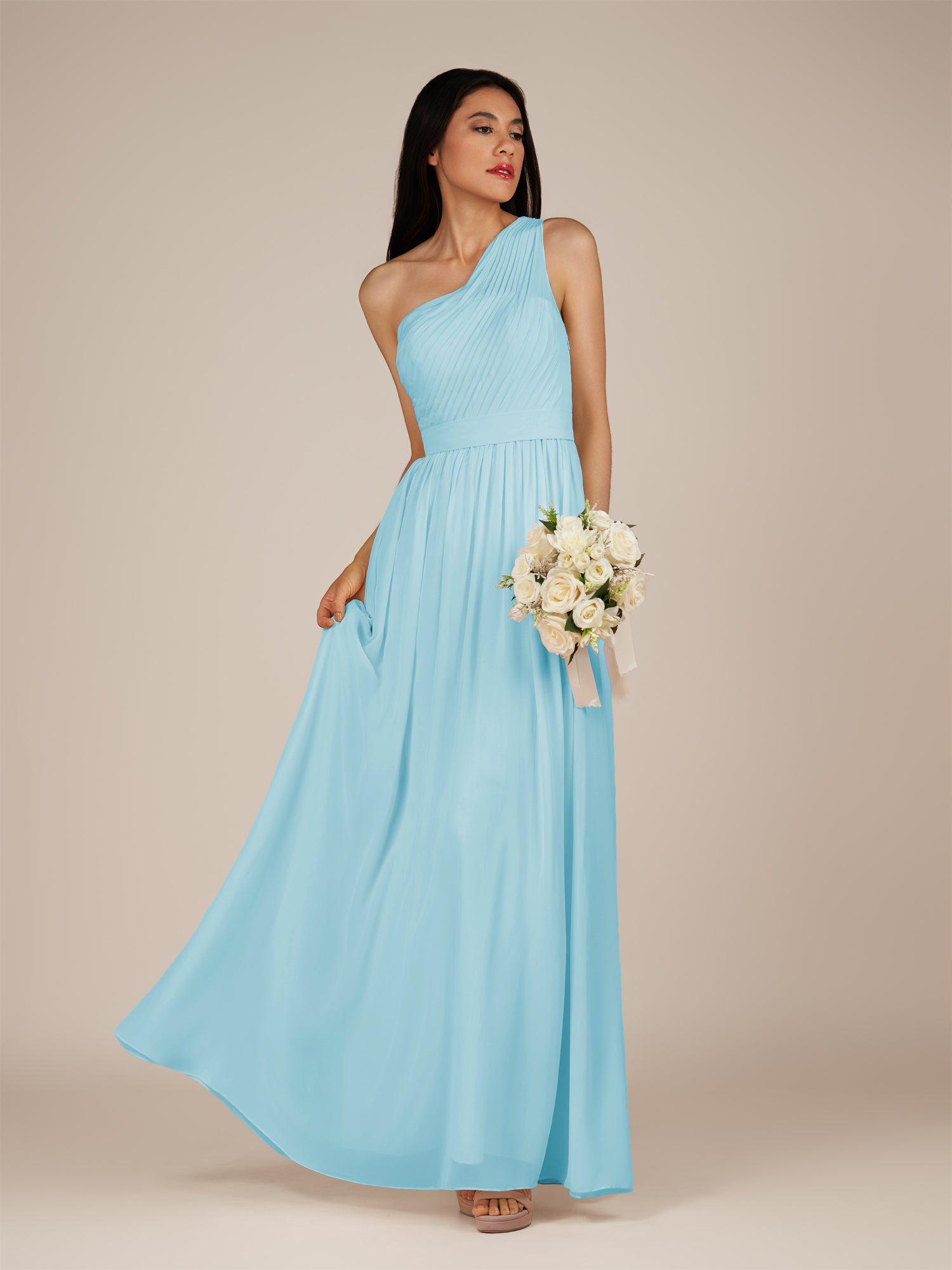 Juliet is a romantic and elegant choice for your bridal party. Crafted from soft chiffon, she features a flattering one-shoulder neckline and a delicately pleated bodice that enhances the waist. Her floor-length A-line skirt flows gracefully with every step, creating a timeless and feminine silhouette. Finished with a smooth zipper back, Juliet blends classic charm with effortless style, perfect for weddings and special occasions.