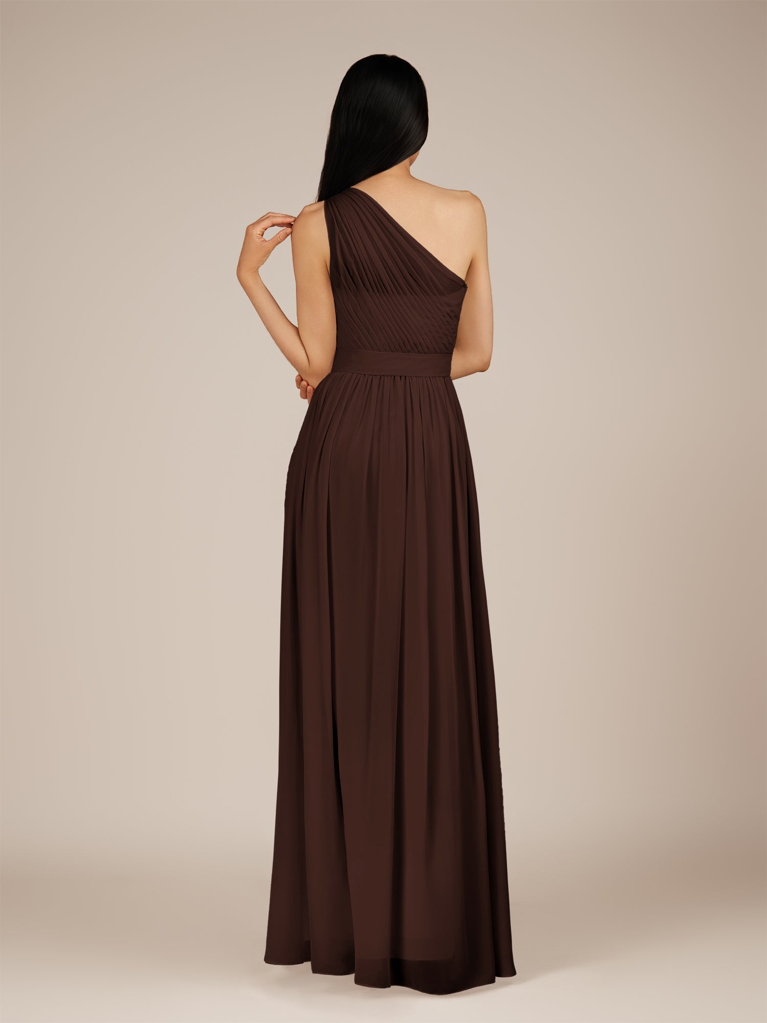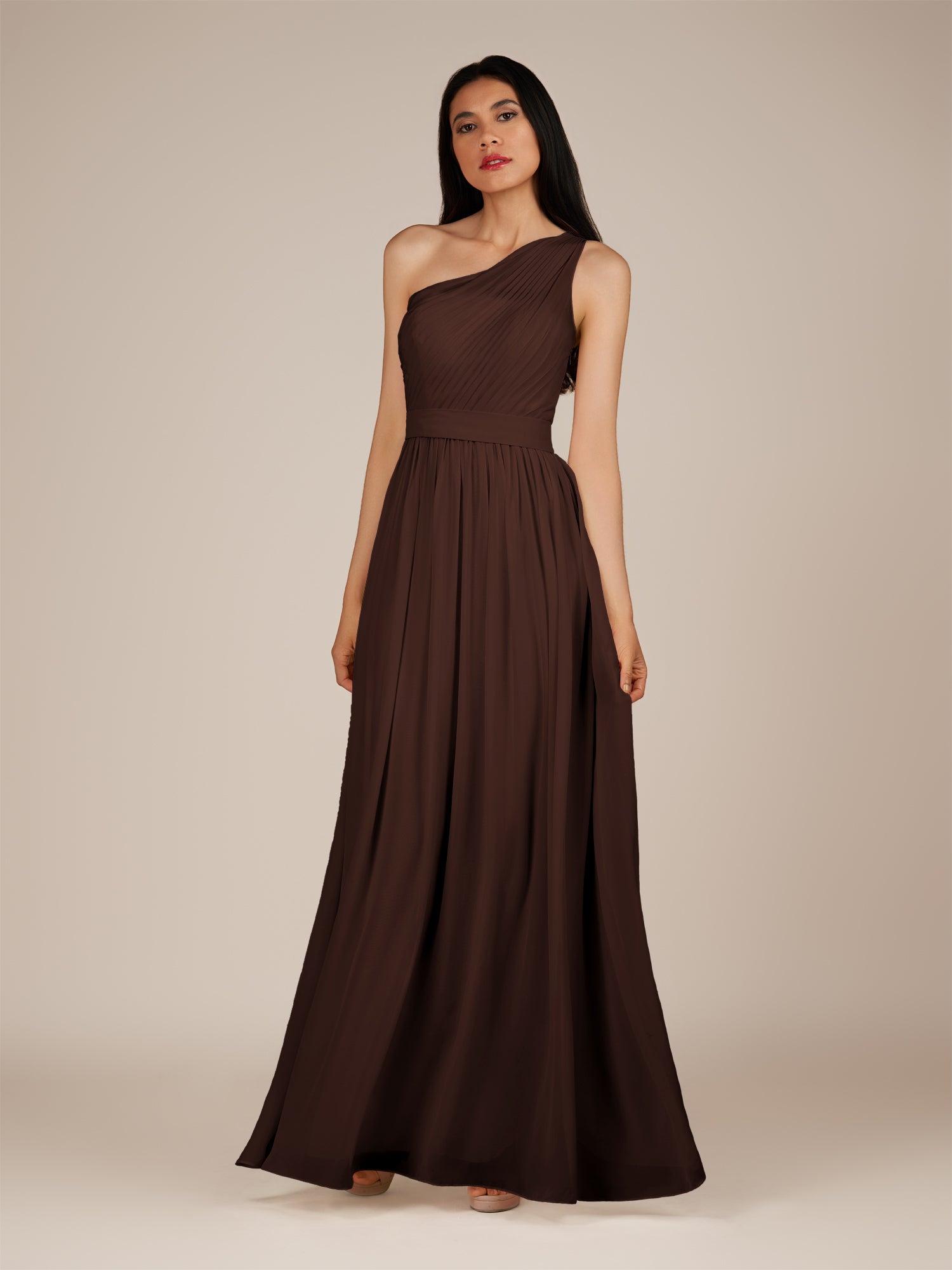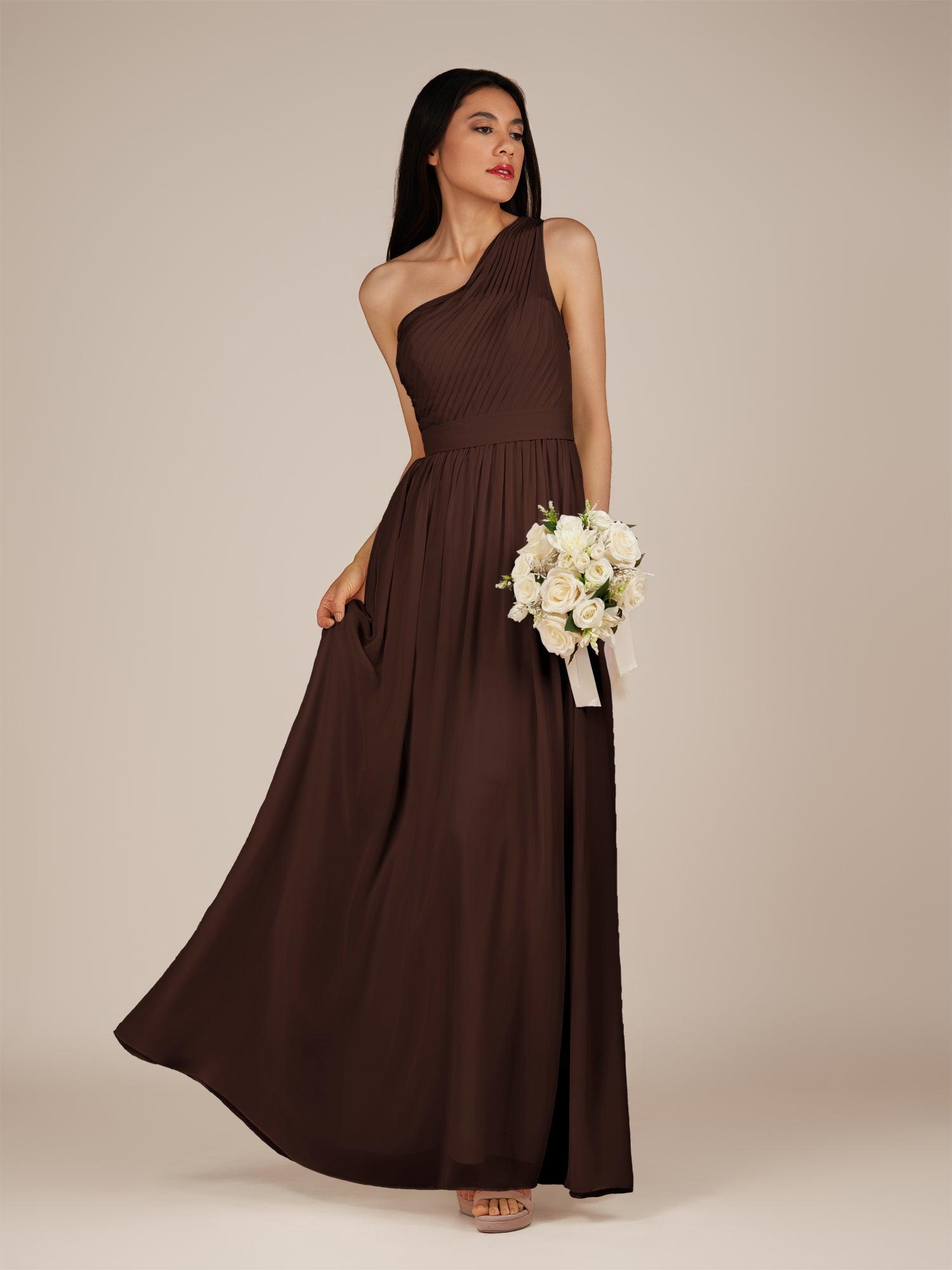 Juliet | Espresso - A Line Chiffon One Shoulder Pleated Long Bridesmaid Dress