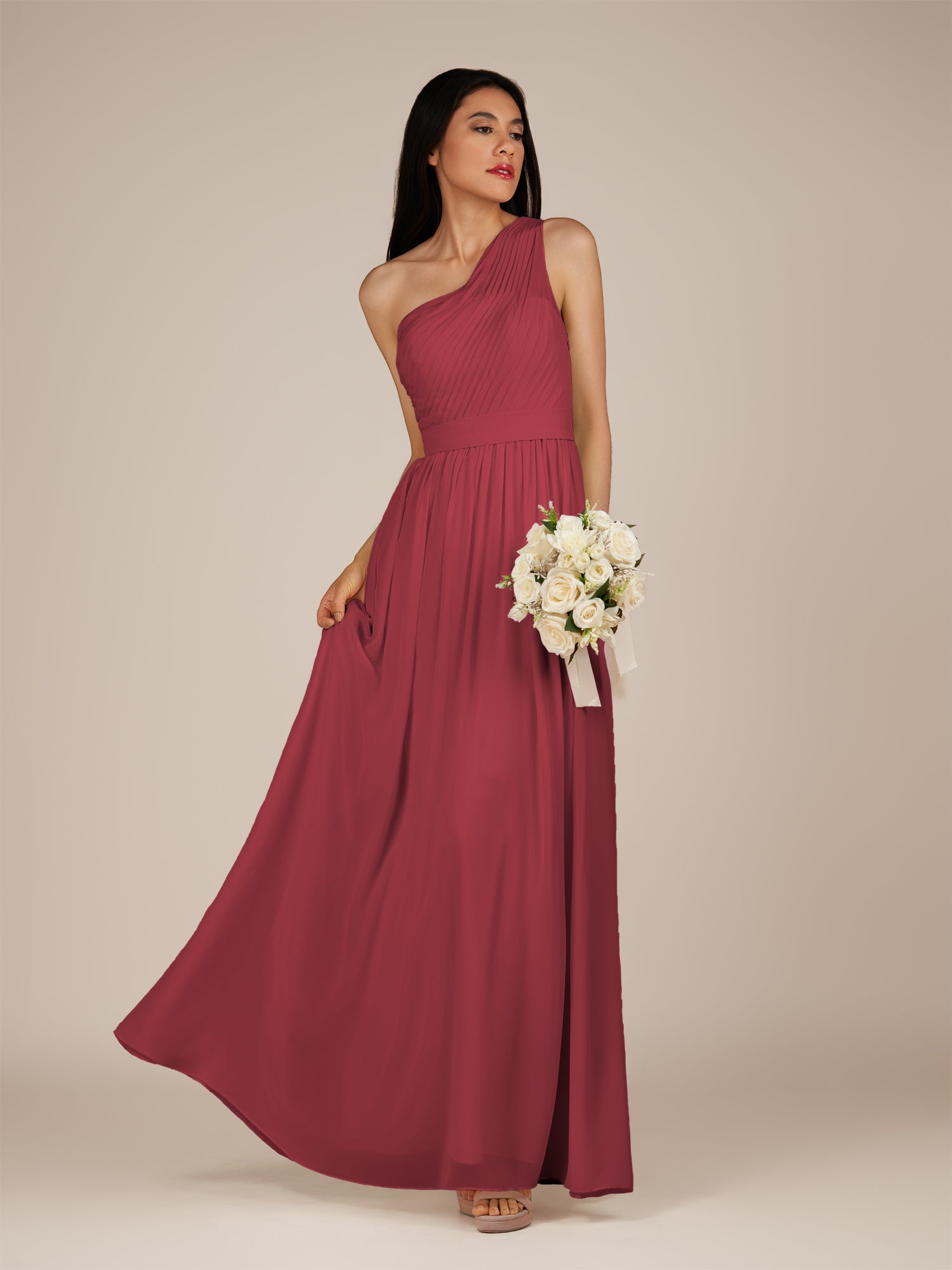Juliet | Merlot - A Line Chiffon One Shoulder Pleated Long Bridesmaid Dress