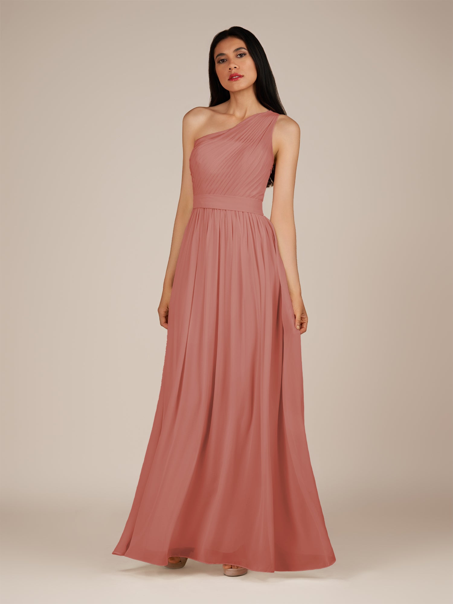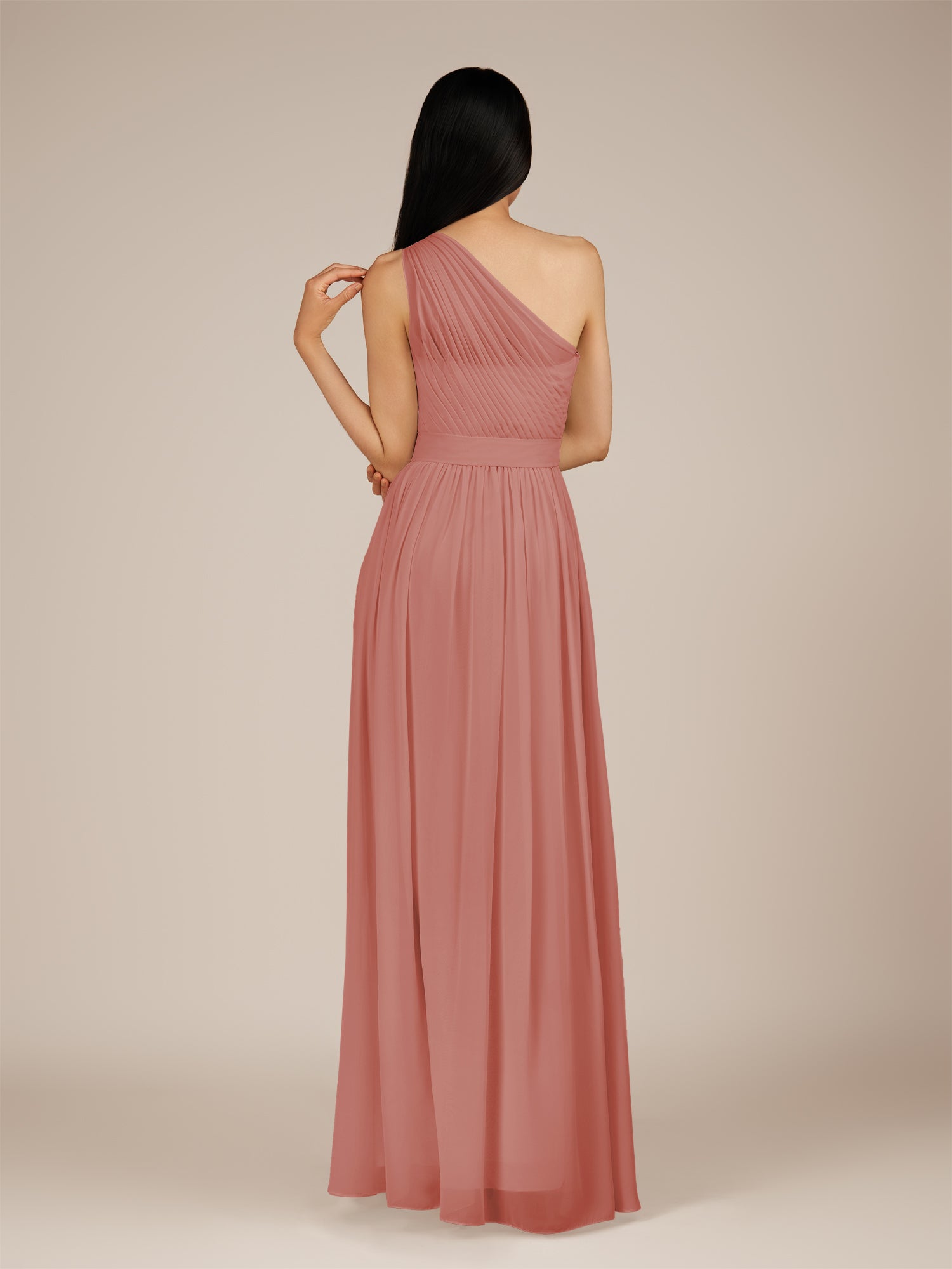 Juliet is a romantic and elegant choice for your bridal party. Crafted from soft chiffon, she features a flattering one-shoulder neckline and a delicately pleated bodice that enhances the waist. Her floor-length A-line skirt flows gracefully with every step, creating a timeless and feminine silhouette. Finished with a smooth zipper back, Juliet blends classic charm with effortless style, perfect for weddings and special occasions.