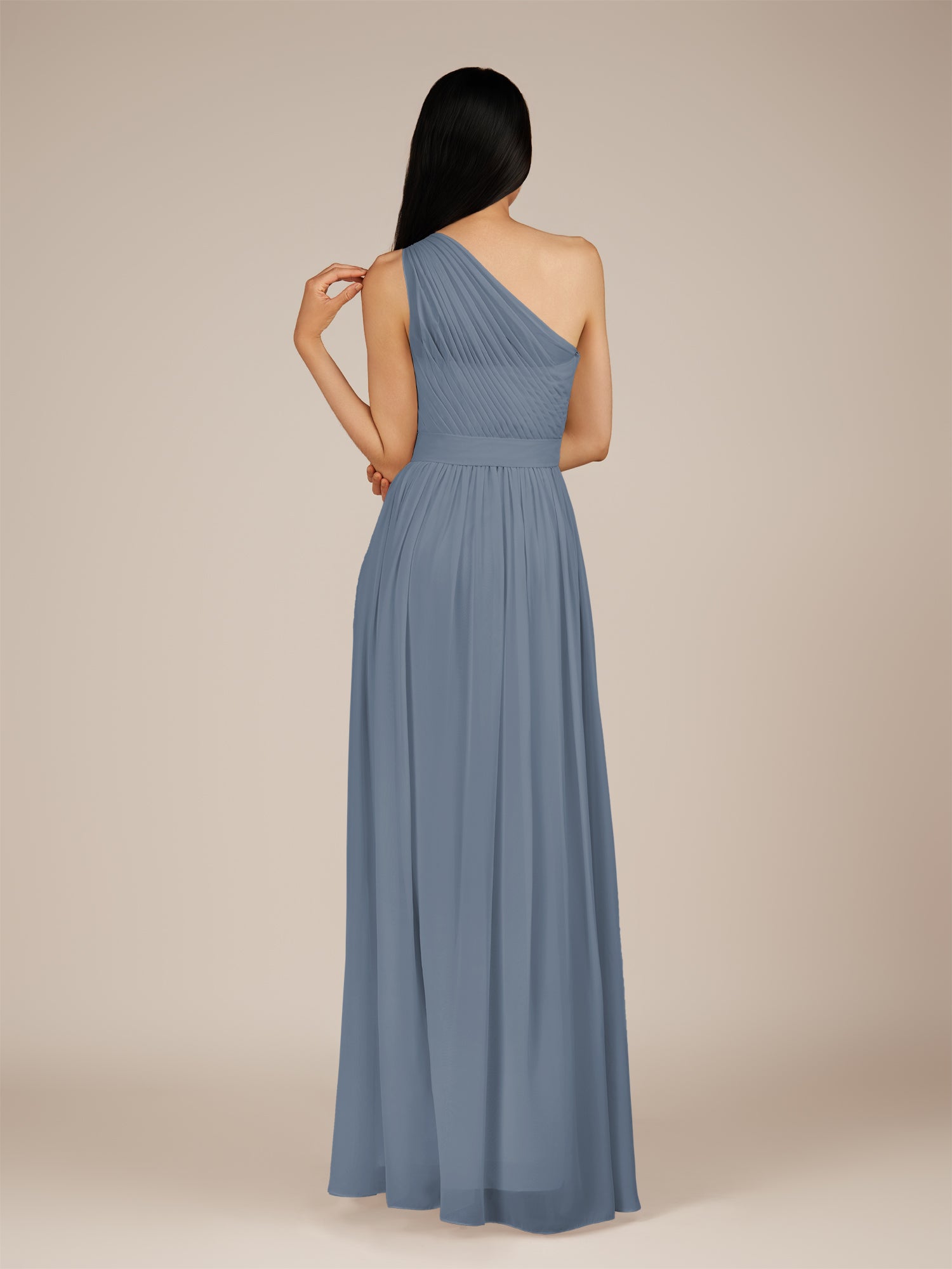 Juliet is a romantic and elegant choice for your bridal party. Crafted from soft chiffon, she features a flattering one-shoulder neckline and a delicately pleated bodice that enhances the waist. Her floor-length A-line skirt flows gracefully with every step, creating a timeless and feminine silhouette. Finished with a smooth zipper back, Juliet blends classic charm with effortless style, perfect for weddings and special occasions.