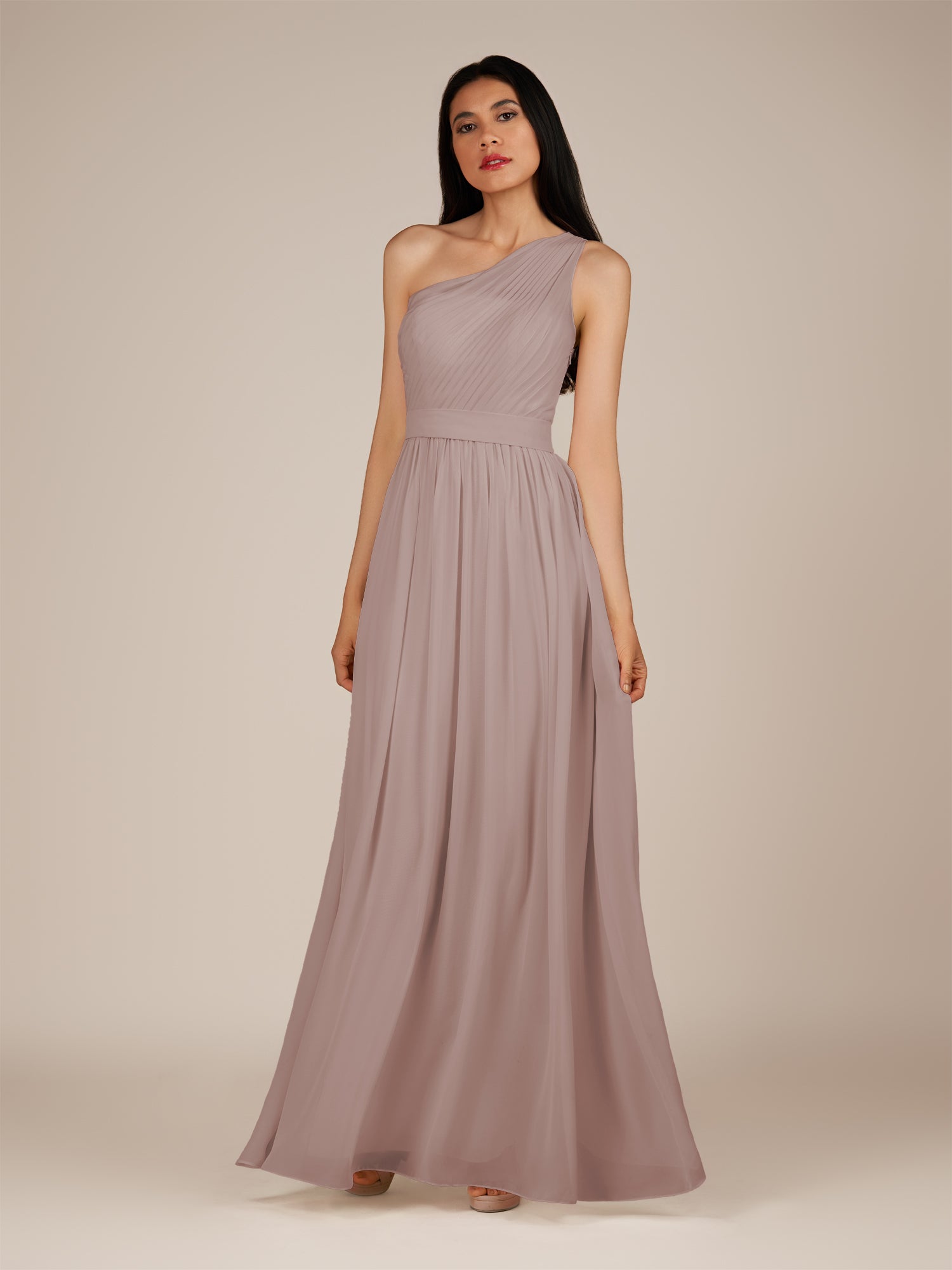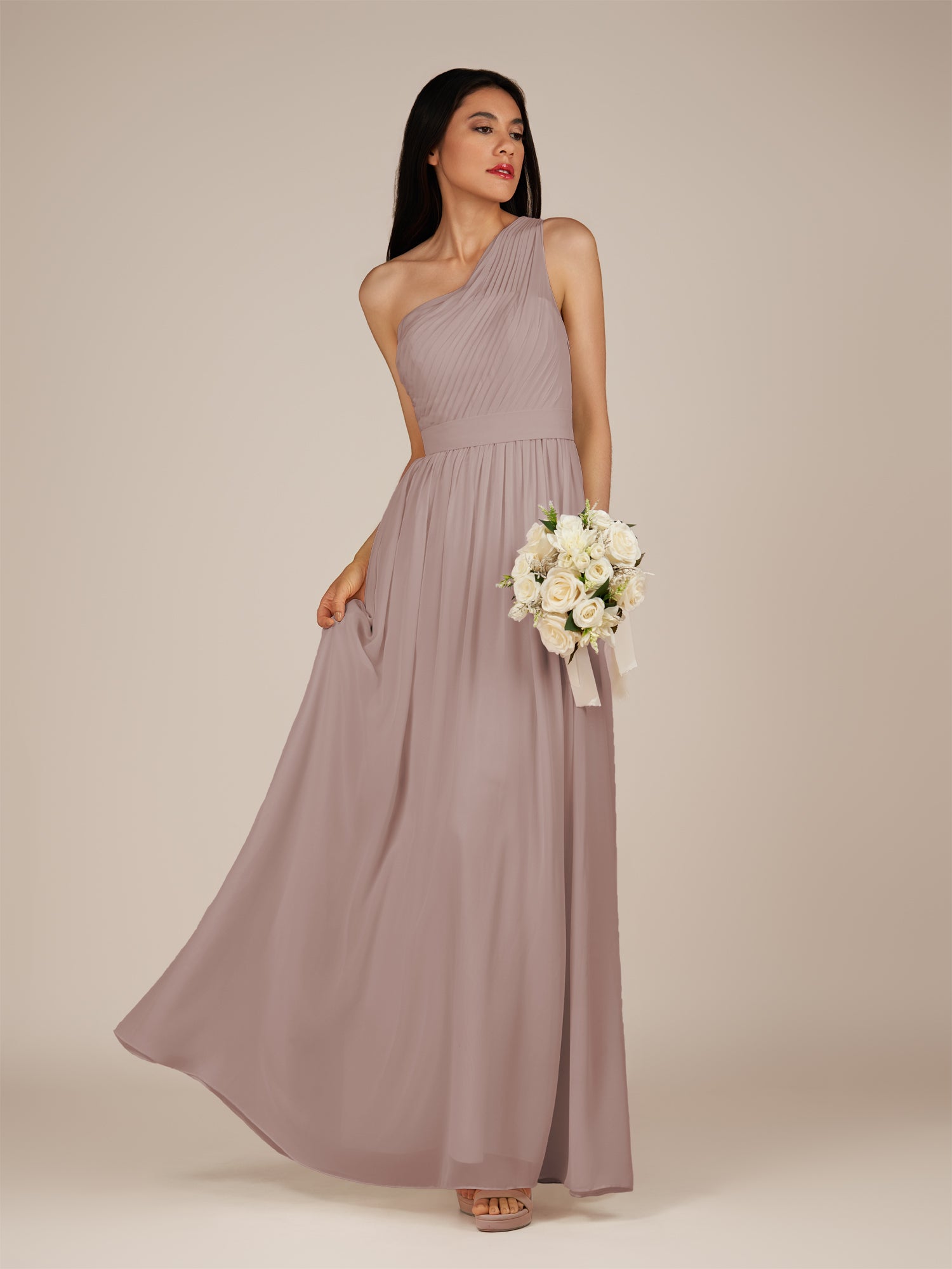 Juliet is a romantic and elegant choice for your bridal party. Crafted from soft chiffon, she features a flattering one-shoulder neckline and a delicately pleated bodice that enhances the waist. Her floor-length A-line skirt flows gracefully with every step, creating a timeless and feminine silhouette. Finished with a smooth zipper back, Juliet blends classic charm with effortless style, perfect for weddings and special occasions.