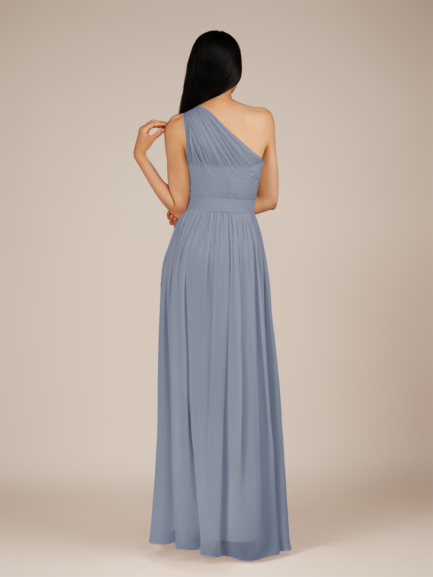 Juliet is a romantic and elegant choice for your bridal party. Crafted from soft chiffon, she features a flattering one-shoulder neckline and a delicately pleated bodice that enhances the waist. Her floor-length A-line skirt flows gracefully with every step, creating a timeless and feminine silhouette. Finished with a smooth zipper back, Juliet blends classic charm with effortless style, perfect for weddings and special occasions.