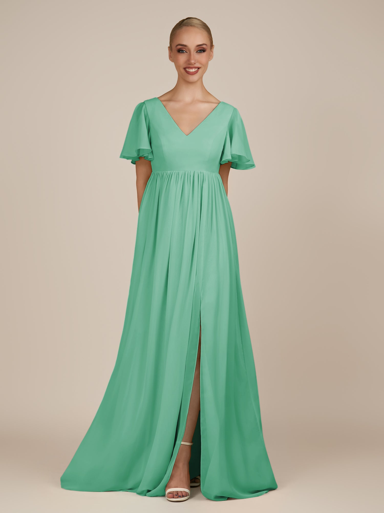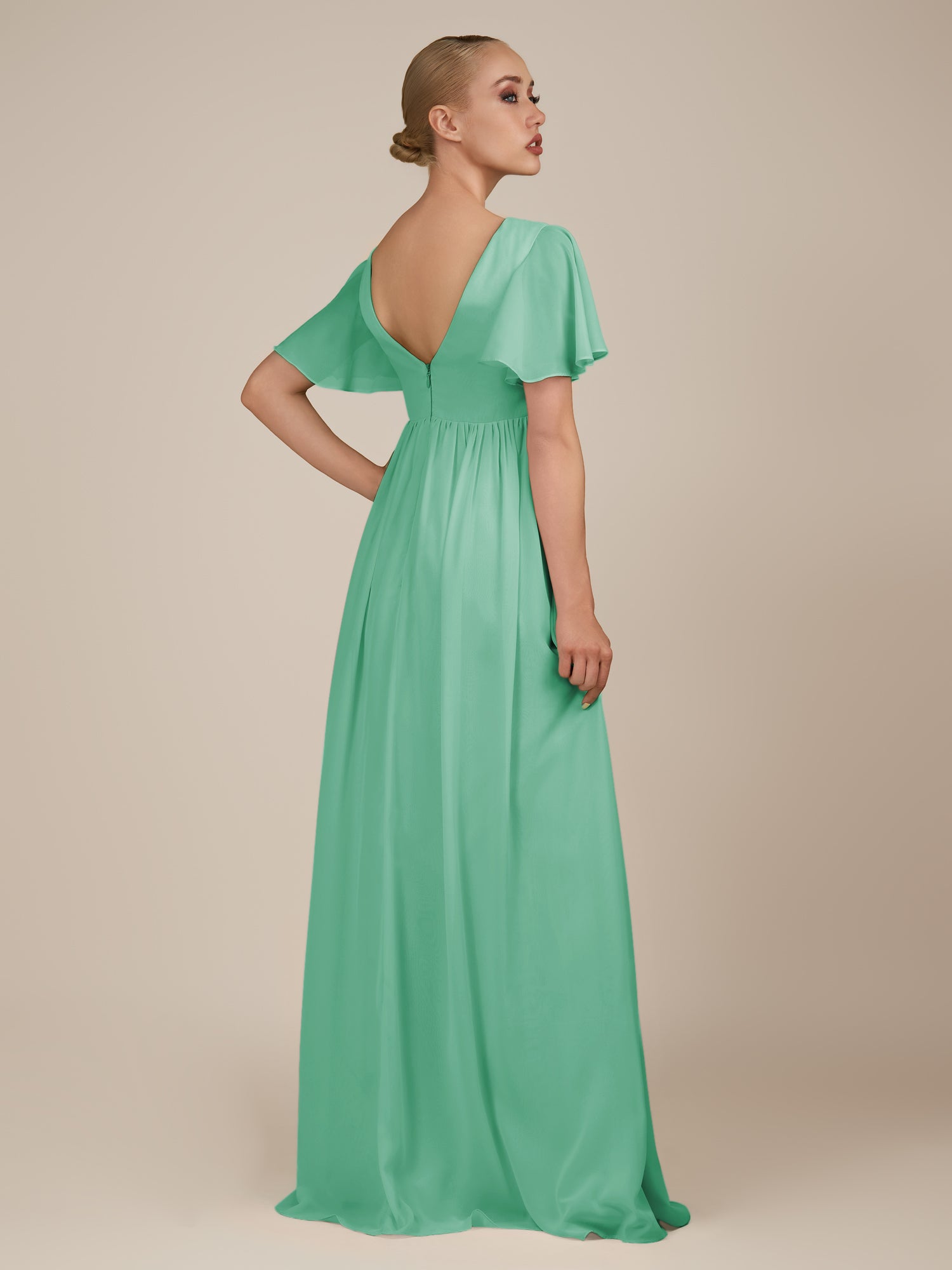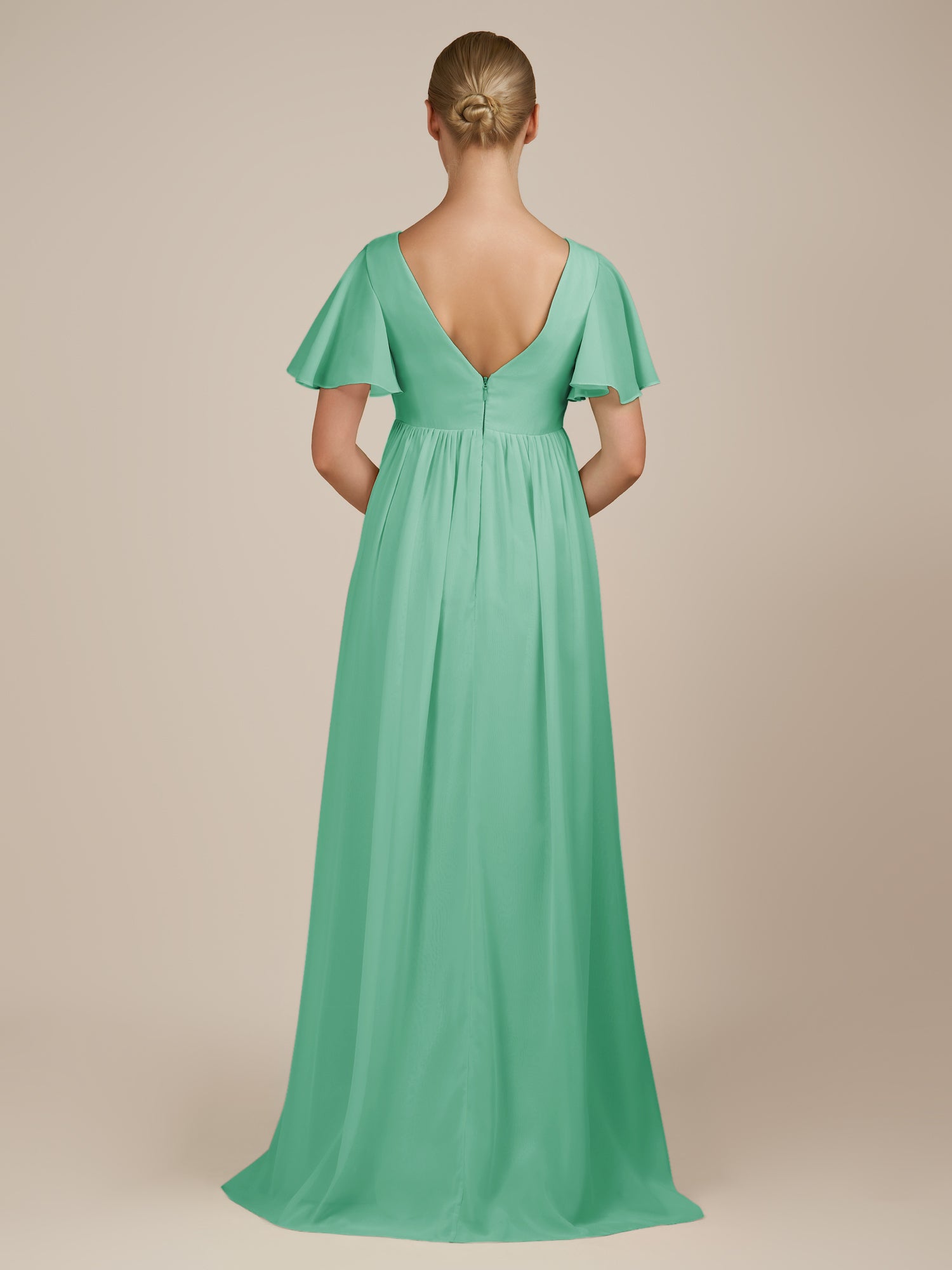 Junia is a charming and elegant choice for your bridal party. Crafted from soft chiffon, she features a flattering V neckline and delicate cap sleeves for a touch of romance. Her flowing A-line skirt moves gracefully with every step, accented by a subtle leg slit that adds modern sophistication. Finished with a smooth zipper back, Junia combines timeless elegance with effortless comfort, perfect for weddings and special celebrations.