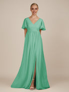 Junia | Turquoise - A Line V Neck Chiffon Cap Sleeves Long Bridesmaid Dress with Slit