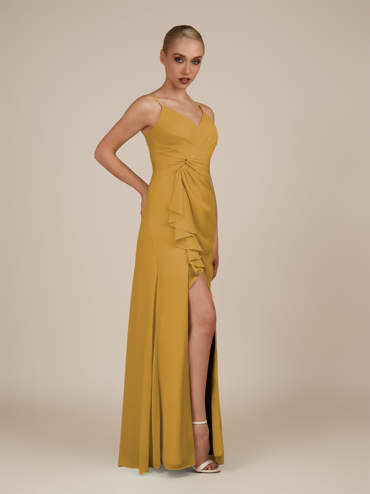 Lavatera | Marigold - A Line Chiffon V Neck Long Bridesmaid Dress with Ruffles