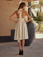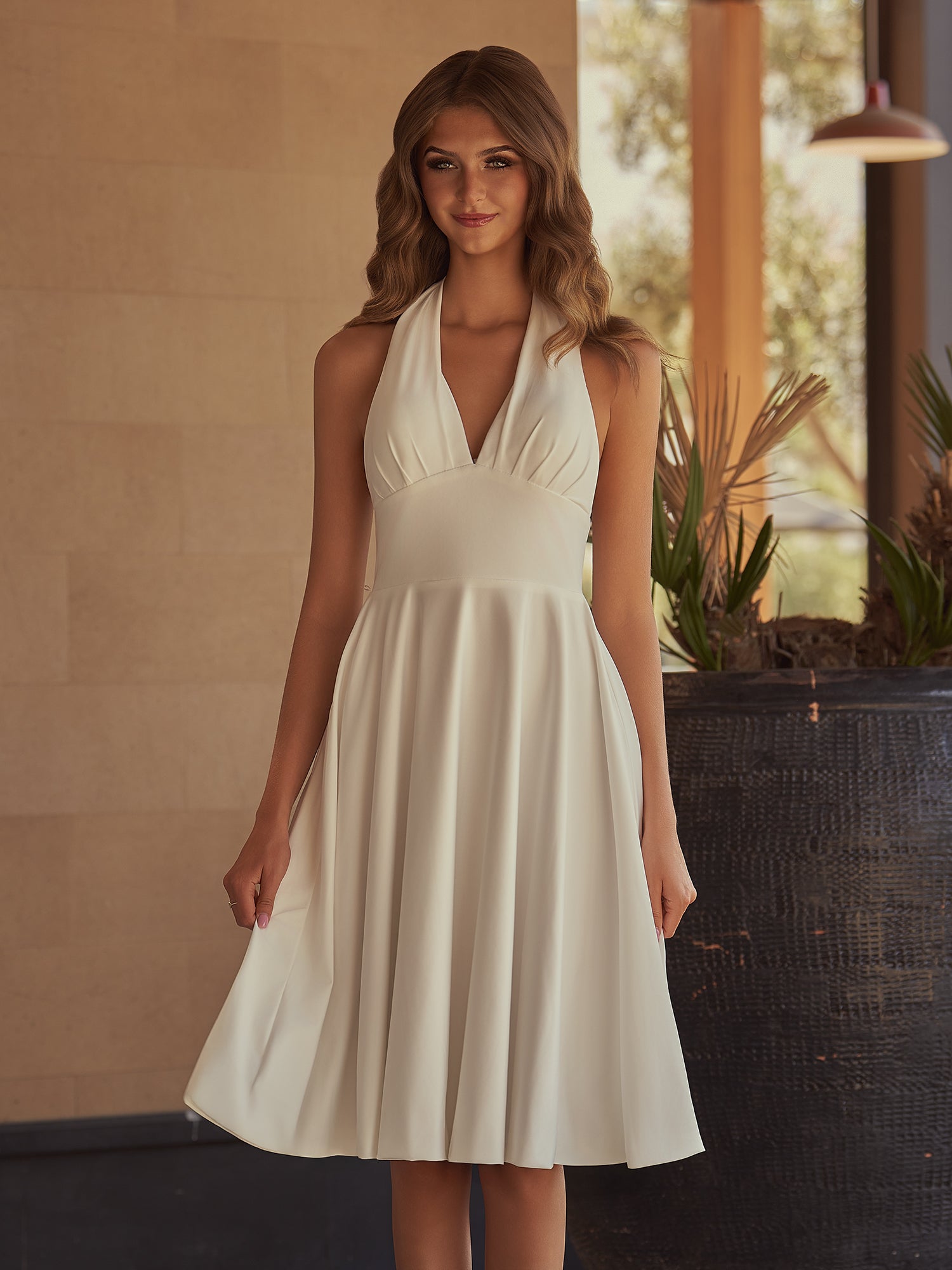 Step into an era of silver-screen elegance with the Marilyn homecoming dress, a tribute to Marilyn Monroe's iconic white dress moment. The flow and grace of the chiffon fabric channels Monroe's timeless allure, while the A-line style captures her signature sophistication. Dyed in the same pristine white as the dress Monroe made legendary, this gown promises to be a showstopper. The halter neckline, juxtaposed with a daring plunging V, whispers of old Hollywood charm, ensuring you shine like a classic starlet. As the midi-length flows around you, it’s hard not to feel the same magnetism Monroe radiated. Finished with a seamless zipper back, the Marilyn is not just a dress—it's a piece of history reborn.