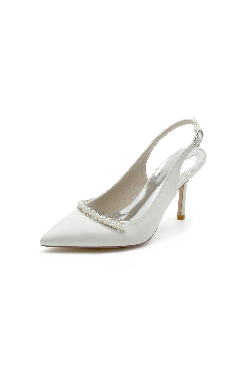 Elegant pearl-embellished peep toe slingback high heels, perfect for adding a touch of sophistication and glamour to any outfit.