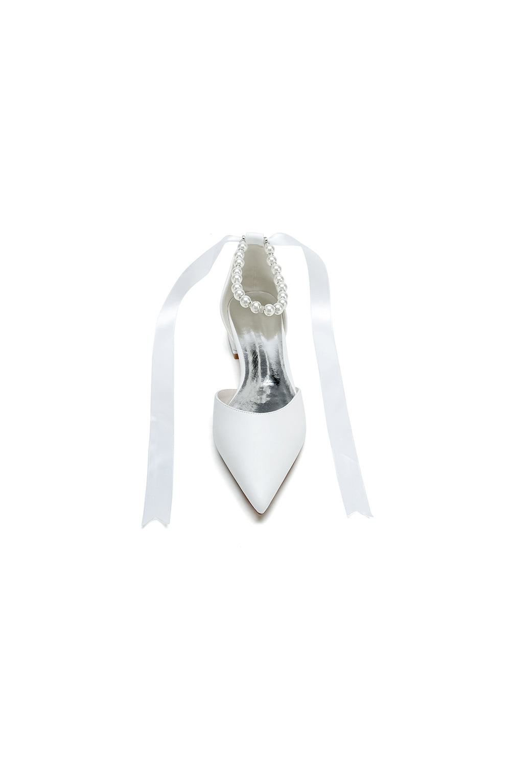 Elegant pointed toe ankle strap low heels adorned with pearl beads and delicate ivory ribbons, creating a timeless and chic look.