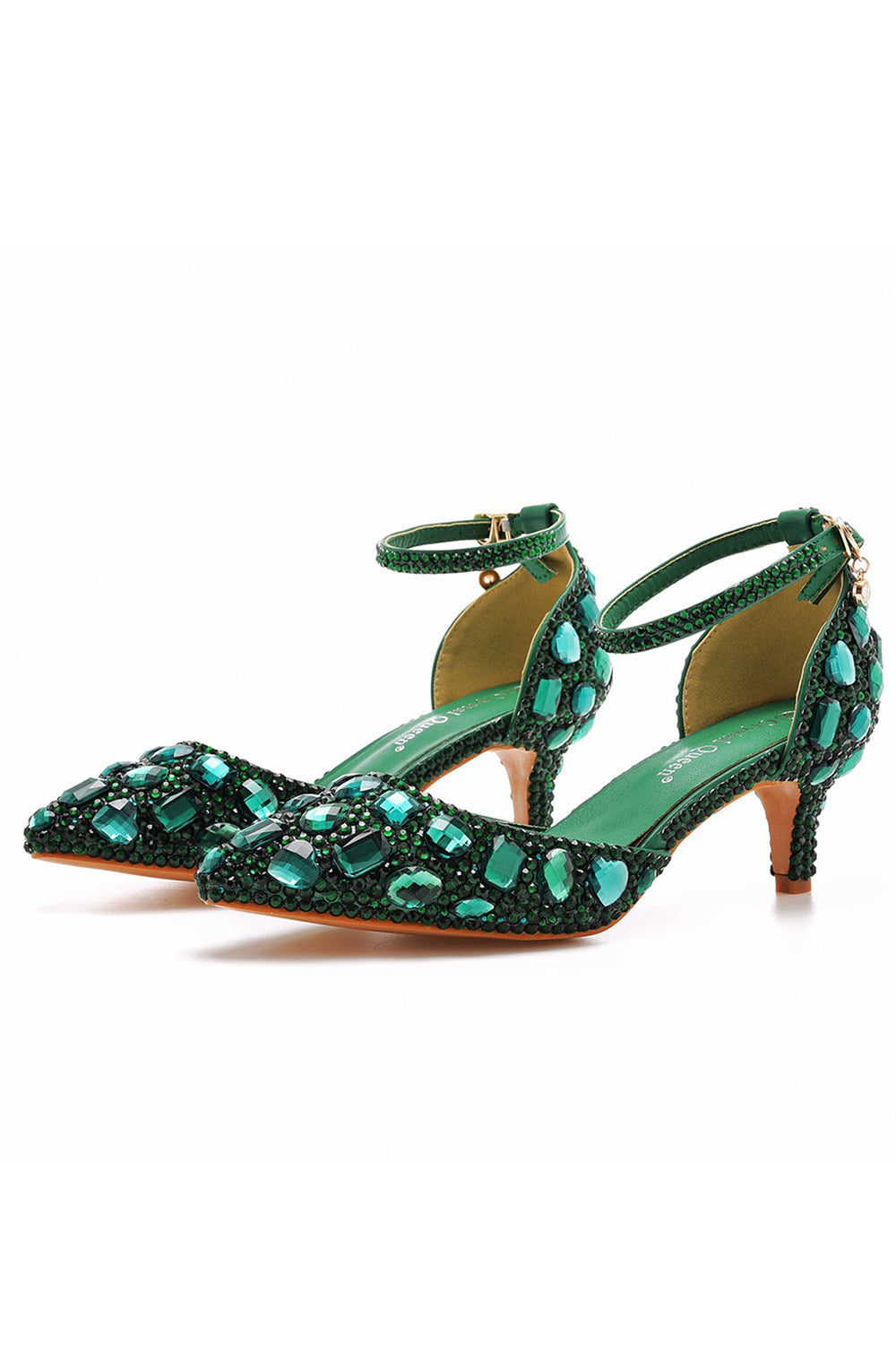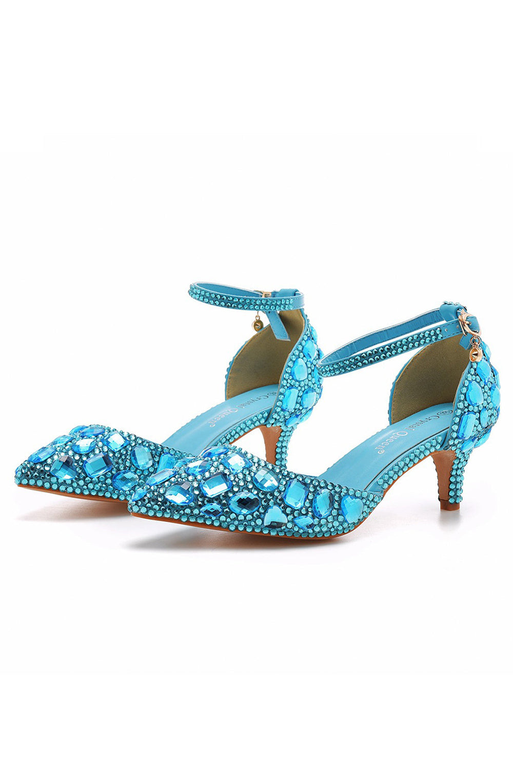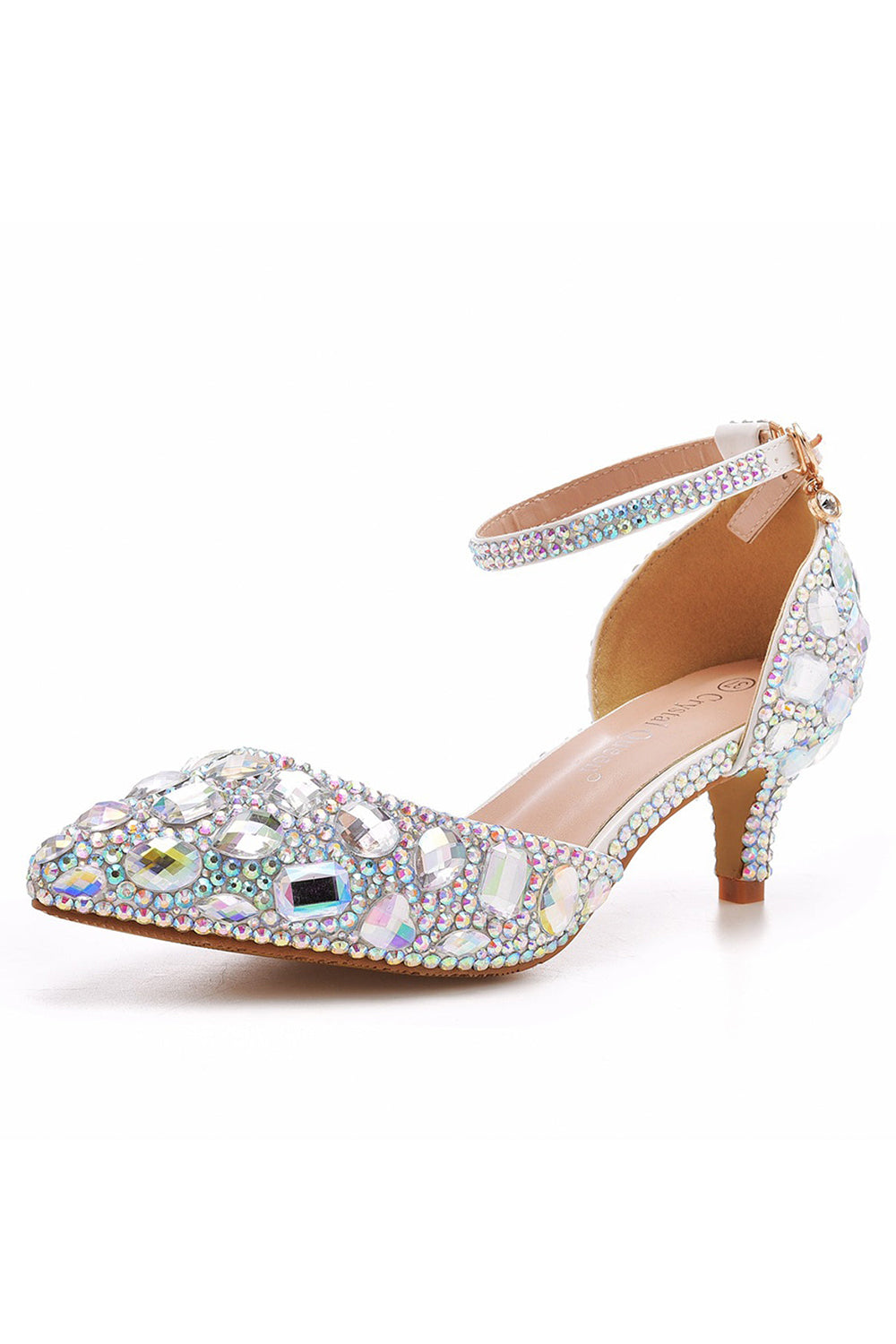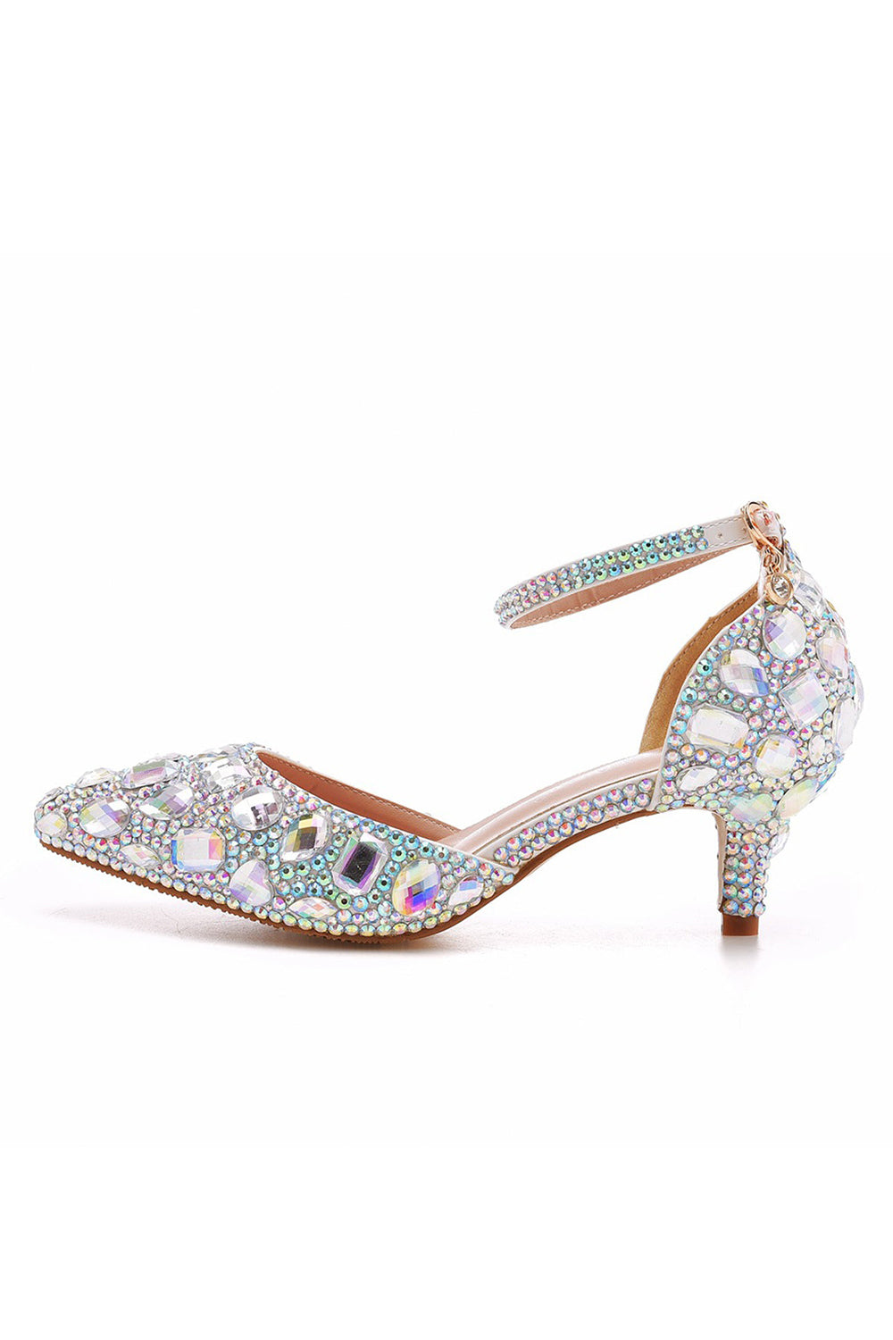 Pointed Toe Crystal Diamond Ankle Strap Kitten Heels