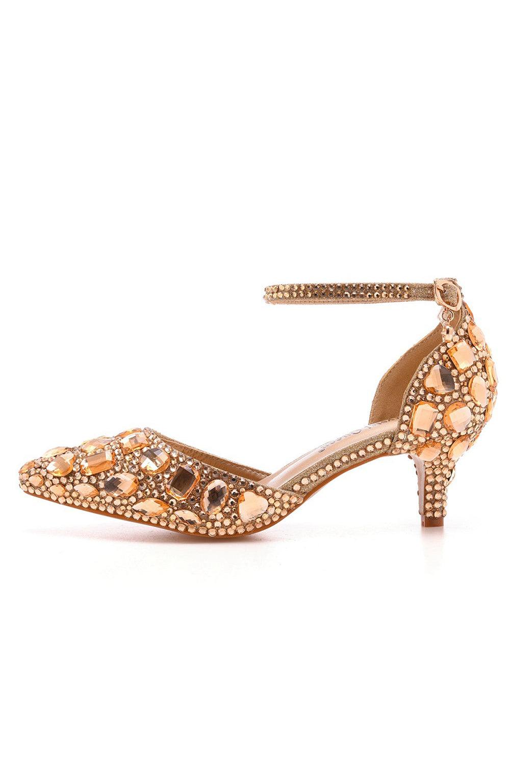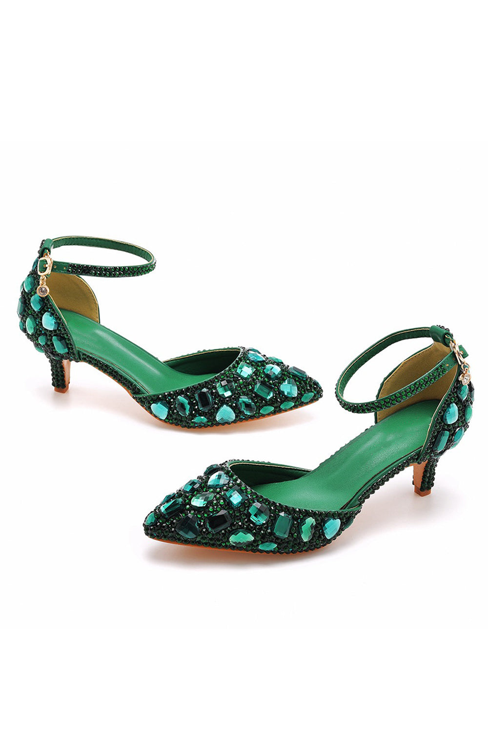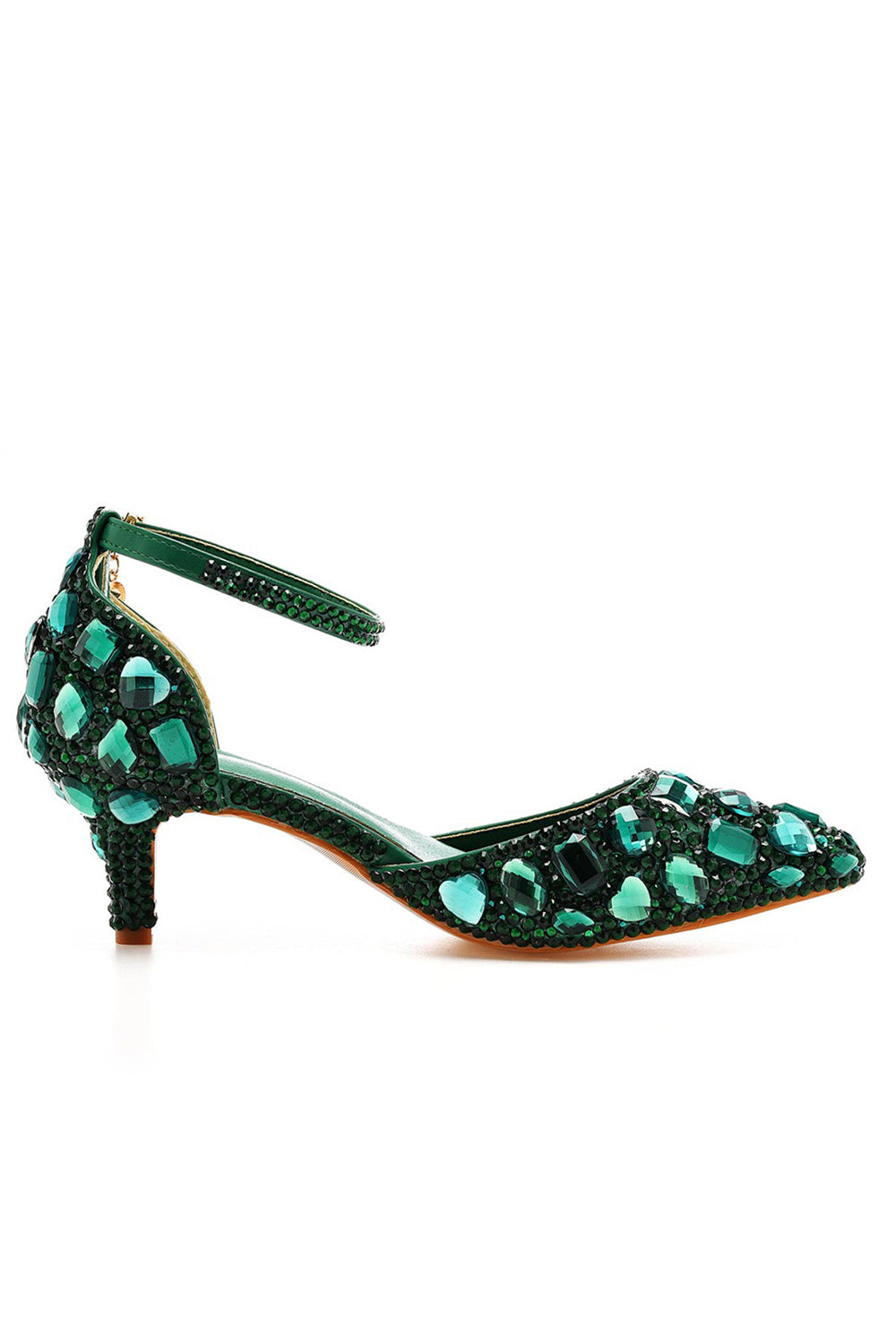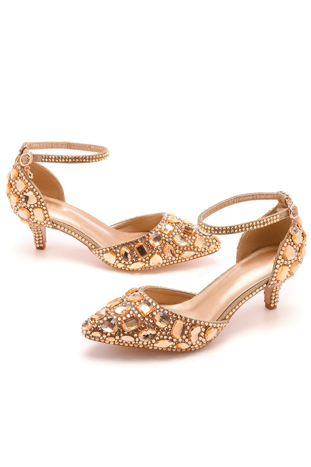 Pointed Toe Crystal Diamond Ankle Strap Kitten Heels