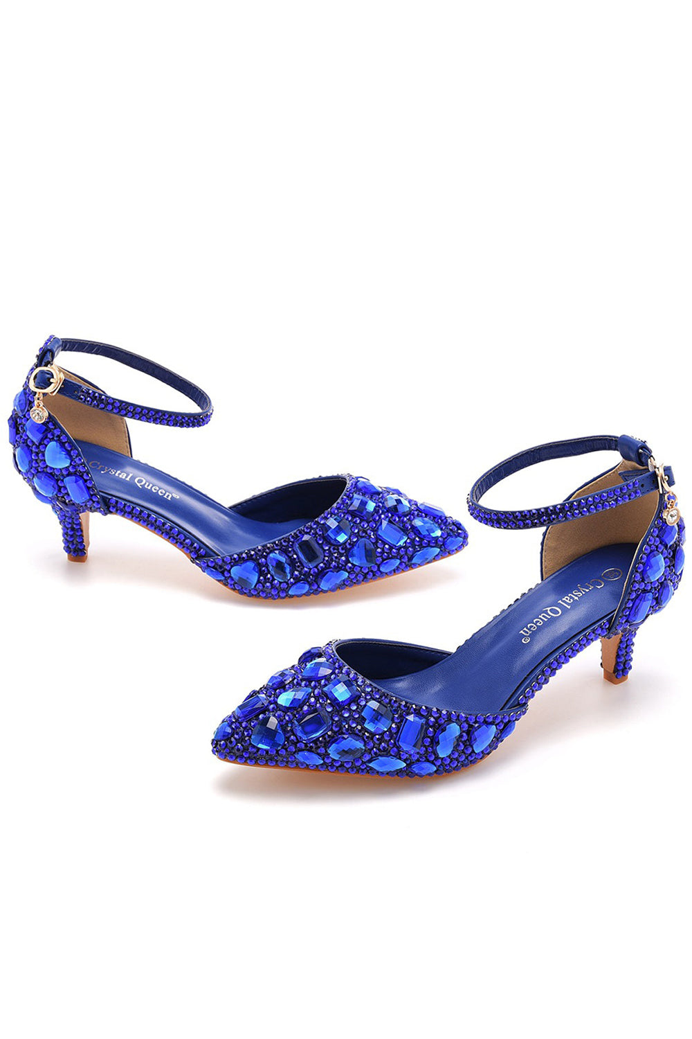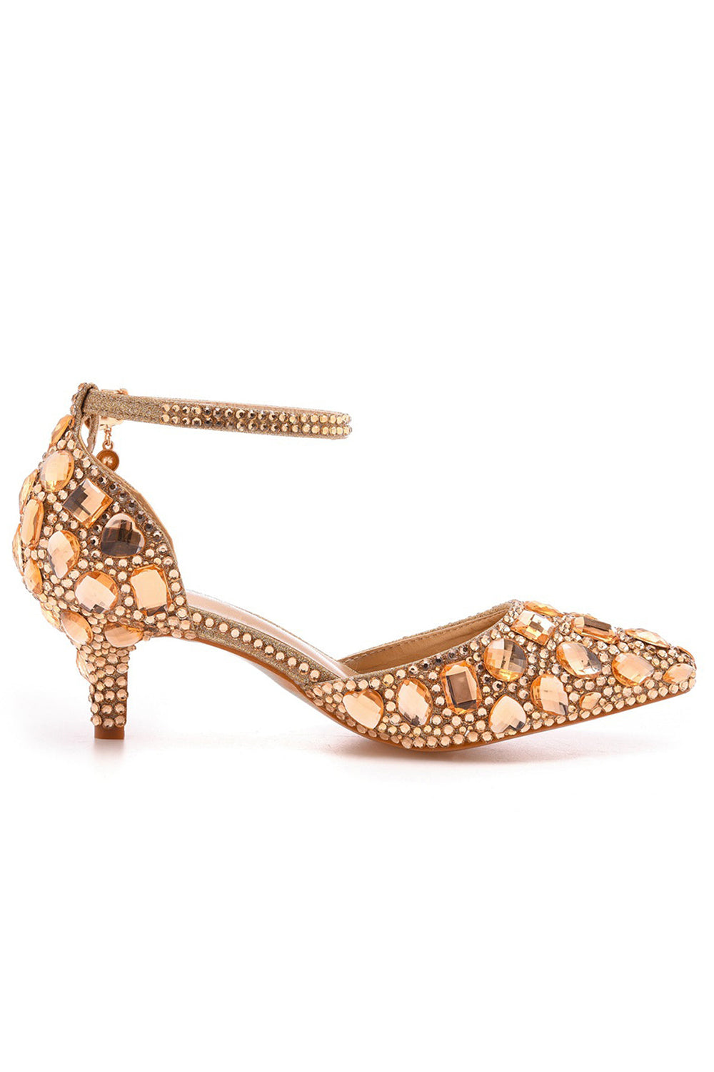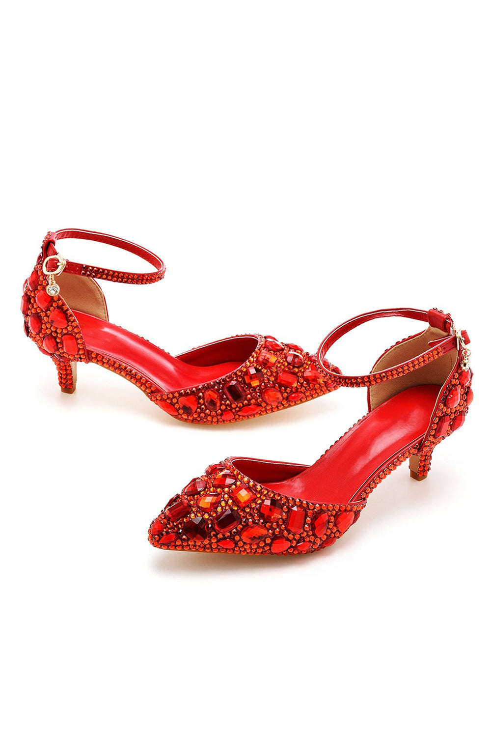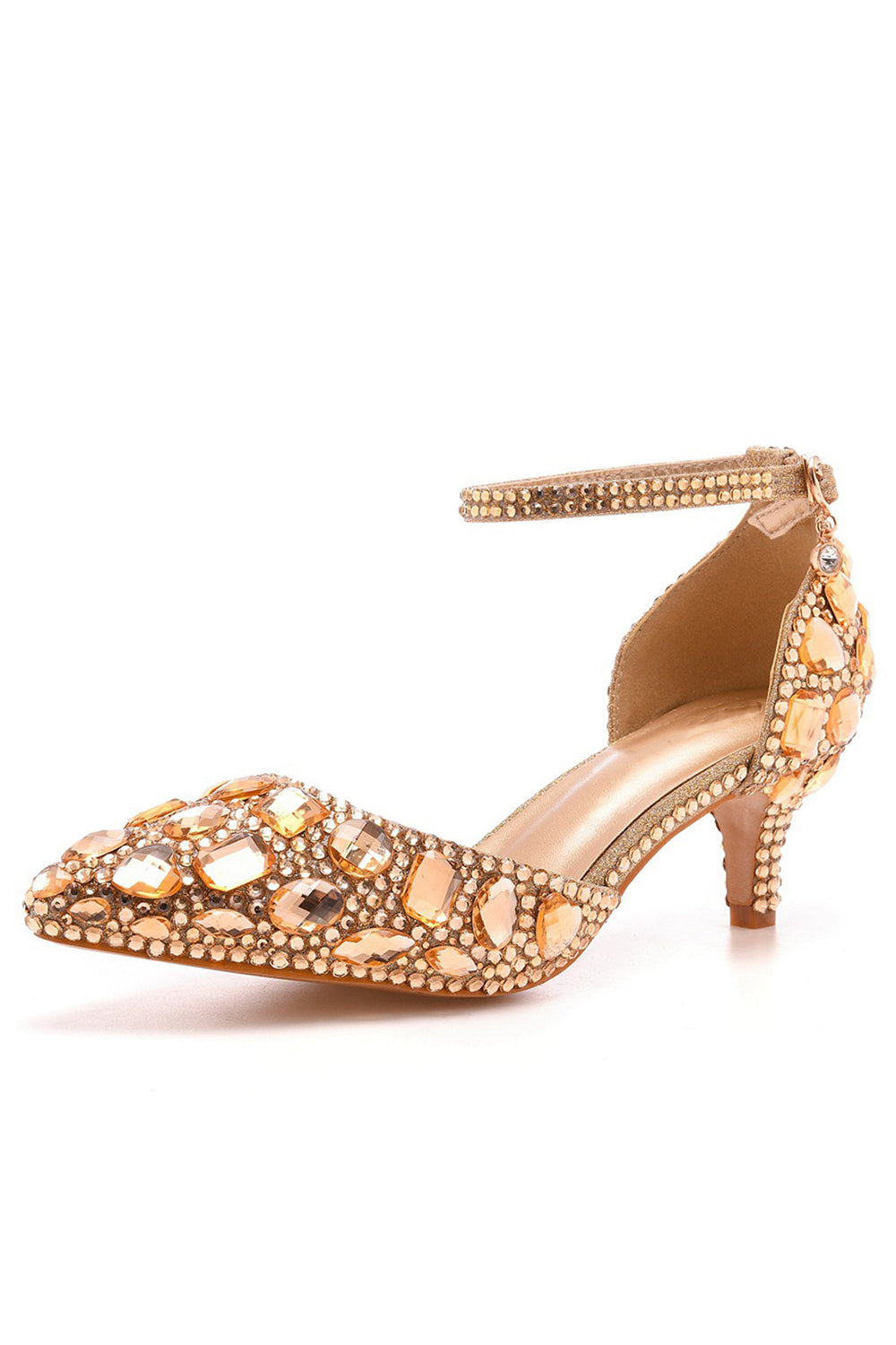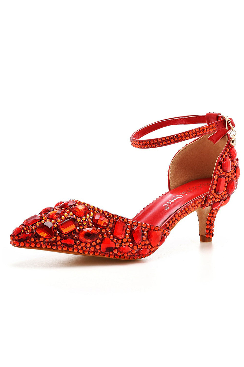Pointed Toe Crystal Diamond Ankle Strap Kitten Heels