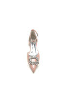 These sleek black leather flats exude elegance, perfect for both formal and semi-formal events. The pointed toe is embellished with a stunning cluster of sparkling crystals, adding a touch of glamour. A small, crystal-encrusted buckle on the ankle strap adds both style and security. The low-heel design offers comfort without compromising sophistication, allowing for extended wear. The inner sole has a glossy silver finish that complements the luxurious patent leather exterior.