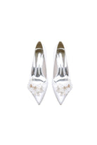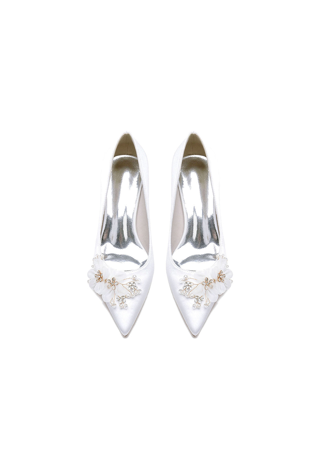 Stunning pointed toe white chunky heels embellished with sparkling rhinestones and a delicate flower accent, perfect for adding a touch of glamour and femininity to any outfit.