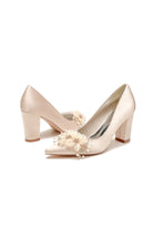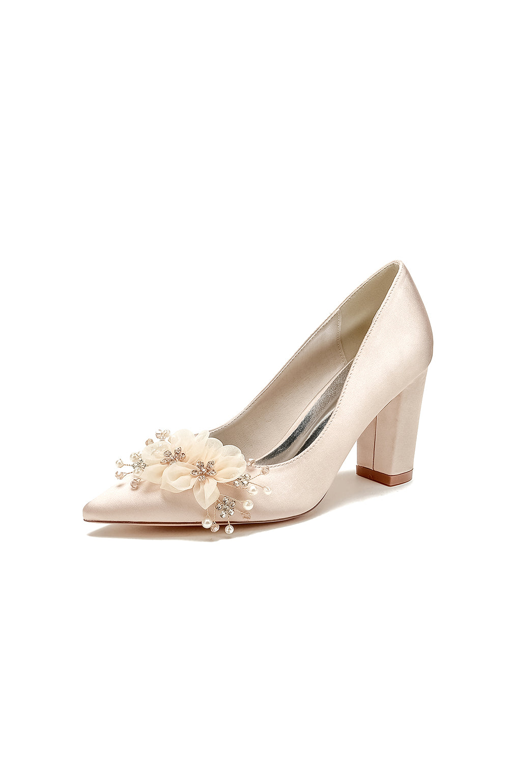 Pointed Toe White Rhinestone Chunky Heels with Flower