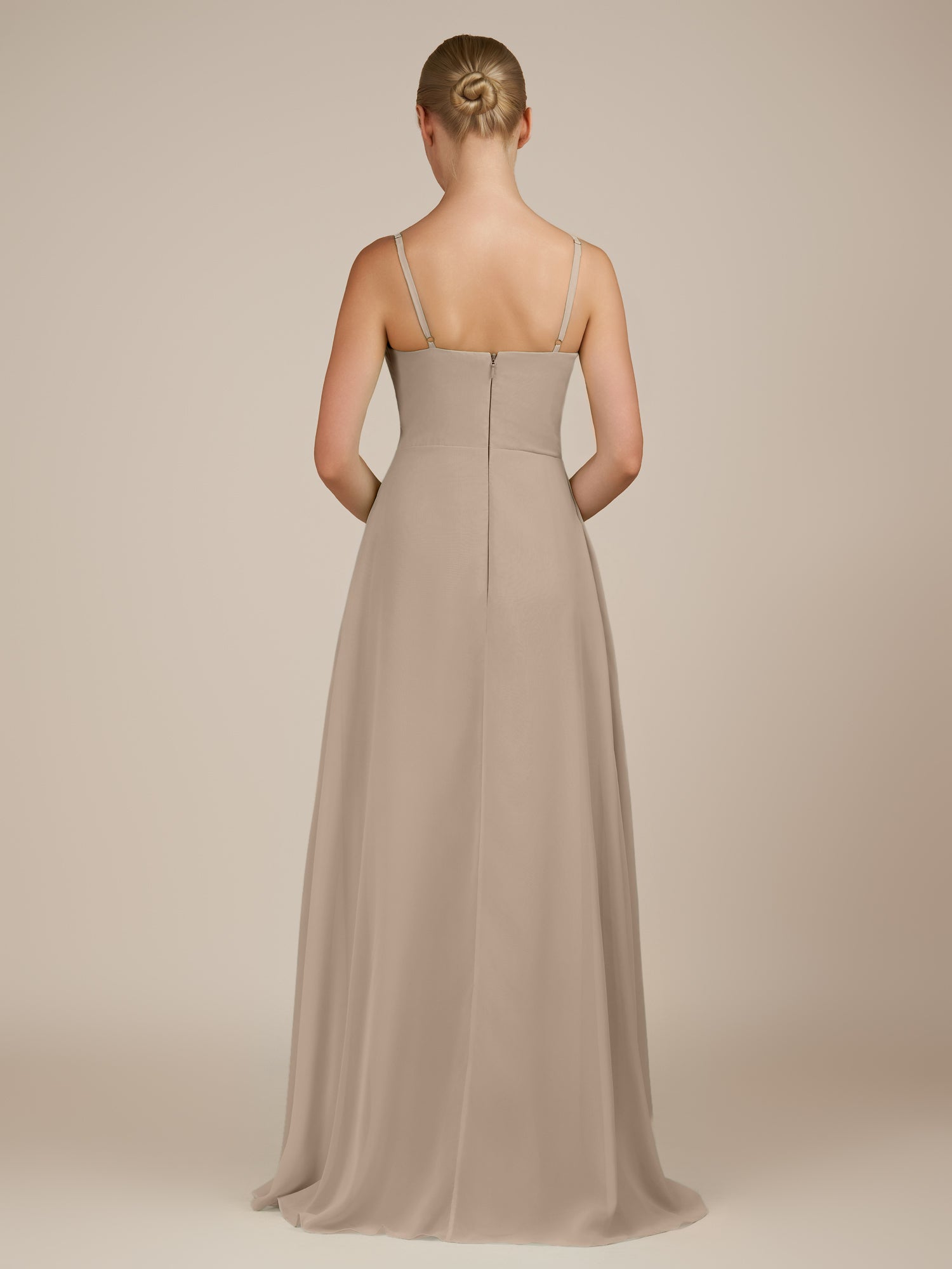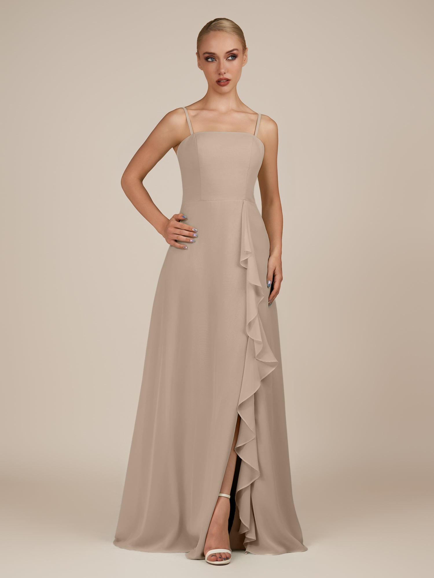 Queniva is a delicate and stylish choice for your bridal party. Crafted from soft chiffon, she features slender spaghetti straps and a sleek sheath silhouette that flatters every figure. Her floor-length skirt flows effortlessly, enhanced by gentle ruffles and a subtle leg slit for graceful movement. Finished with a smooth zipper back, Queniva brings timeless elegance and modern charm to weddings and special celebrations.