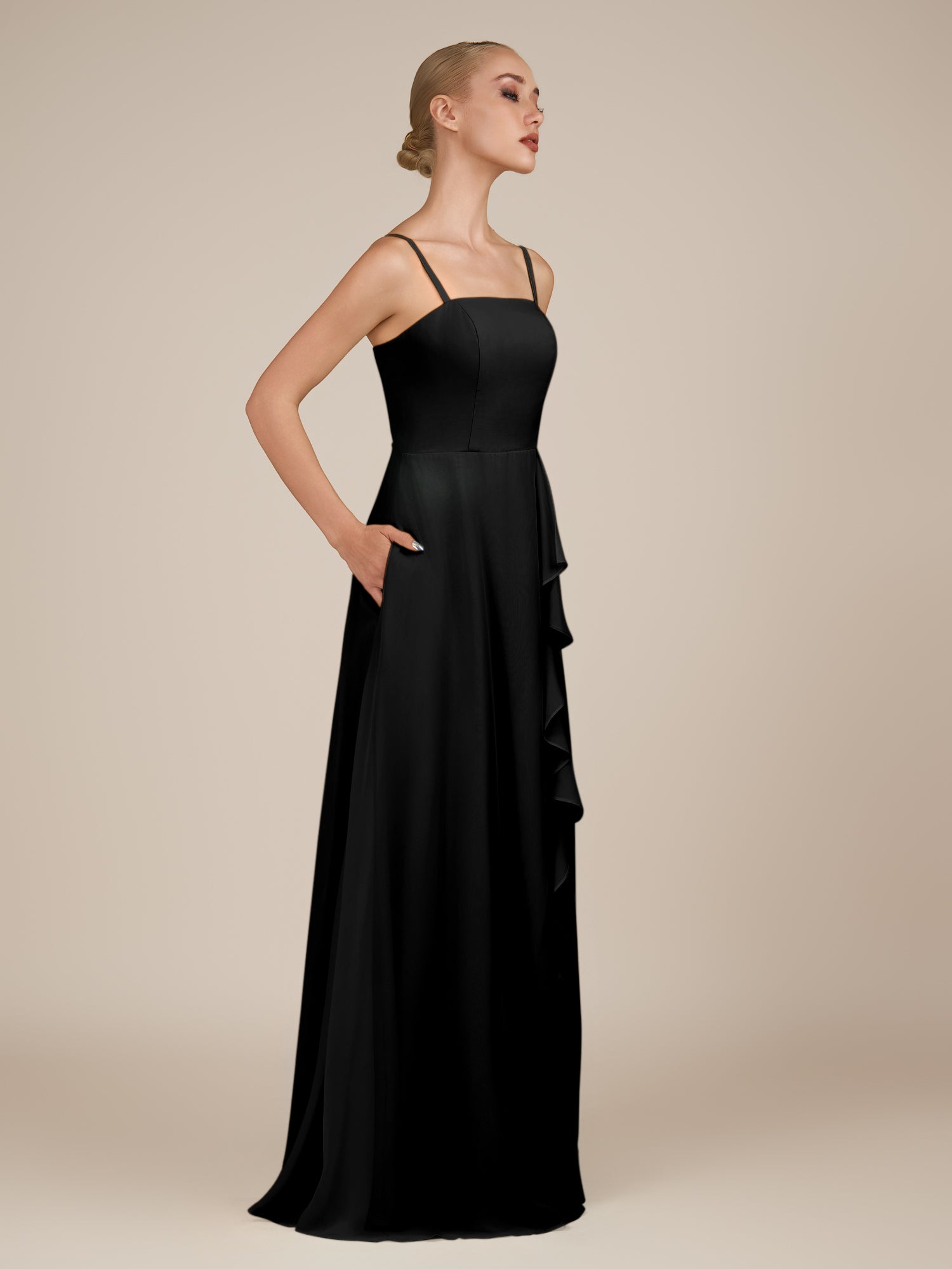Queniva is a delicate and stylish choice for your bridal party. Crafted from soft chiffon, she features slender spaghetti straps and a sleek sheath silhouette that flatters every figure. Her floor-length skirt flows effortlessly, enhanced by gentle ruffles and a subtle leg slit for graceful movement. Finished with a smooth zipper back, Queniva brings timeless elegance and modern charm to weddings and special celebrations.