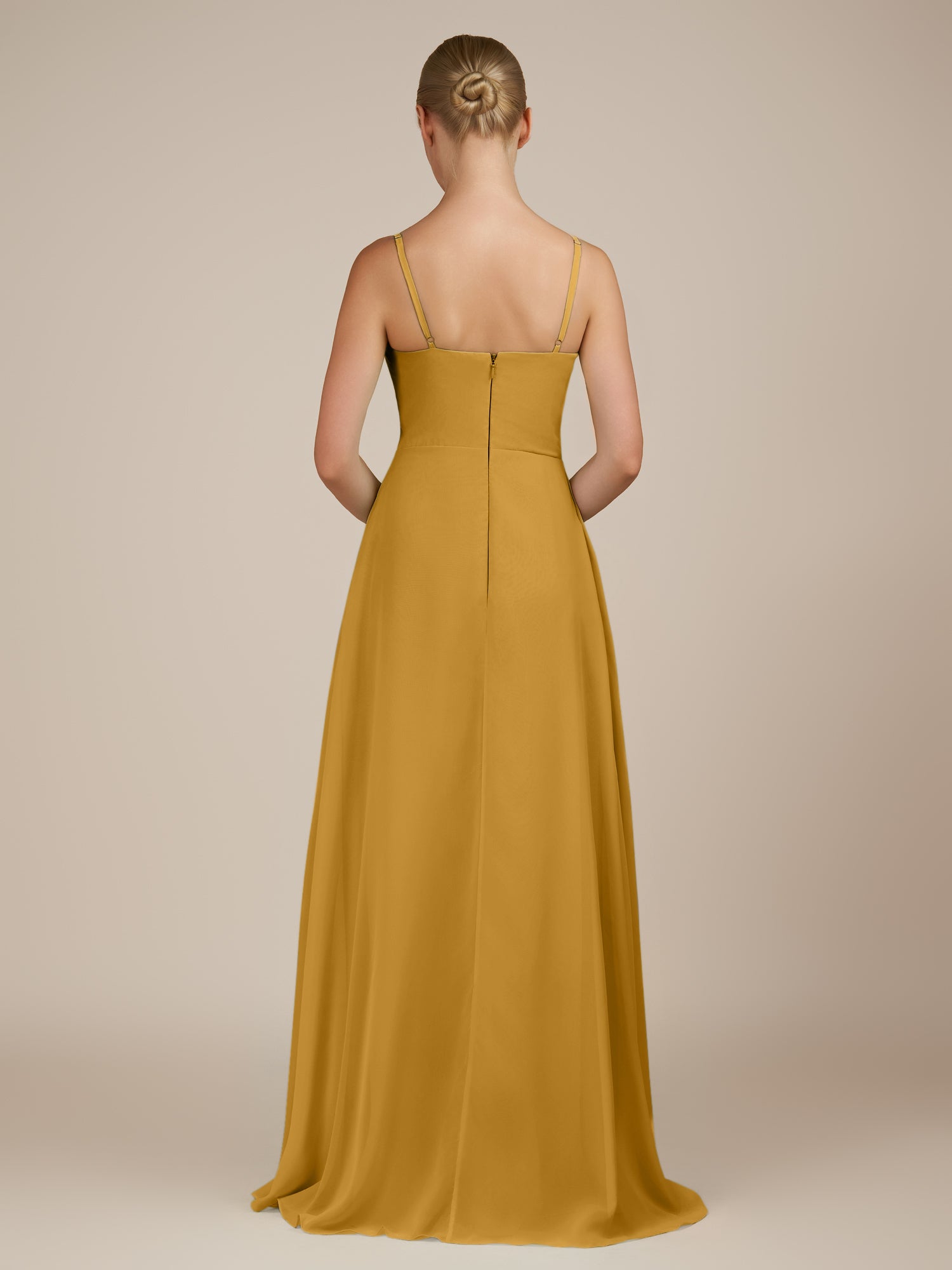 Queniva is a delicate and stylish choice for your bridal party. Crafted from soft chiffon, she features slender spaghetti straps and a sleek sheath silhouette that flatters every figure. Her floor-length skirt flows effortlessly, enhanced by gentle ruffles and a subtle leg slit for graceful movement. Finished with a smooth zipper back, Queniva brings timeless elegance and modern charm to weddings and special celebrations.