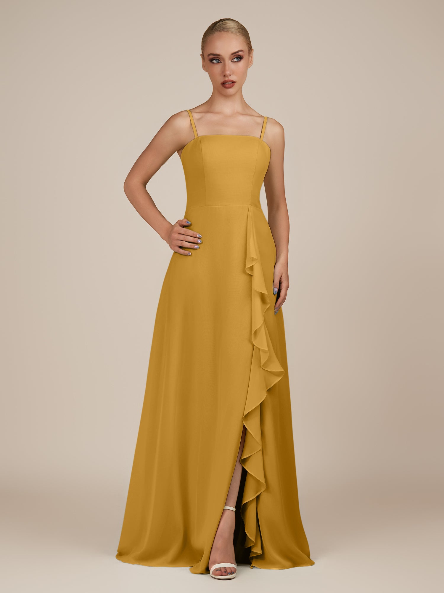 Queniva | Marigold - Sheath Chiffon Spaghetti Straps Ruffles Long Bridesmaid Dress with Slit