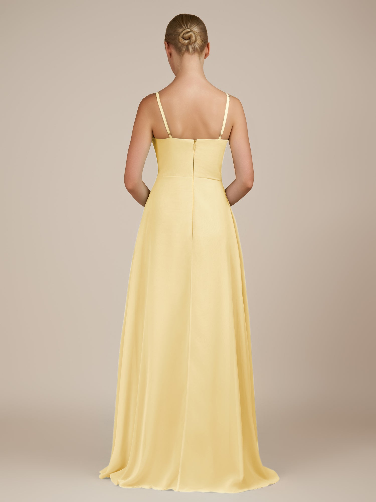Queniva is a delicate and stylish choice for your bridal party. Crafted from soft chiffon, she features slender spaghetti straps and a sleek sheath silhouette that flatters every figure. Her floor-length skirt flows effortlessly, enhanced by gentle ruffles and a subtle leg slit for graceful movement. Finished with a smooth zipper back, Queniva brings timeless elegance and modern charm to weddings and special celebrations.