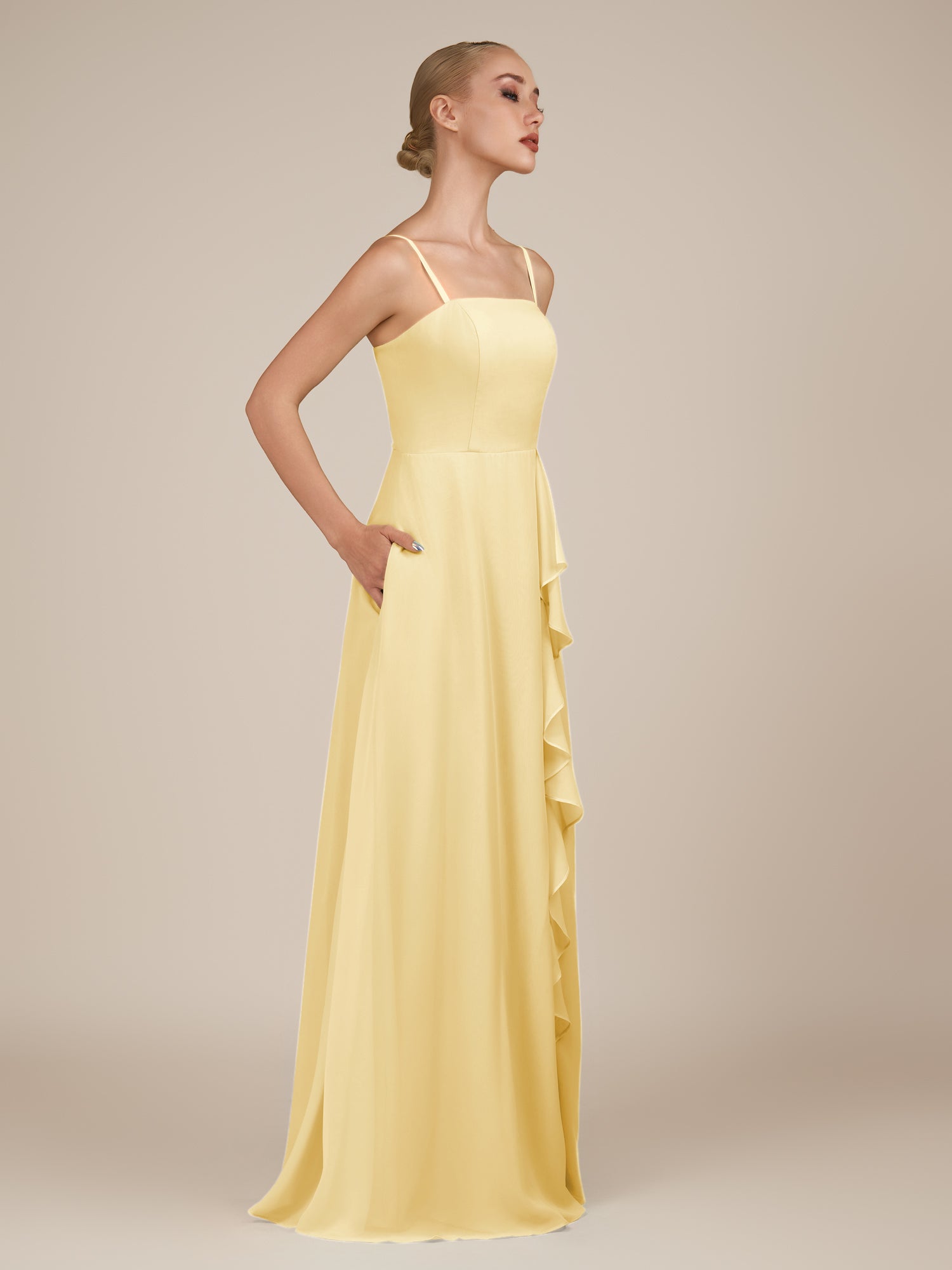 Queniva | Pastel Yellow - Sheath Chiffon Spaghetti Straps Ruffles Long Bridesmaid Dress with Slit