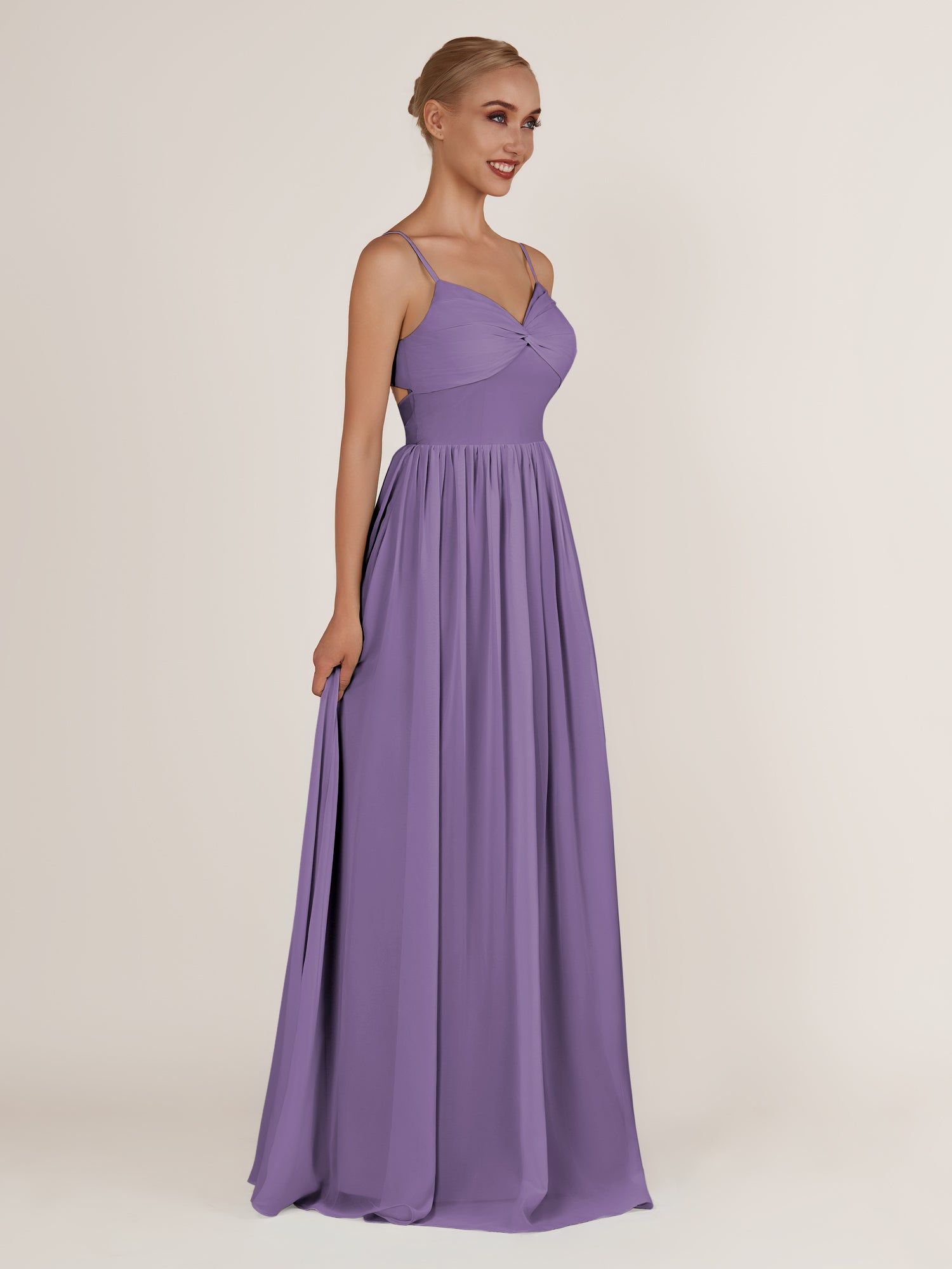 Quillaine is a graceful and sophisticated choice for your bridal party. Crafted from soft chiffon, she features a flattering V neckline with a subtle twist detail at the bodice that adds elegance and charm. Her floor-length A-line skirt flows effortlessly with every step, enhanced by a delicate leg slit for ease and modern appeal. Finished with a smooth zipper back, Quillaine blends timeless style with comfortable wear for weddings and special occasions.