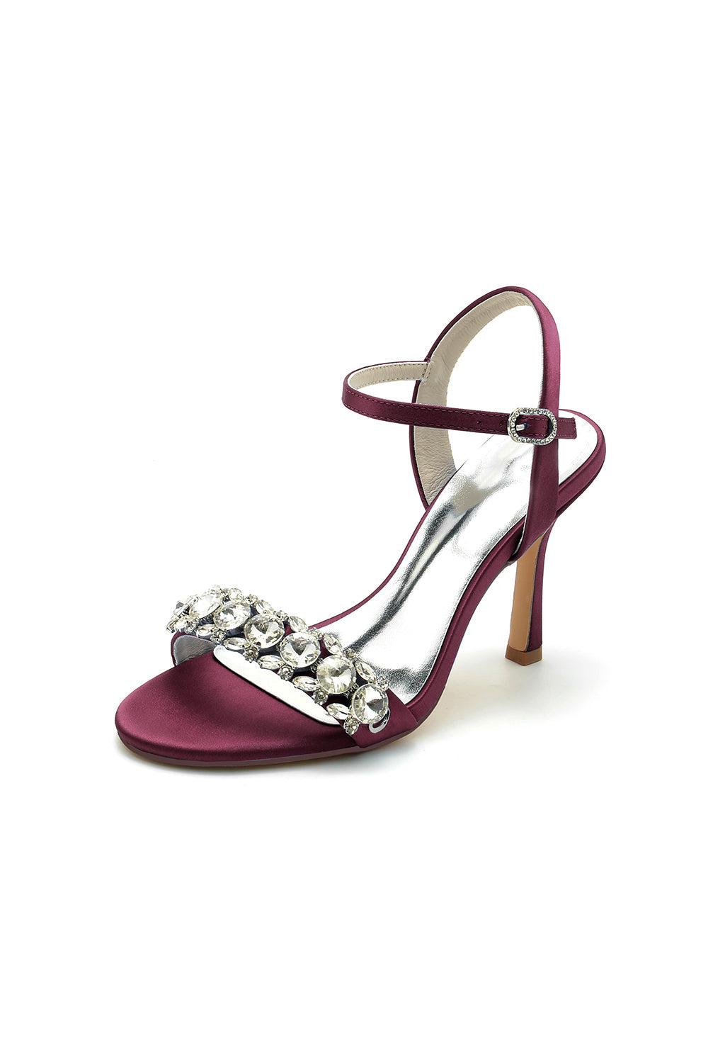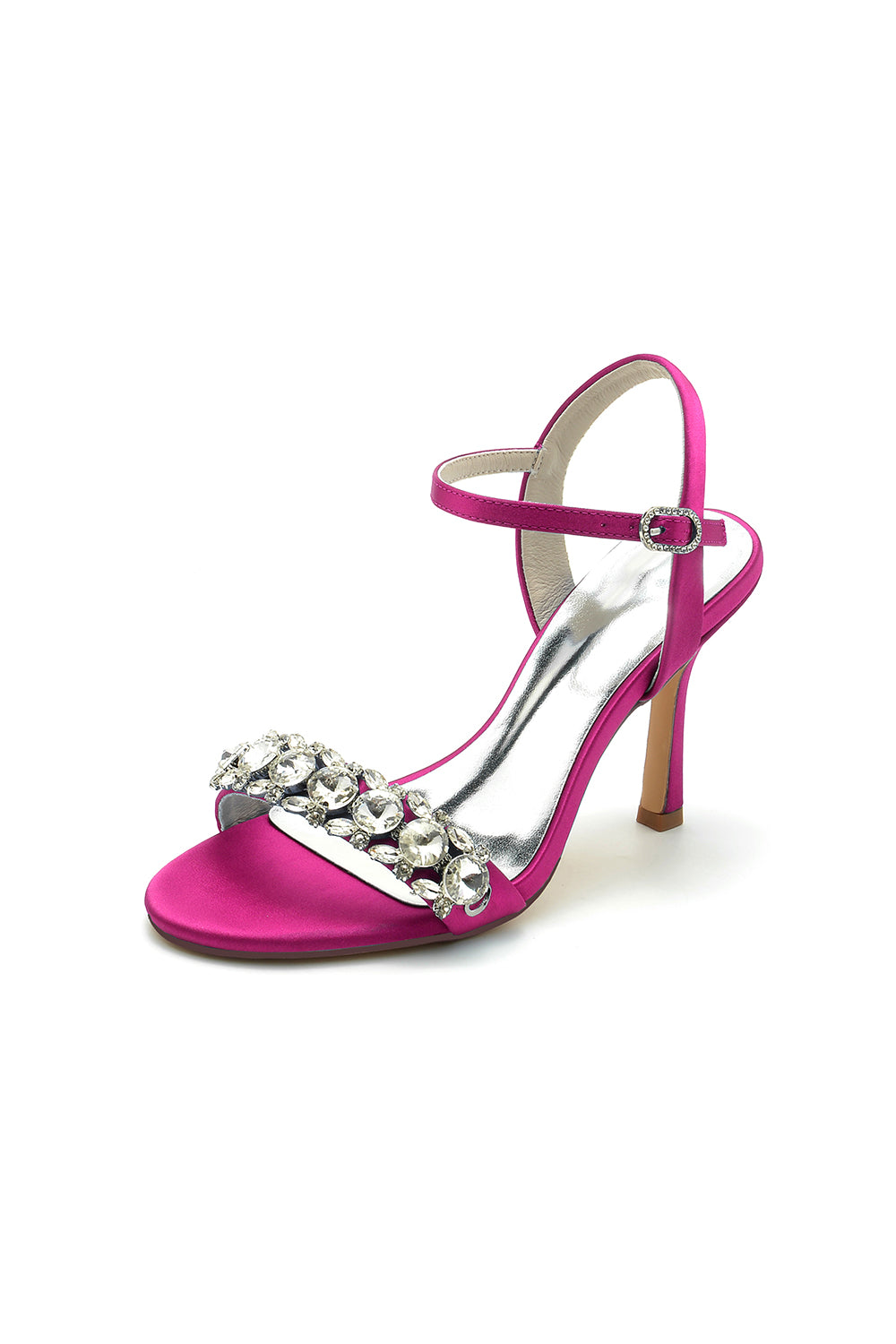These stunning heels feature a luxurious satin upper and are embellished with shimmering rhinestones across the front strap, perfect for making a statement at weddings, galas, or formal events. The adjustable ankle strap with a rhinestone buckle adds both elegance and security, ensuring a perfect fit. With a graceful stiletto heel and open-toe design, these shoes offer sophistication and glamour. The smooth artificial leather lining provides comfort, while the durable rubber sole ensures stability for any occasion. Elevate your style effortlessly with these dazzling heels.