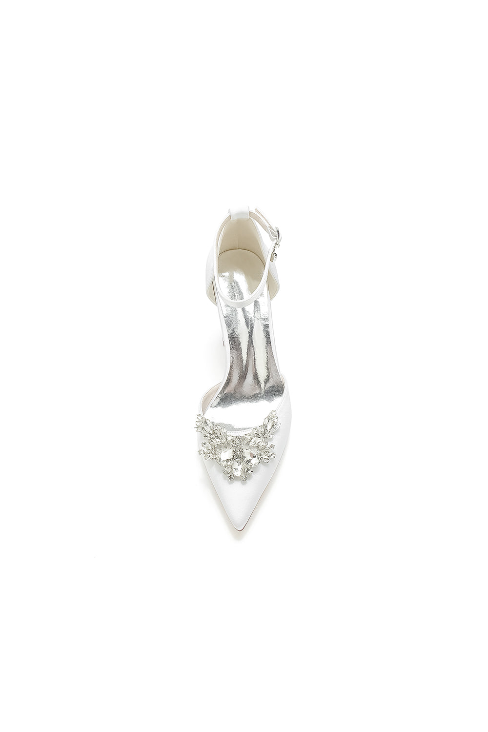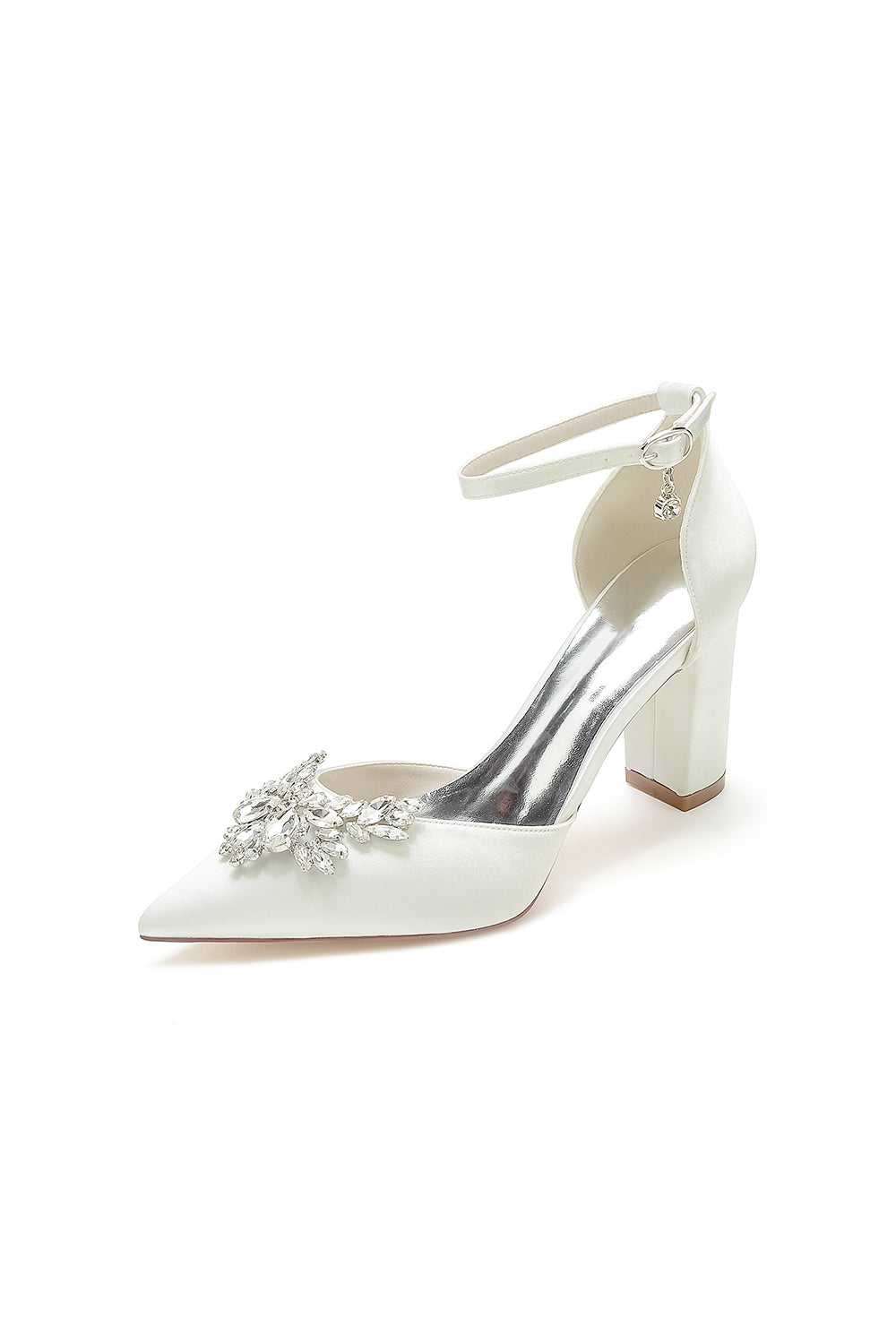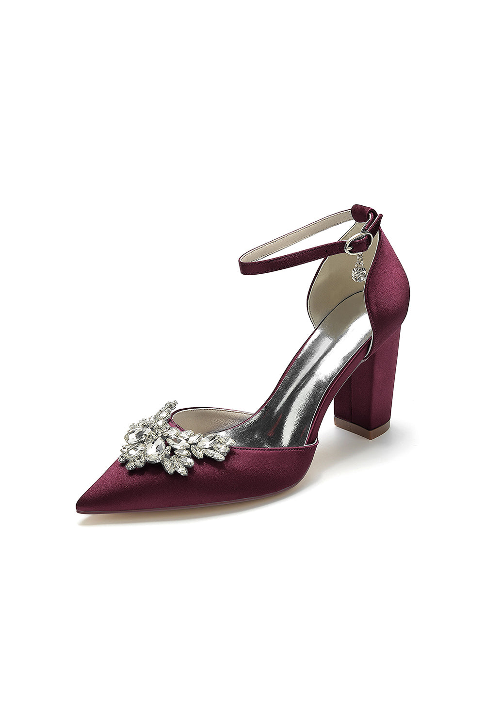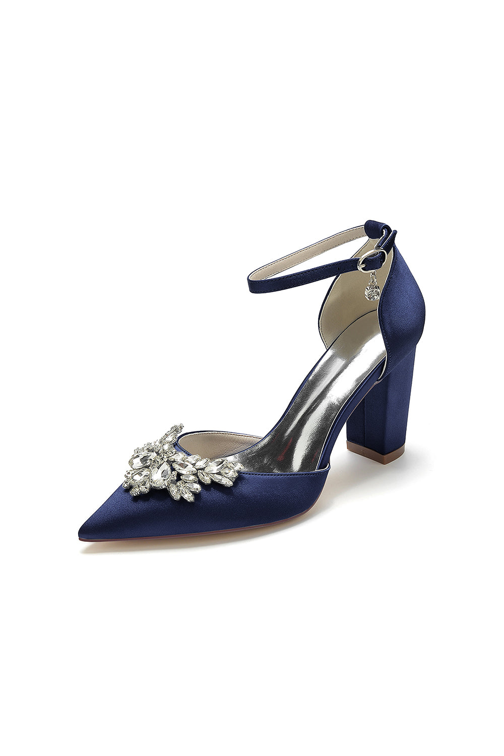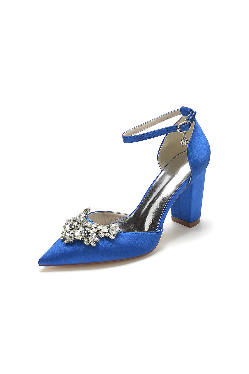 Elevate your style with our Rhinestone Pointed Toe Ankle Strap Satin Chunky Heel. These shoes are made with sparkling rhinestones, it features a pointed toe for a sophisticated touch and an ankle strap for added support. The satin material adds a luxurious feel to any outfit. Walk confidently in these chic heels.