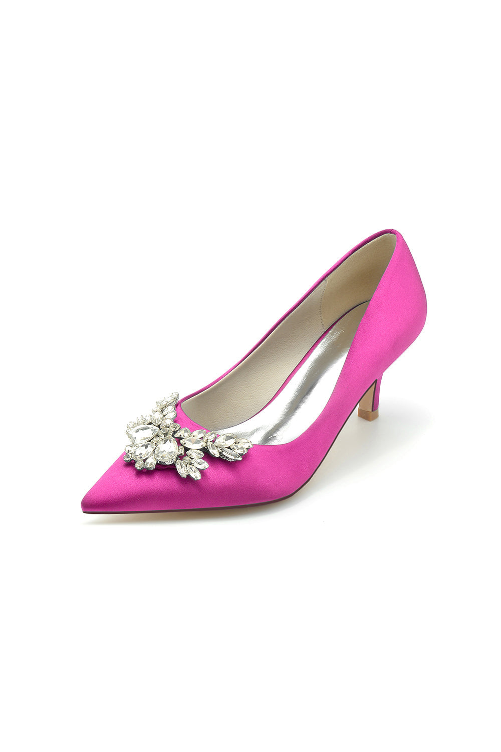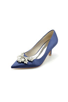 Add a touch of glamour to your wardrobe with the Rhinestone Pointed Toe Satin Kitten Heels. It is made with a luxurious satin upper, these heels exude refinement, while the artificial leather lining ensures comfort throughout the day. The slip-on style makes them easy to wear, and the durable rubber sole offers excellent traction. The sleek 2.16-inch kitten heel provides just the right amount of height for comfort and poise, while the pointed toe design adds sophistication and elongates the legs.?Featuring elegant rhinestone embellishments, these heels bring a subtle sparkle to any outfit, making them ideal for both formal and casual occasions.?