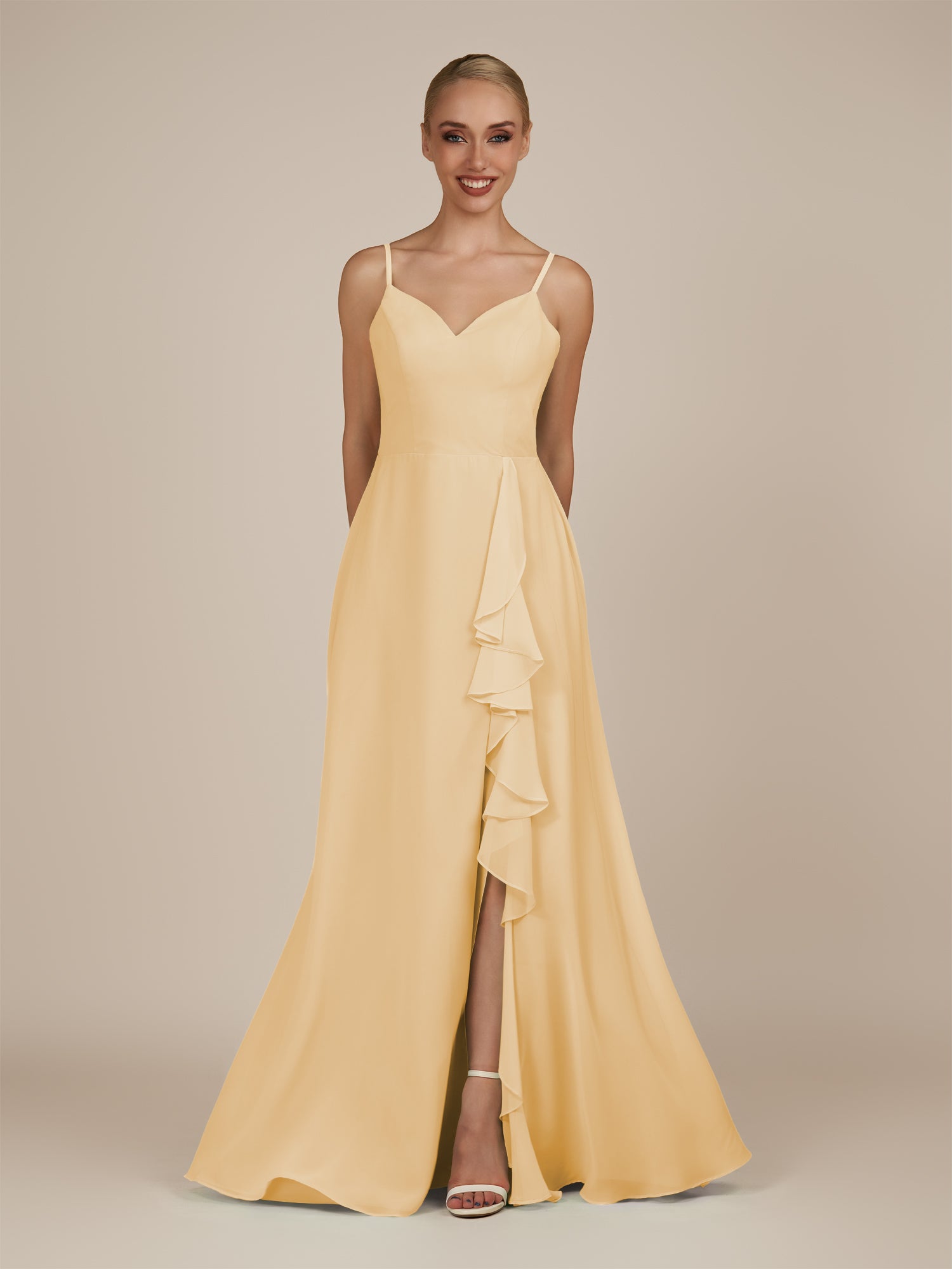 Rhonda | Sheath Chiffon V Neck Ruffled Long Bridesmaid Dress with Slit