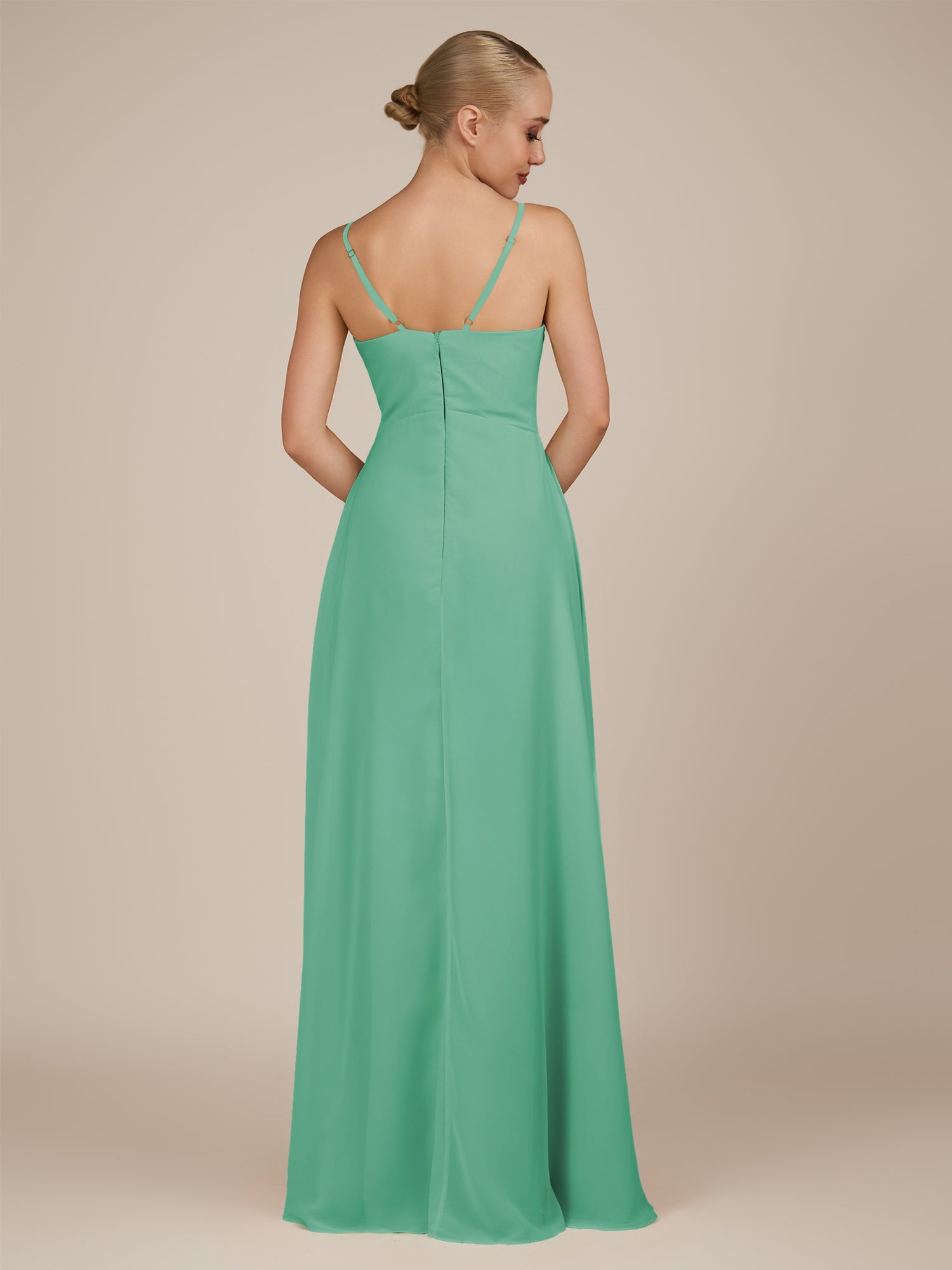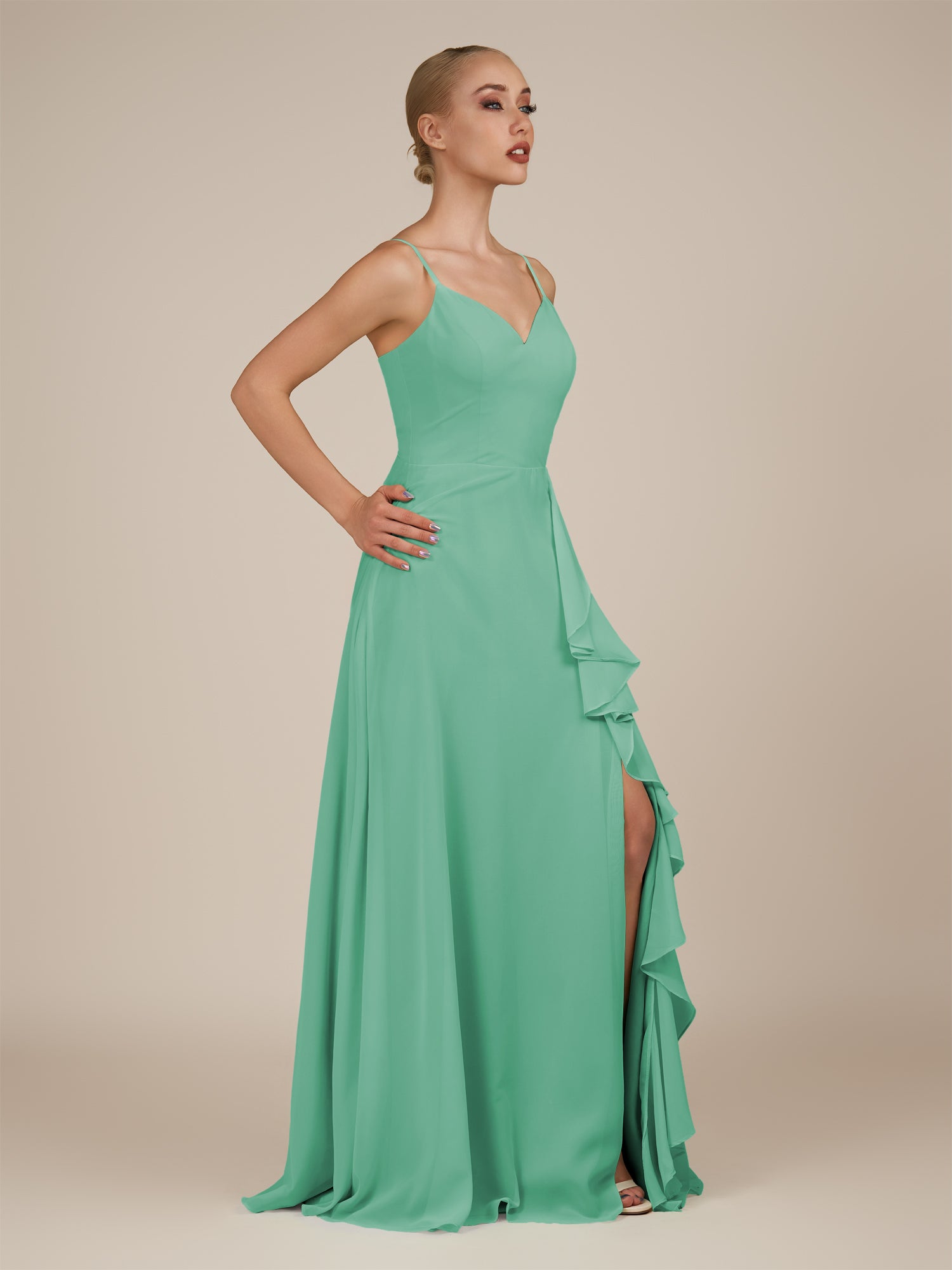Rhonda is a graceful and stylish choice for your bridal party. Crafted from soft chiffon, she features a flattering V-neckline and a sleeveless bodice for a modern, elegant look. Her floor-length skirt flows beautifully with every step, accented by delicate ruffles and a subtle side slit for added movement and charm. Finished with a smooth zipper back, Rhonda combines timeless sophistication with contemporary style, perfect for weddings and special occasions.
